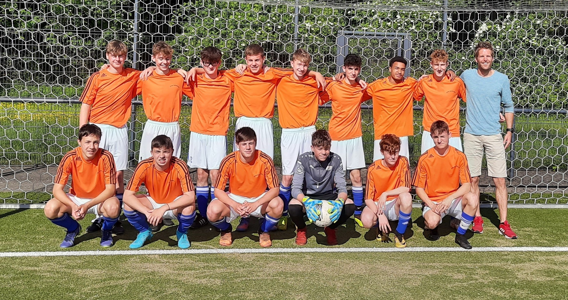 Ohne einige verletzungsbedingte Ausfälle trat die Mannschaft am Tag des mündlichen Abiturs den Weg nach Frechen an, um dort den Einzug in die Finalrunde des Regierungsbezirks zu schaffen. Trotz des unterrichtsfreien Tages zögerten die Jungs keine Sekunde, die lange Reise zur Bezirkshauptrunde anzutreten. Angeführt von Spielführer Ben Winter traf man im ersten Match auf die Realschule Frechen. In einer hart umkämpften, aber stets fairen Partie erwies sich die Heimmannschaft als der erwartet schwere Gegner. Mit dem nötigen Spielglück und dank des goldenen Treffers von Torgarant Frederik Brück-Thies gelang mit dem 1:0-Erfolg ein Auftakt nach Maß. Aus terminlichen Gründen absolvierte man im unmittelbaren Anschluss die zweite Partie gegen den Gewinner des Kreises Düren, das Gymnasium Haus Overbach. Bei sommerlichen Temperaturen merkte man den Spielern die Strapazen aus dem ersten Spiel an. Der Gegner war feldüberlegen und erarbeitete sich zu Beginn eine aussichtsreiche Gelegenheit nach der anderen. Nichtsdestotrotz hielt die Schleidener Defensive um das Abwehrbollwerk Nils Weimbs und Magnus Heinen tapfer und diszipliniert dagegen. Bedanken konnte man sich zu diesem Zeitpunkt zudem bei dem souverän aufspielenden und ein ums andere Mal überragend parierenden Torwart Jasper Claßen. Kurz vor der Halbzeitpause nutzte wiederum Goalgetter Brück-Thies eine der wenigen sich bietenden Torchancen und netzte nach einem schnell ausgeführten Freistoß von Adrian Beul zur überraschenden Halbzeitführung ein. Kurz nach dem Seitenwechsel erspielte man sich über Aaron Mertens zwei riesengroße Gelegenheiten, die aber nicht verwertet werden konnten. Es kam, wie es kommen musste. Nach dem offensiven Strohfeuer baute der frischer wirkende und körperlich starke Gegner immer wieder Druck auf und konnte diesen schließlich auch in zwei Tore ummünzen. Das Aufbäumen in den verbleibenden Schlussminuten wurde nicht belohnt. Mit dem Schlusspfiff strich ein letzter Weitschuss knapp am gegnerischen Kasten vorbei ins Toraus. Da die Realschule Frechen im abschließenden Spiel das Gymnasium Haus Overbach mit 3:0 besiegte, hätte der Ausgleichstreffer für den Einzug in die nächste Runde genügt. So müssen wir uns leider, aber mit erhobenem Haupt, aus dem diesjährigen Schulsportfest verabschieden und drücken Frechen im Kampf um den Einzug in die Endrunde der Landesmeisterschaft die Daumen.