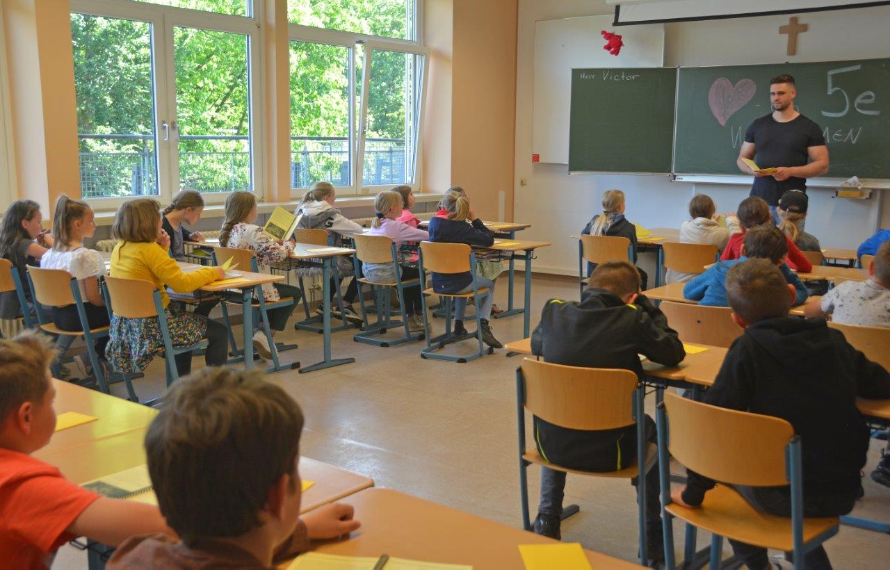 Lehrer Johannes Victor und Erprobungsstufenkoordinatorin der Realschule, Kerstin Scheuer-Karsch, fungierten als neue KlassenlehrerInnen der beiden kommenden 5er-Klassen, sorgten für ein erstes Kennenlernen im Klassenzimmer und  schenkten den SchülerInnen einen CFS-Schulplaner, der sie über das gesamte Schuljahr begleiten wird.