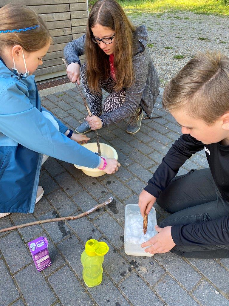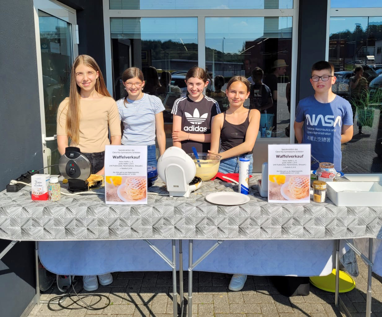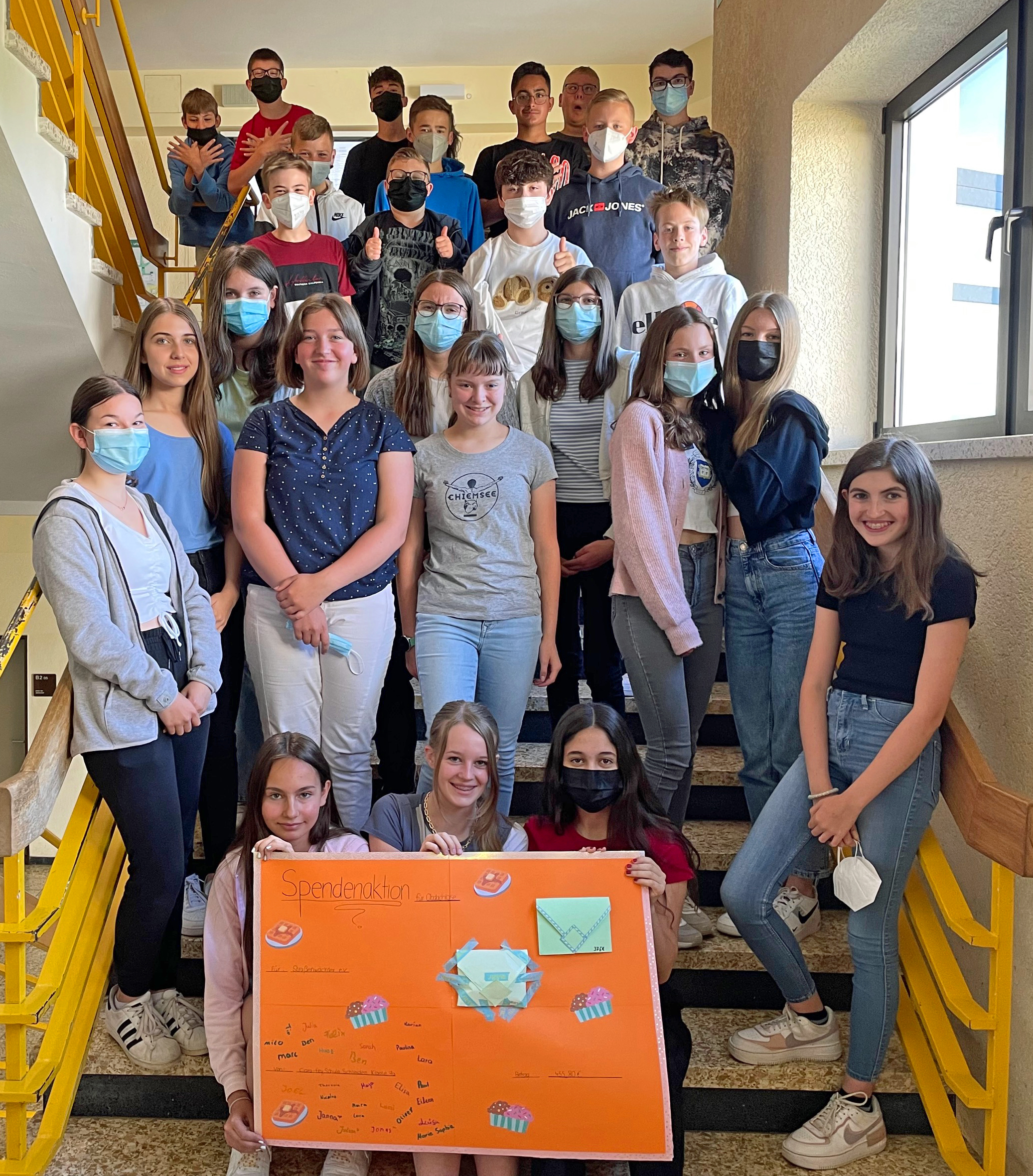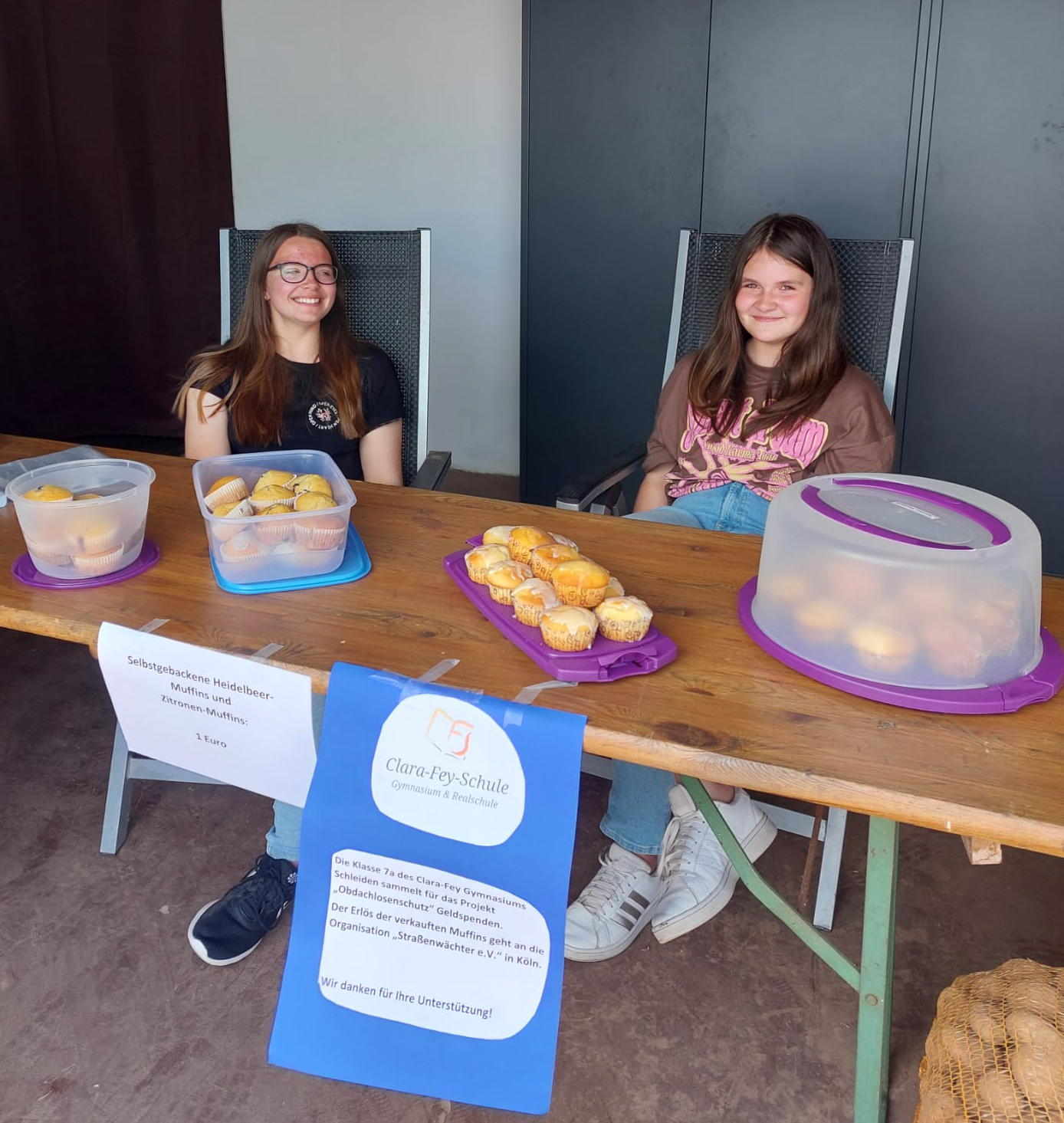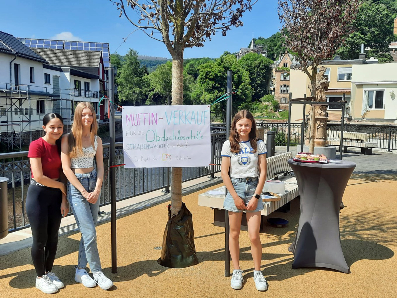 Die Klasse 7a startete im Religionsunterricht zum Thema „Schöpfung“ mit Frau Shvelidze ein Projekt. Durch den Verkauf von selbstgemachtem Gebäck wollte sie Obdachlose unterstützen. Dabei entschieden sich die Schüler*innen für die Organisation Straßenwächter e.V. in Köln. Das ist eine ehrenamtliche Organisation, die obdachlose Menschen versorgt, indem sie Lebensmittel, Kleidung, Decken und Hygieneartikel verteilt. Manchmal erfüllen die Straßenwächter den Obdachlosen sogar persönliche Wünsche oder schenken ihnen einen Termin beim Friseur. In ihrer Geschäftsstelle in der Balduinstraße können sich die Obdachlosen jederzeit in einer Art Café kostenlose Kleidung sowie Essen und Trinken mitnehmen oder vor Ort verzehren. Die Klasse teilte sich für die Spendenaktion in Gruppen auf. Alle Gruppen verkauften an verschiedenen Standorten selbstgebackene Muffins oder Waffeln. Zum Beispiel vor dem Hofladen Stoffels in Düttling, vor dem Edeka Engels in Heimbach oder in Gemünd am Nepomukplatz. Die Kunden freuten sich sehr über die selbstgebackenen Leckereien und manche spendeten sogar freiwillig, auch ohne etwas zu bestellen, Geld. Insgesamt nahm die Klasse 455,80 € ein - den Betrag brachten sie anschließend nach Köln zu den Straßenwächtern.