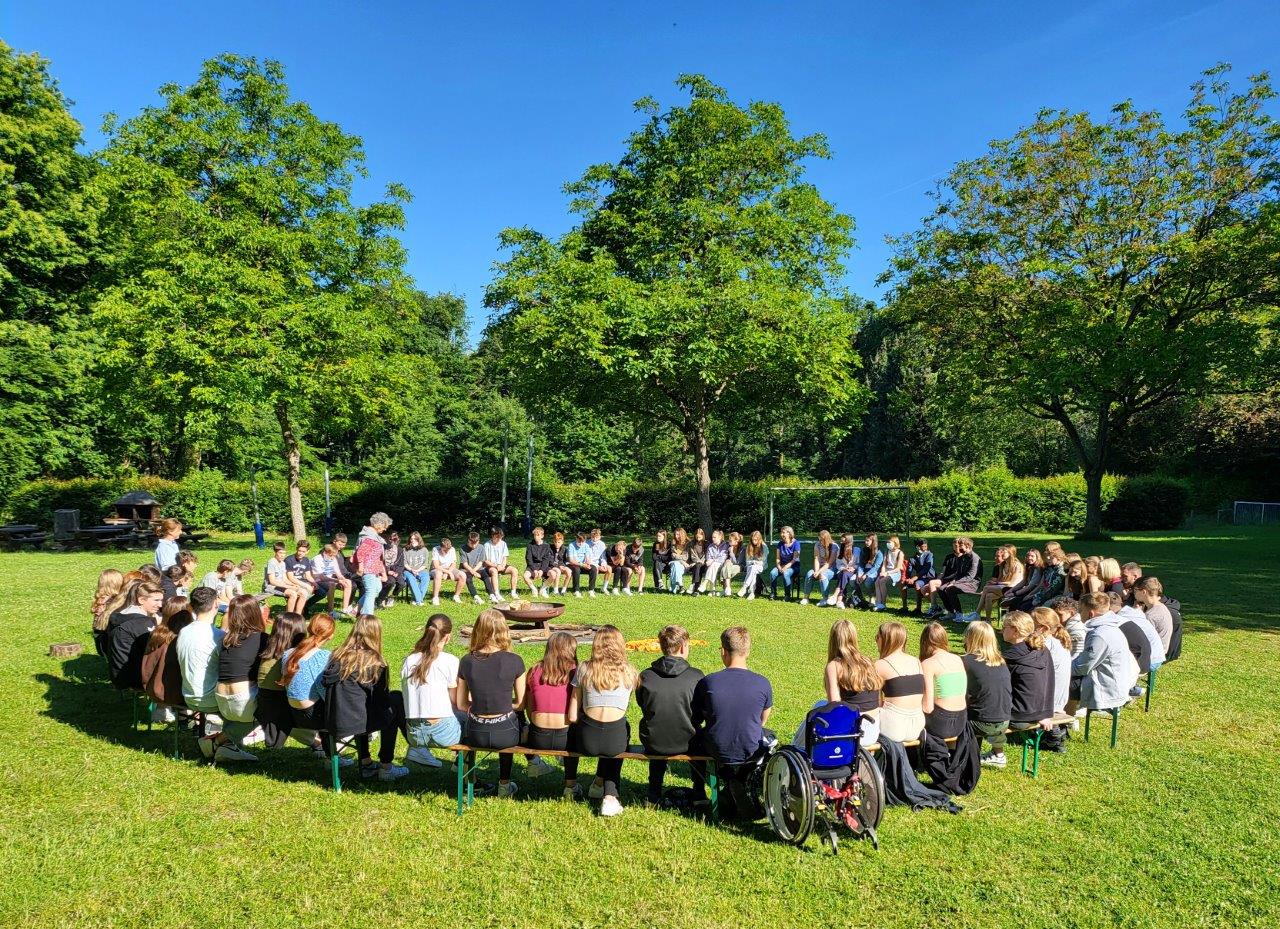 Nach langwierigen coronabedingten Einschränkungen konnten die Orientierungstage nun endlich wieder stattfinden! Vom 13. bis 15. Juni fuhren die drei Klassen mit ihren Klassen- und Religionslehrer*innen ins Haus am Venusberg in Bonn, das sich in jeder Hinsicht (Sauberkeit, Raumangebot, Essen, Service) als vorbildlich erwies. Dort konnte man in Kleingruppen über die eigene Person, über Werte, Wichtiges und Unwichtiges im eigenen Leben reflektieren und ins Gespräch kommen. Gemeinschaftsstärkende Spiele und Aktionen wechselten mit der Fixierung gegenseitiger Wertschätzung innerhalb der Klasse. Während eines langen Waldspaziergangs im das Haus umgebenden Kottenforst schrieben sich Schüler*innen einen Brief an sich selbst, der Gedanken enthielt, die man aus den Orientierungstagen mitnehmen wollte in den Schulalltag. Morgen- und Abendimpulse jeweils nach dem Frühstück bzw. Abendessen sowie der Abschluss-Gottesdienst fanden bei schönstem Wetter in großer Runde im Freien statt und bereicherten die Gruppengespräche um den religiösen Rahmen.