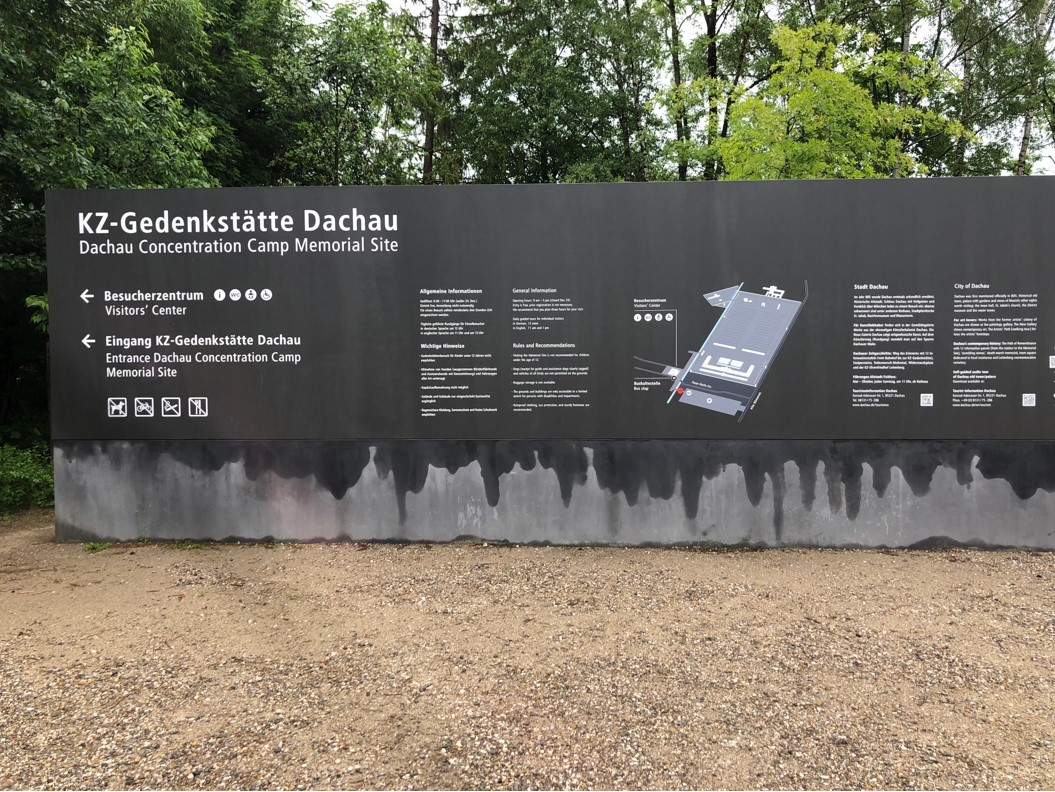 Als wir schließlich ankamen waren und ausstiegen, machte sich eine Art Spannung in mir breit. Zunächst kamen wir an einer Steintafel vorbei, welche uns den Weg zum Besucherzentrum der heutigen Gedenkstätte Dachau aufzeigte. Nun machten wir uns auf den Weg zum Besucherzentrum, auf dem vielen ihre Anspannung anzumerken war. Andere versuchten durch „Witze“ wiederum ihre Anspannung zu überspielen. Schließlich trafen wir unseren Guide, der uns die nächsten zwei Stunden durch die Gedenkstätte führte.