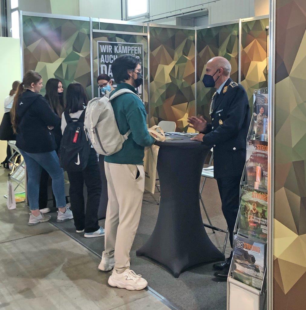 „Außerdem war ich bei dem Stand der Bundeswehr, um mich über ein (Medizin)Studium in der Laufbahn eines Offiziers zu informieren. Dort sollte ich derjenige sein, der die Fragen stellt und auch nur dann habe ich Antworten erhalten. Da ich gut vorbereitet war, hatte ich keine Probleme und erhielt detaillierte Informationen zu einem Studium innerhalb der Offizierslaufbahn. Nach dem Abitur kann ich es mir gut vorstellen, ein Studium bei der Bundeswehr durchzuführen. Natürlich nur, wenn ich auch angenommen werde.“