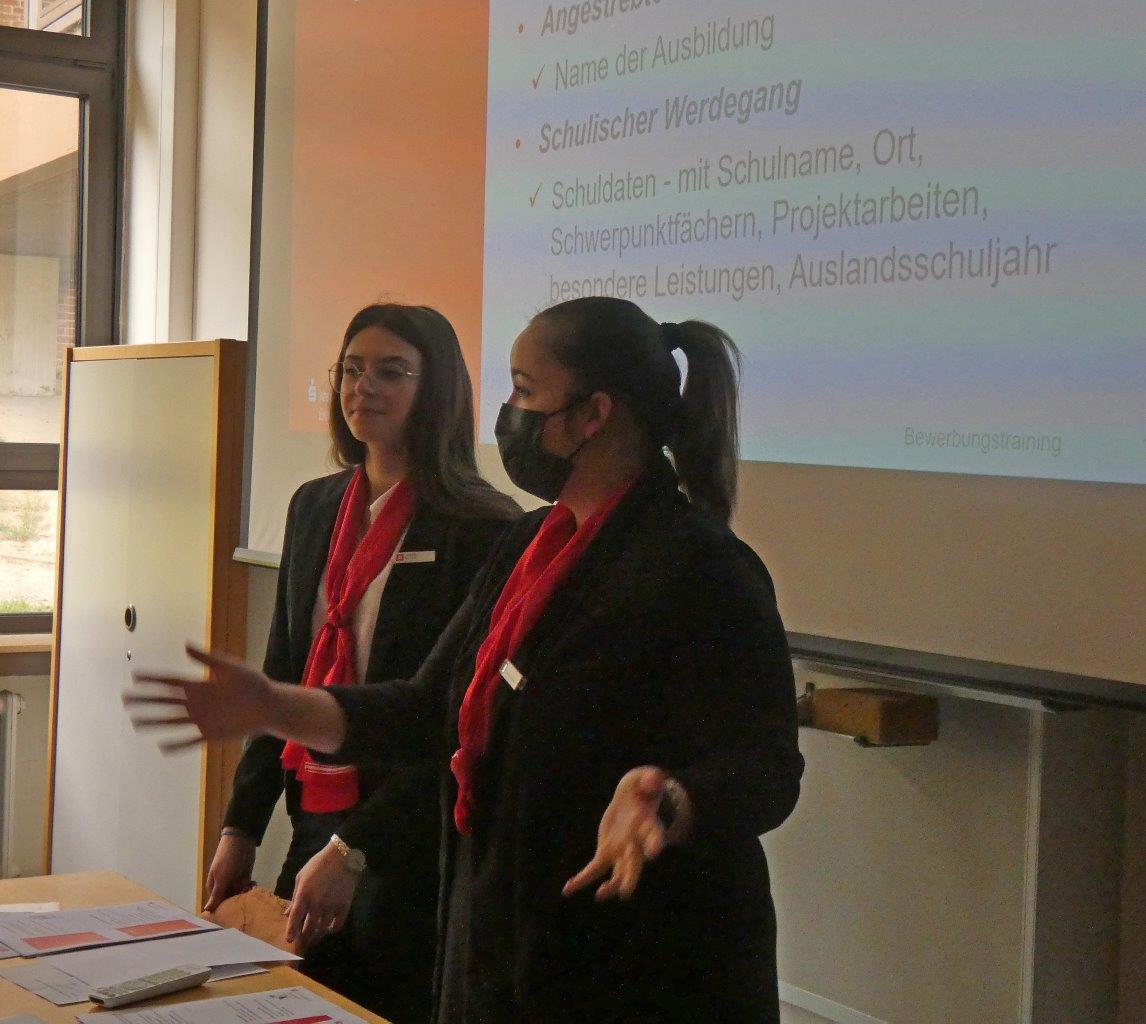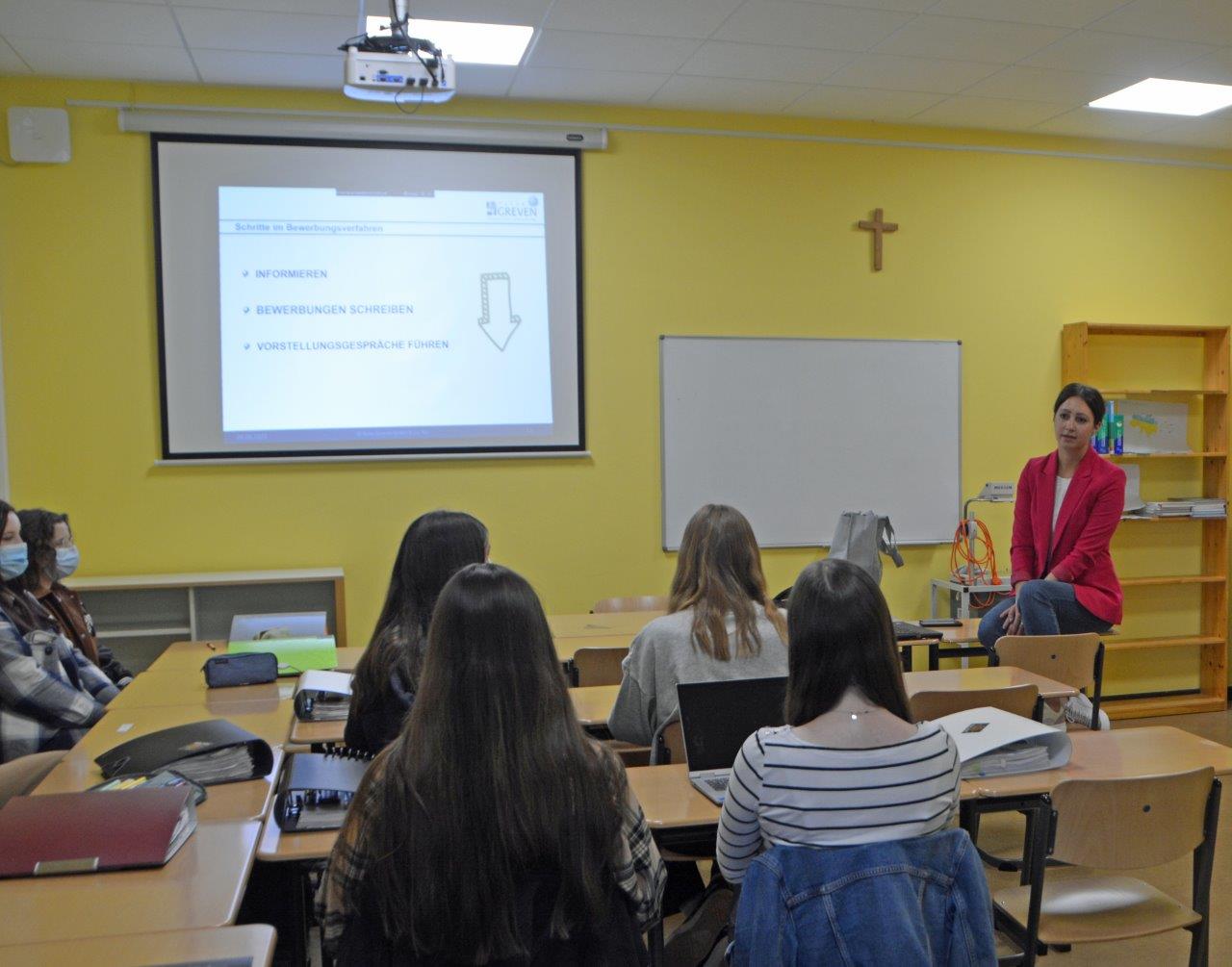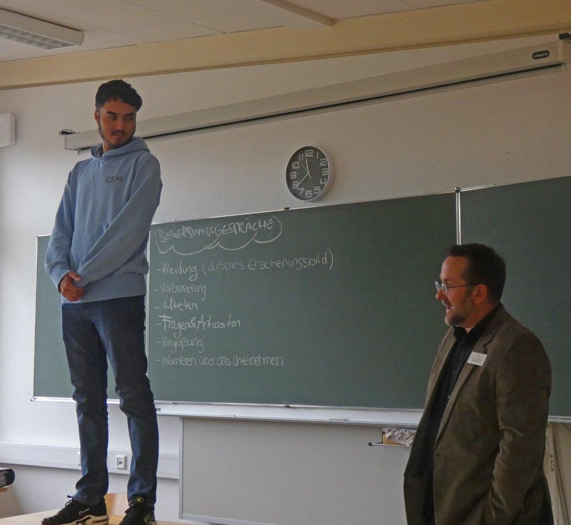 Eingebettet in verschiedene praxisnahe Übungen und Rollenspiele erfuhren die Schülerinnen und Schüler, mit welchen Fragen und Themen sie bei einem Vorstellungsgespräch zu rechnen haben. Auch das Thema „Kleidung“ sowie die Beachtung von Werten wie Pünktlichkeit wurden thematisiert.