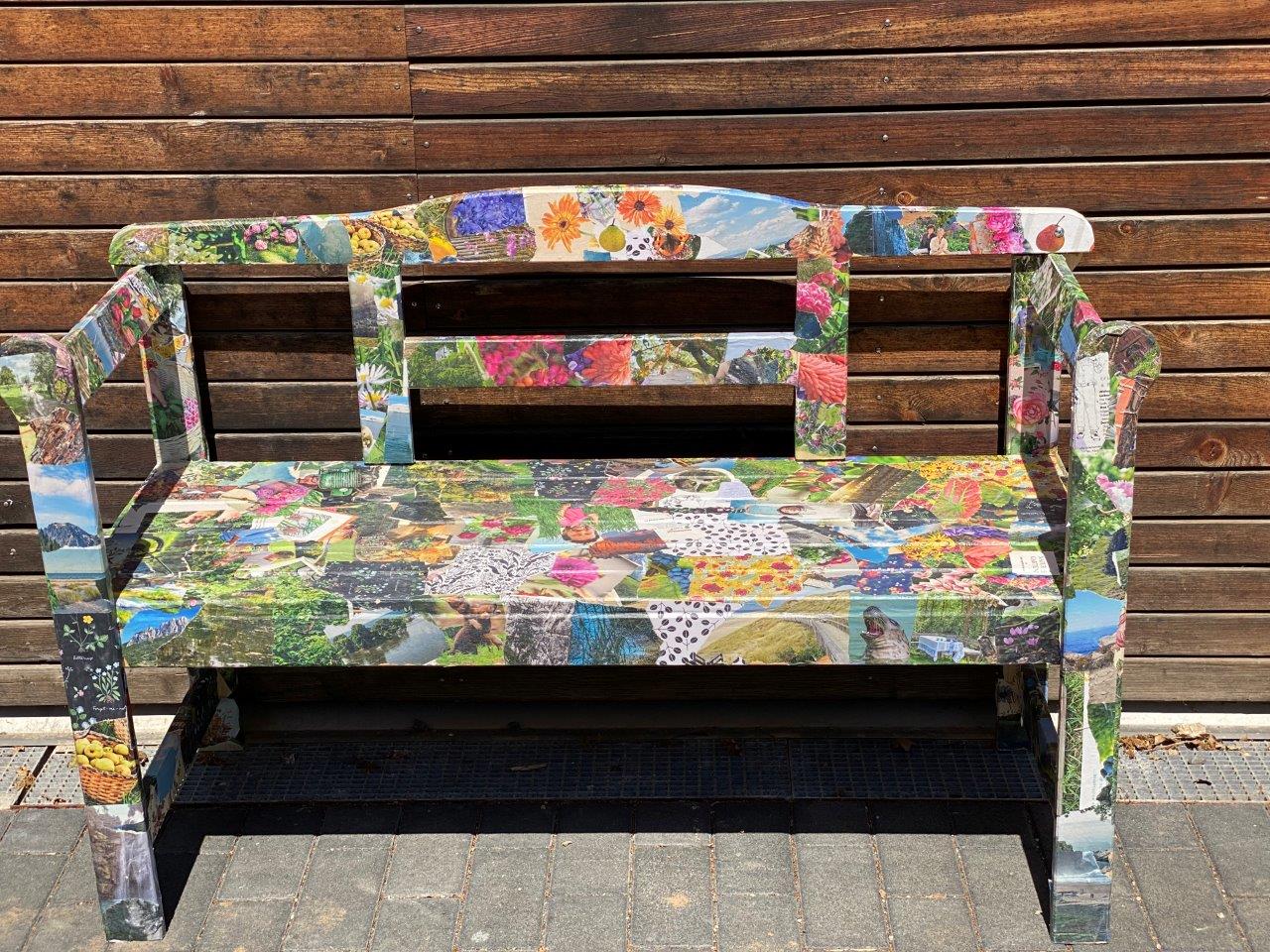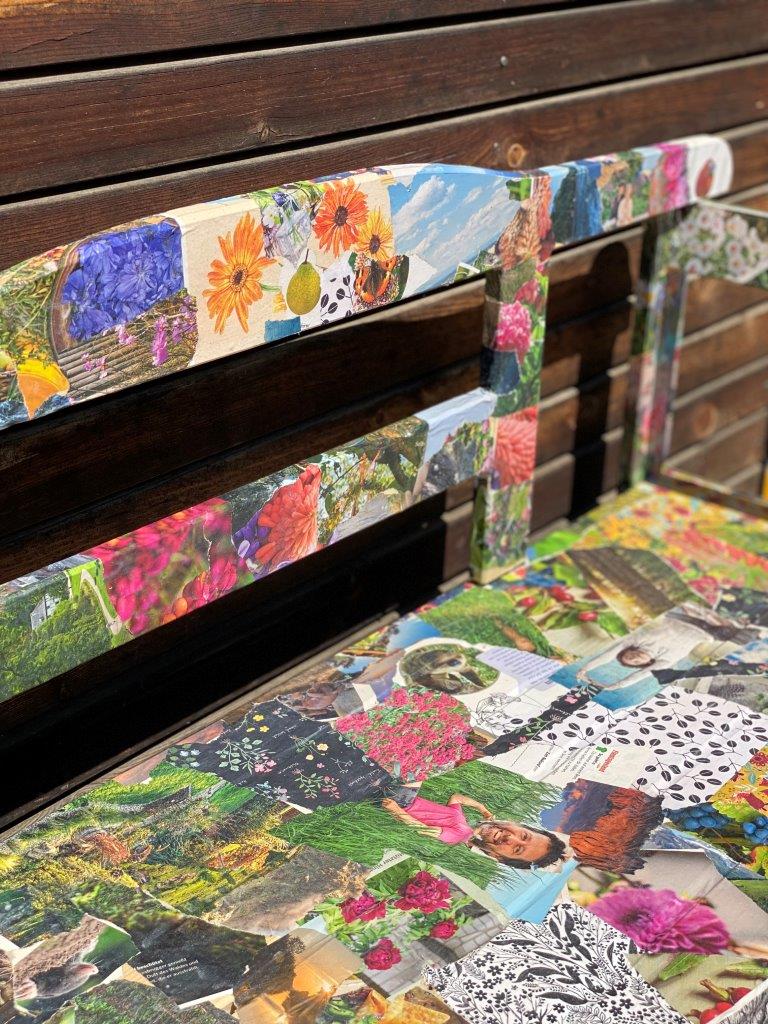 Nun lädt diese liebevoll gestaltete Bank nach getaner Arbeit auf dem bereits üppig blühenden Schulacker der CFS hoffentlich zum Verweilen ein.