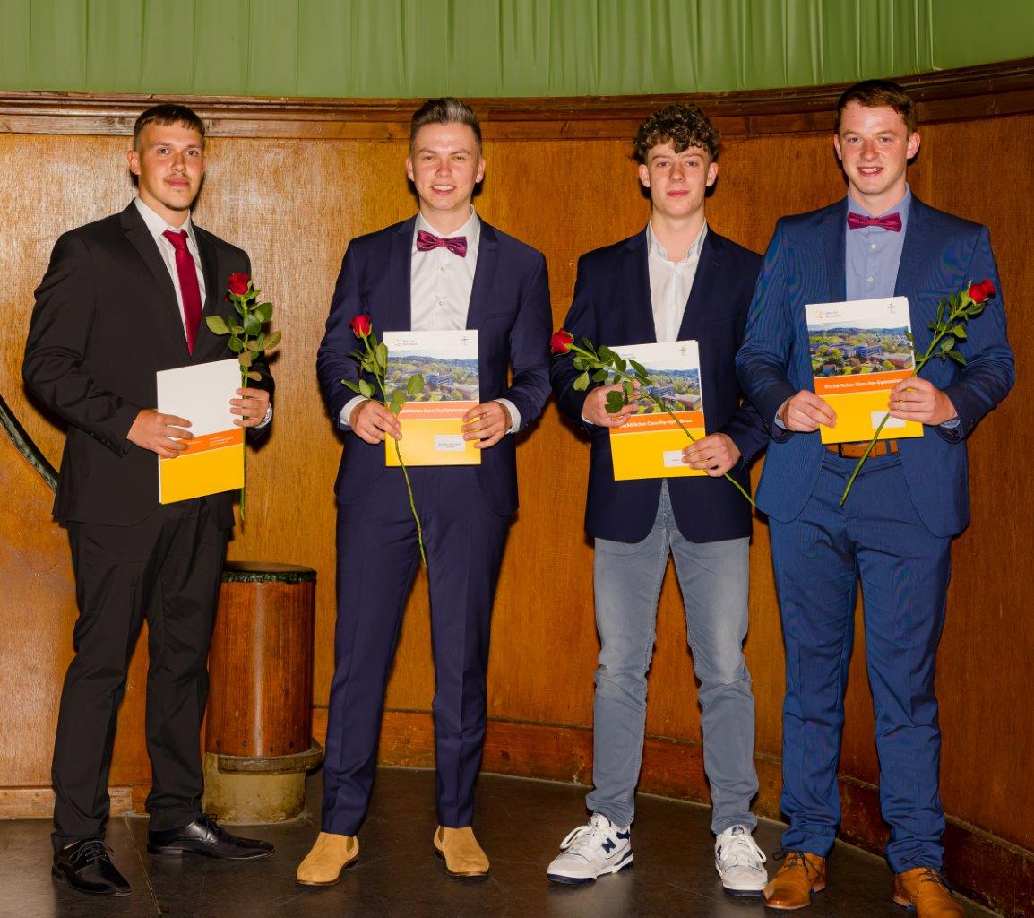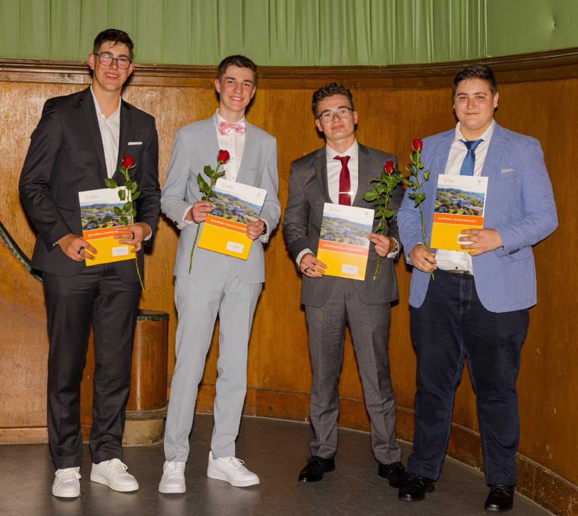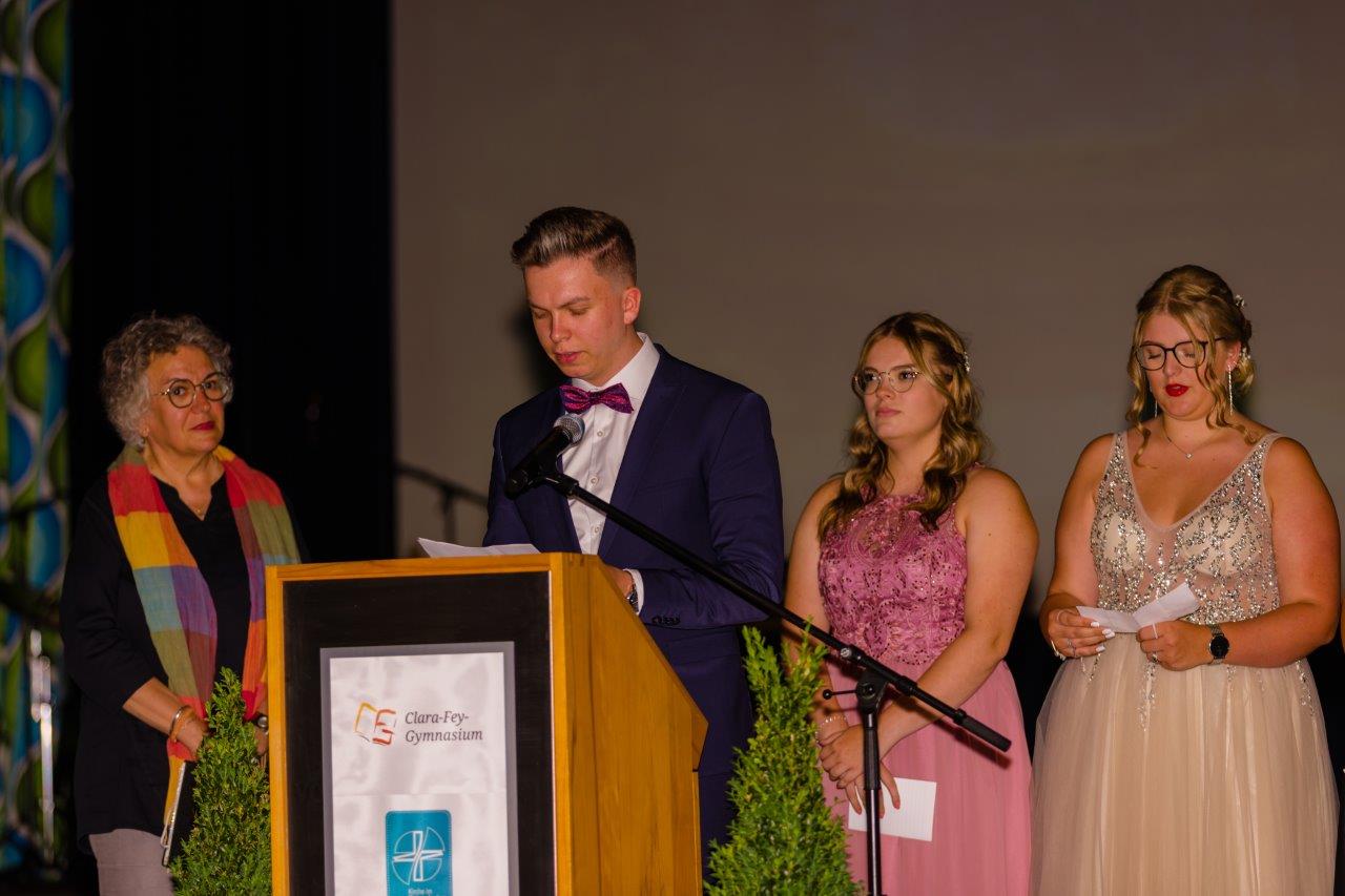 Am Samstag, dem 18. Juni 2022, wurden am Clara-Fey-Gymnasium in Schleiden die diesjährigen Abiturientinnen und Abiturienten feierlich entlassen. Mit dem Titel “Stand by me” wurde die nachmittägliche Feier im voll besetzten Kinosaal in Vogelsang musikalisch eingeleitet, bevor Schulleiterin Roswitha Schütt-Gerhards die Anwesenden begrüßte. Im Anschluss zelebrierte der Schleidener Pfarrer Philipp Cuck, assistiert von seinem evangelischen Kollegen Pfarrer Erik Schumacher, die Abiturmesse. Mit Bezug auf das Motto des Gottesdienstes, „angekommen – unterwegs“, beleuchtete Schulseelsorgerin Astrid Sistig in ihrer Predigt die derzeitige Lebenssituation der Abiturientinnen und Abiturienten. Die Messe und der anschließende Festakt wurden begleitet durch eine Band der Abiturientia mit Janna Wollgarten und Maike Jansen als Sängerinnen, Niklas Toporowsky am E-Piano, Jonas Heid als Gitarrist, Christian Pütz am Schlagzeug und Stufenleiter René Robers am Bass.