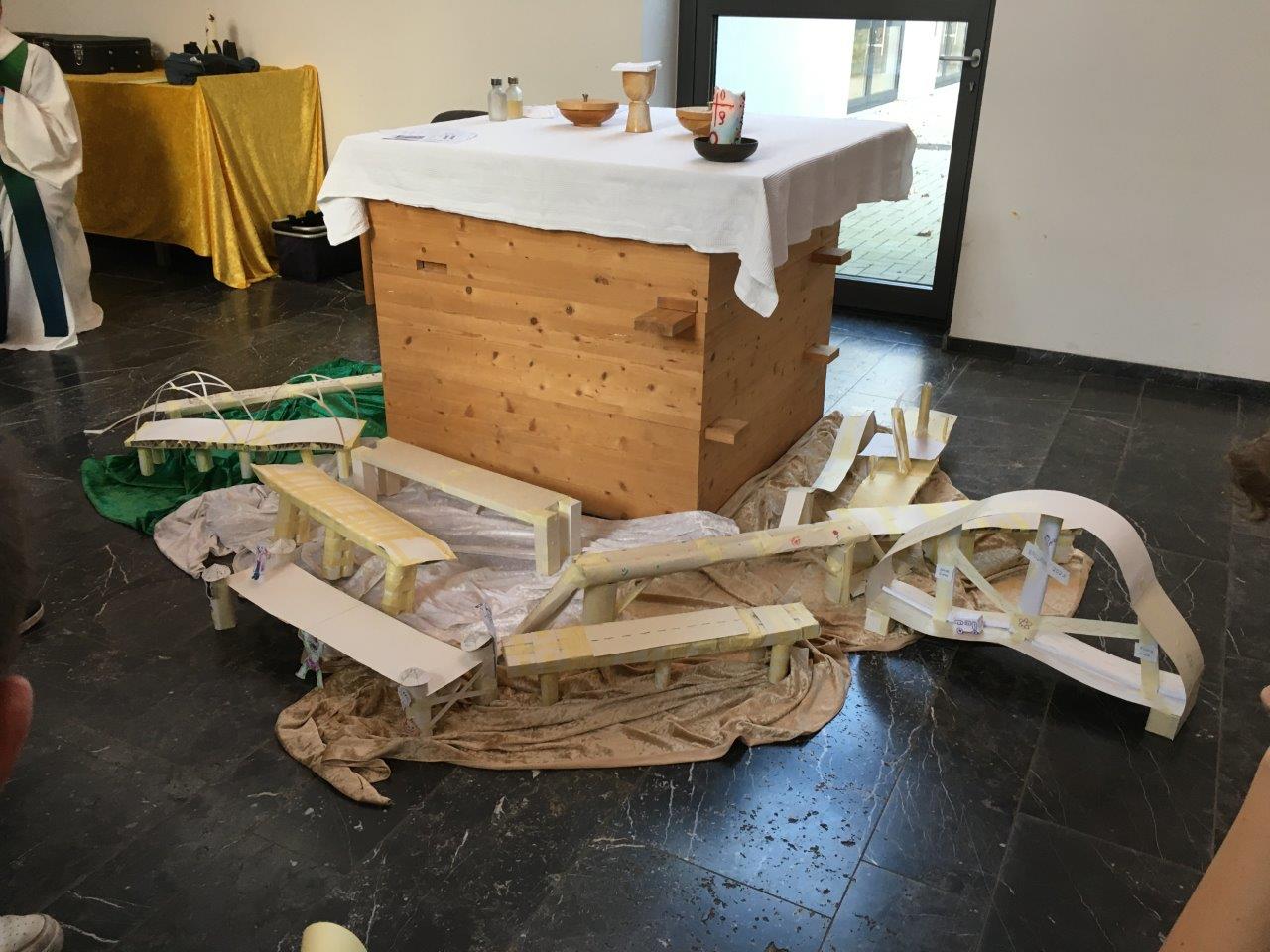 Am nächsten Morgen gab es erneut eine Gruppenphase. Hier ging es nun den ganzen Tag darum, gemeinsam eine Brücke zu bauen. Wir waren frei in der Gestaltung bzw. der Konstruktion der Brücke. Am Ende musste die Brücke in der Mitte eine Schere tragen. Es war sehr interessant am Ende die Ergebnisse der Gruppen und die unterschiedlichen Herangehensweisen zu erfahren. Am Ende des Tages wurde gemeinsam entschieden, welche der Brücken nachher im Gottesdienst verwendet wurde.