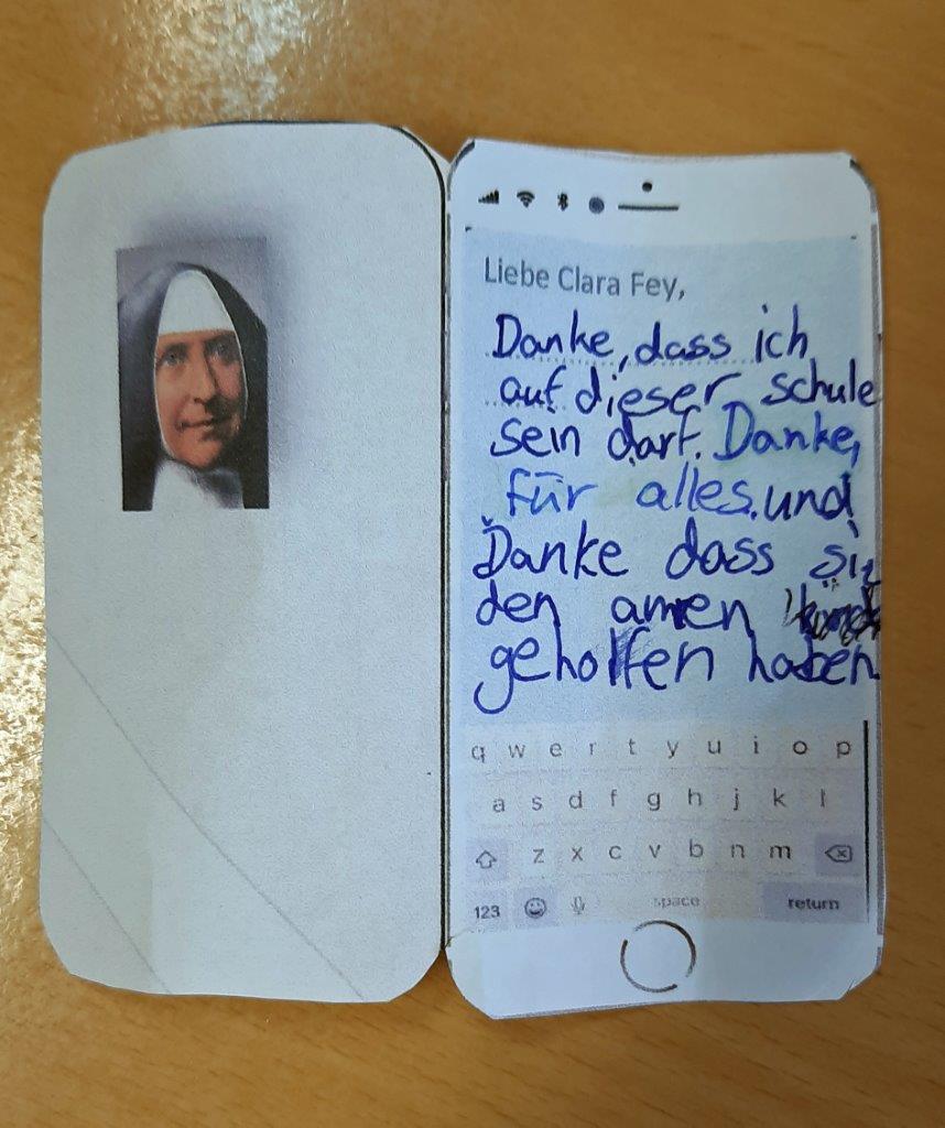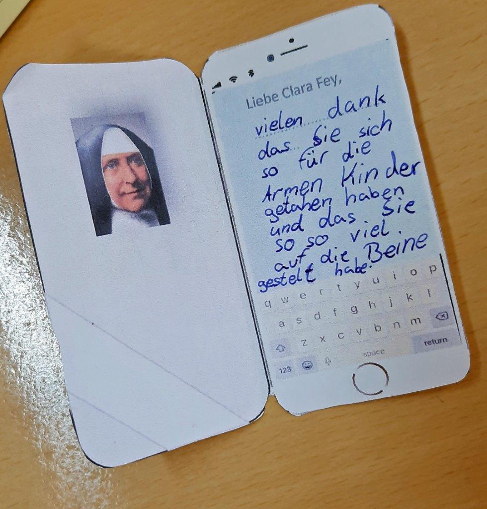 Schließlich wurden alle eingeladen, sich in einer kurzen Nachricht in Form einer SMS oder WA an Clara Fey zu richten. Dieser Einladung folgend, drückten sie Clara Fey ihren Dank, ihren Respekt und auch ihre Bewunderung aus für Claras Fähigkeit, die Not der Kinder zu sehen und für ihren Mut, durch ihr Handeln den Kindern zu helfen.