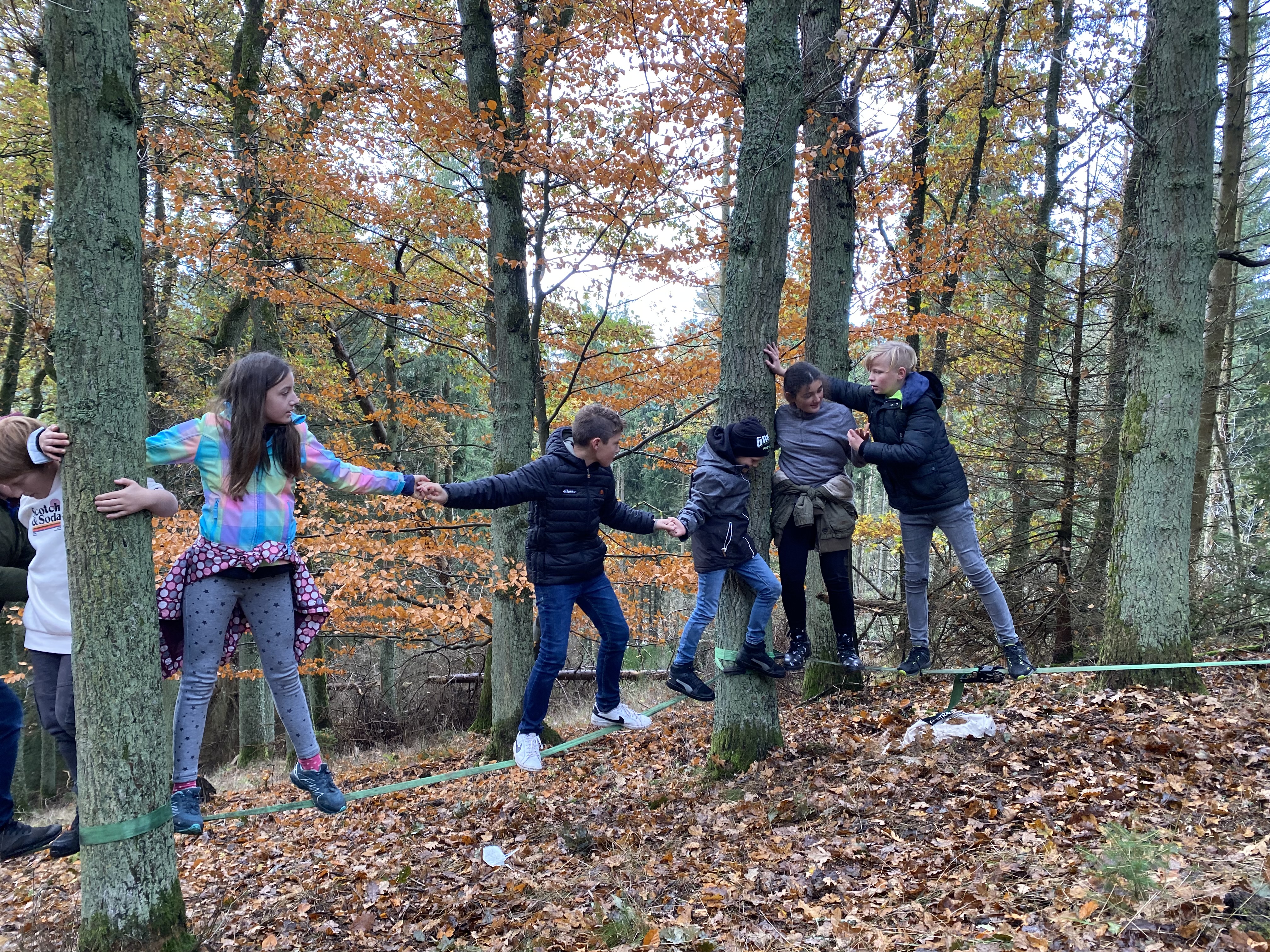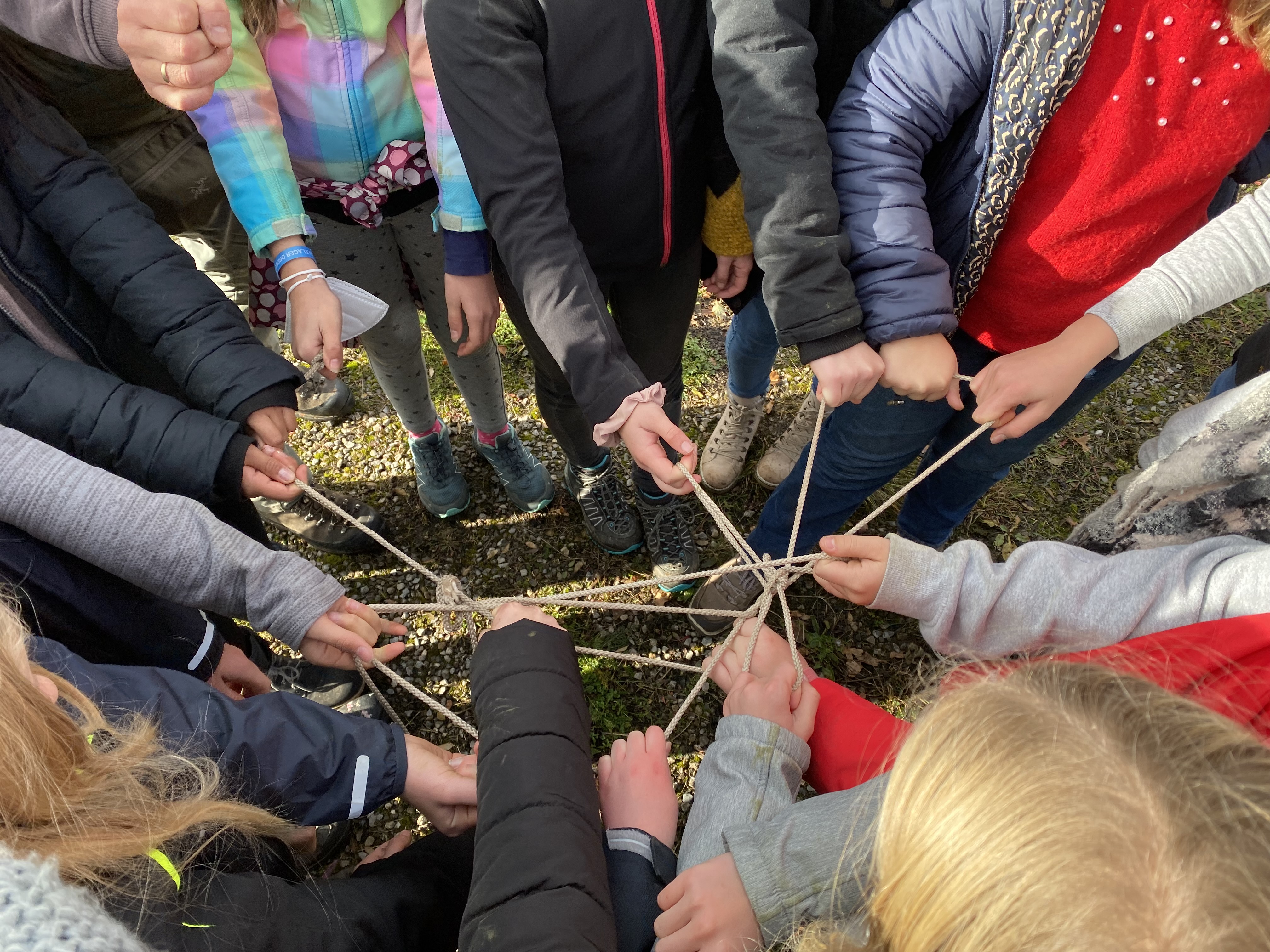 Wir sind erstmal alle in den Klassenraum gekommen und haben unsere Tische zu zwei langen Tafeln geschoben für unser großes gemeinsames Frühstück. Jeder hatte etwas mittgebracht und so war alles vorhanden. Wir haben uns alle satt gegessen und danach ein paar Spiele gespielt. Um neun Uhr haben wir uns dann auf den Weg nach oben zum Wald gemacht, wo Herr Müller auf uns gewartet hat. Dort oben haben wir dann einen Sitzkreis gebildet. Da hat dann Herr Müller uns den groben Tagesplan erklärt, aber noch nicht zu viel verraten. Er hat auch etwas von sich erzählt und wir durften etwas von uns erzählen. Nachdem jeder etwas erzählt hatte, sollten wir uns zu zweit zusammentun und jedes Paar hat eine Augenbinde bekommen. Er hat uns erklärt, dass Vertrauen für eine Gemeinschaft sehr wichtig ist und dass wir zunächst in Zweiergruppen mit der Augenbinde den Partner durch den Wald führen sollten. Bei einer anderen Aufgabe mussten wir lernen zusammenzuarbeiten. Diese Aufgabe war kniffelig und hat sehr viel Spaß gemacht. Jeder musste Jedem helfen, egal ob man befreundet ist oder nicht. Das hat mir besonders gut gefallen.