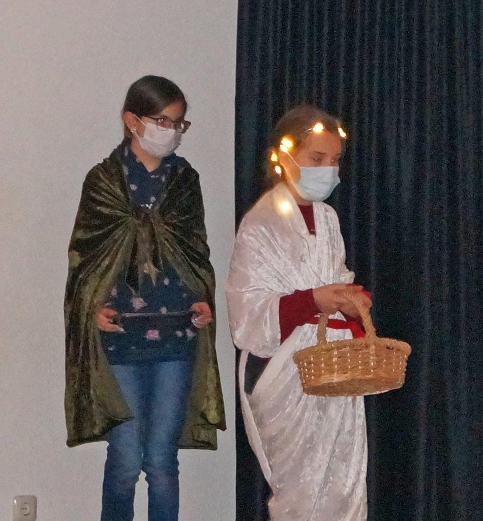 Die Klasse 5f bereitete den Gottesdienst mit ihrem Religionslehrer Herrn Richterich vor. In einem Adventsspiel stellten die Jungen und Mädchen das Leben der Lucia vor. Vor ca. 1700 Jahren wurde Lucia in Syrakus, auf der Insel Sizilien, geboren. Ihre Eltern waren reich und hatten schon früh eine Truhe mit kostbaren Dingen gefüllt, um sie ihrer Tochter zur Hochzeit zu überreichen. Lucia liebte es, wenn ihre Mutter ihr aus der Bibel vorlas. Je älter sie wurde, umso mehr verspürte sie den Wunsch, so zu leben wie Jesus. Sie wollte sich um Arme und Bedürftige kümmern und verkaufte die Schätze ihrer Eltern, auch ihre schönen Kleider wollte sie nicht mehr tragen. Nur einen roten Gürtel, den ihre Mutter für sie gemacht hatte, trug sie als einzigen Schmuck.