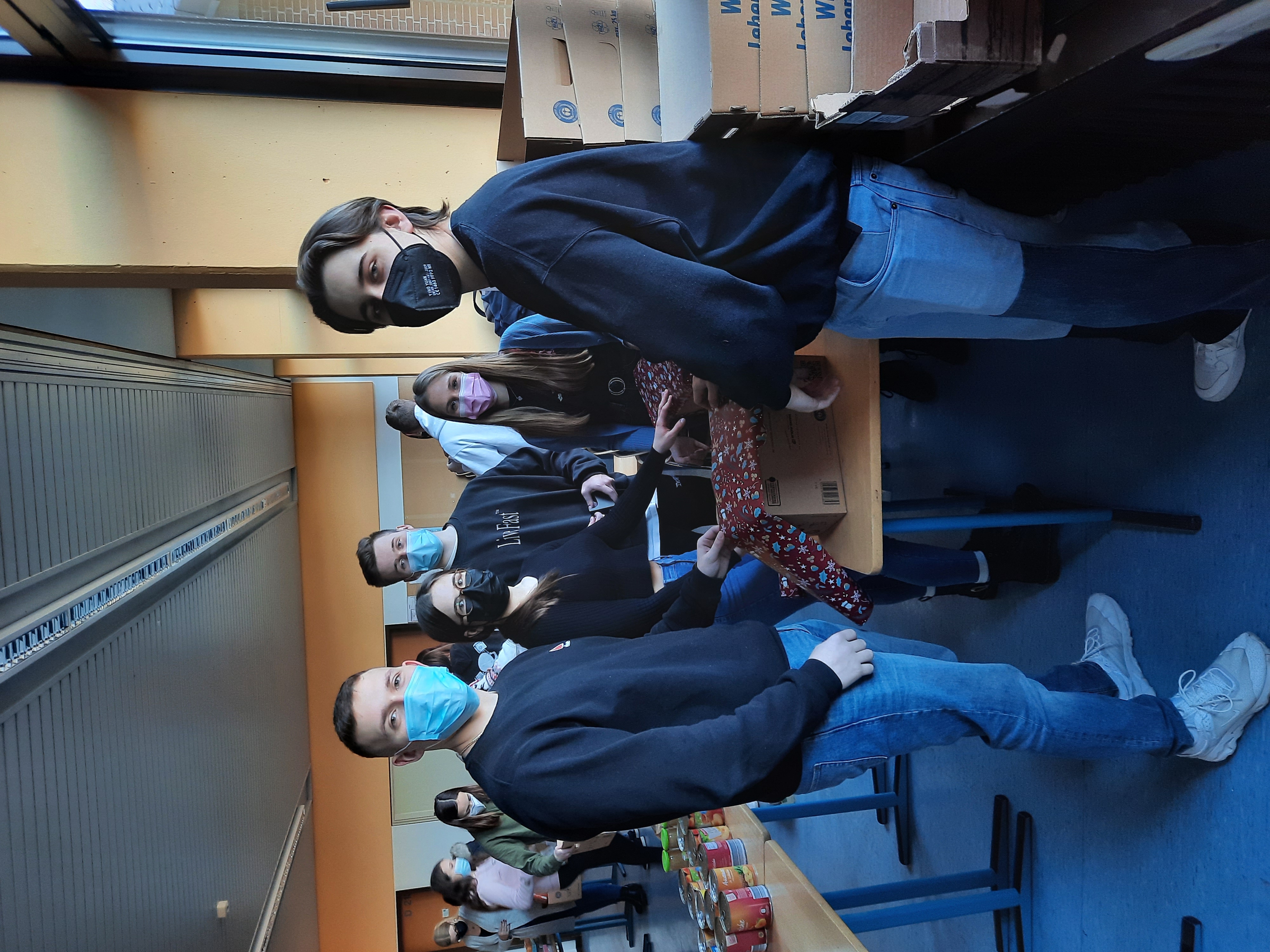 Fleißige HelferInnen des Pädagogik-Leistungskurses aus der Q2 sorgten dann dafür, die Kisten mit Weihnachtspapier zu dekorieren, aus den gespendeten Lebensmitteln Weihnachtskisten mit den Zutaten für ein leckeres Weihnachtsessen zu packen oder Weihnachtsgrüße zu schreiben, die in jede Kiste kamen.