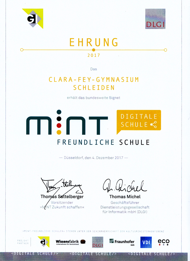 Im Dezember wurde das CFG in einer Feier in Düsseldorf als MINT-freundliche Schule mit dem Erweiterungszertifikat „Digitale Schule“ geehrt. Insgesamt 21 der 106 geehrten Schulen NRWs bekamen dieses zusätzliche Gütesiegel, welches einem breit gefächerten Kriterienkatalog hinsichtlich der Digitalisierung unterliegt.