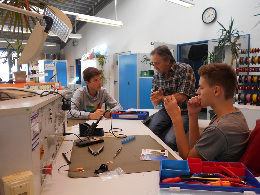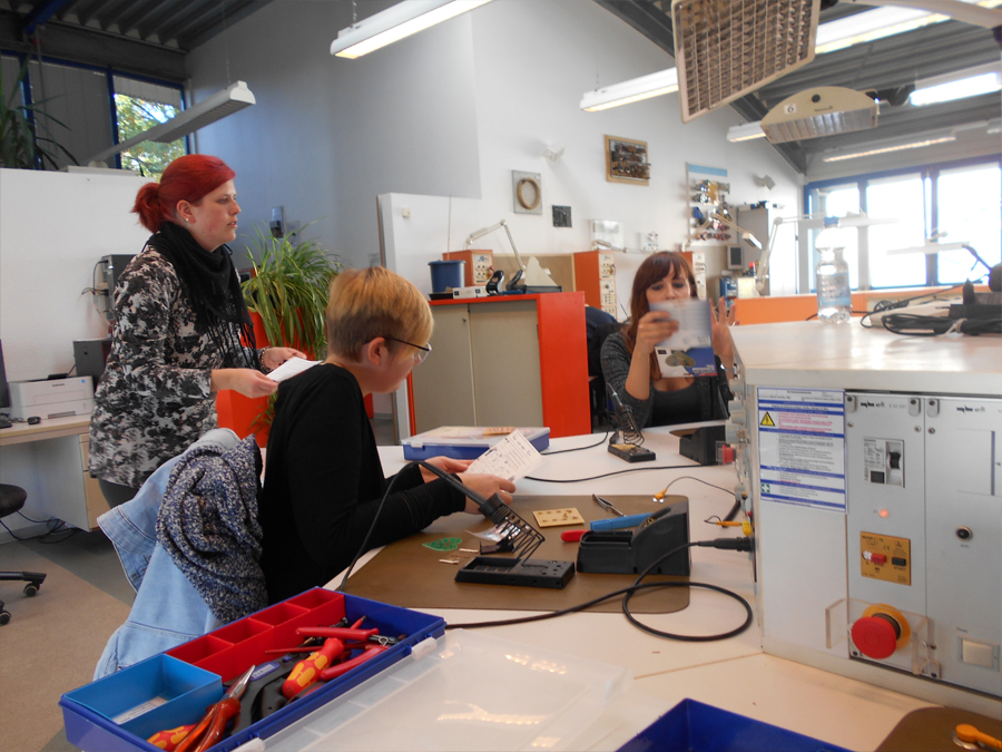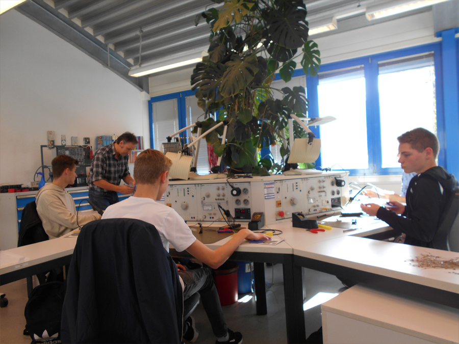 Rund 10 interessierte Schülerinnen und Schüler aus der Jahrgangsstufe 9 und EF fuhren zu einem Workshop an die RWTH-Aachen zum Thema Technik. In Aachen angekommen wurden wir von einem Ausbilder freundlich empfangen. Zuerst haben wir eine Einführung zur Handhabung des Lötkolbens bekommen. Danach führten wir zunächst einige leichtere Übungen zum Löten durch. Wir steckten die Anfangsbuchstaben unserer Namen mit Widerständen in eine Platine und löteten diese von der anderen Seite der Platine fest. Nach dieser letzten Übung begannen wir mit dem eigentlichen Projekt „Blinkendes Herz“. Dazu bekamen wir eine Packung, in der sich eine herzförmige Platine, mehrere LEDs und einige Wiederstände befanden. Der Ausbilder, der uns an dem Tag betreute, erklärte uns immer Stück für Stück, was wir machen sollten. Dies machte viel Spaß, da diese Aufgabe viel Fingerspitzengefühl erforderte. Falls man Fragen hatte, konnte man einfach die Betreuer fragen und man bekam auch sofort eine verständliche Antwort.