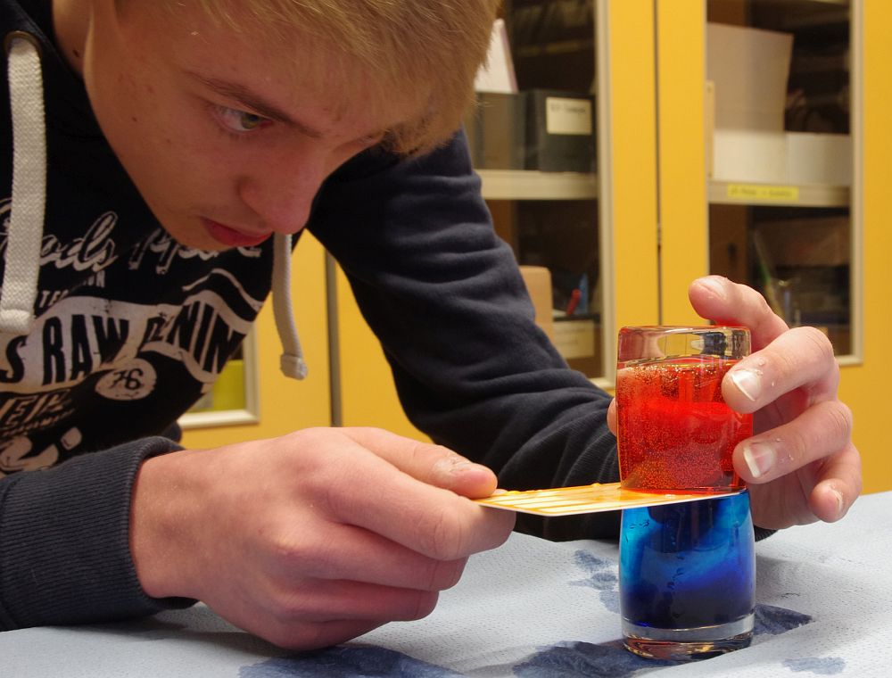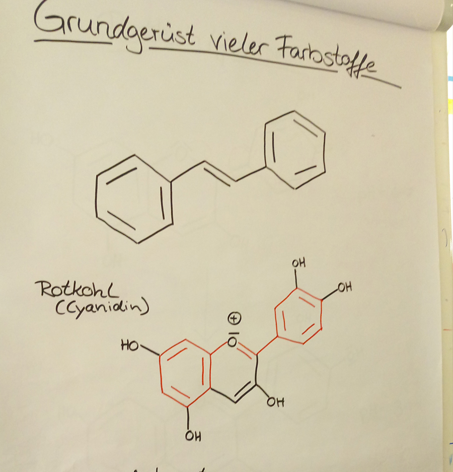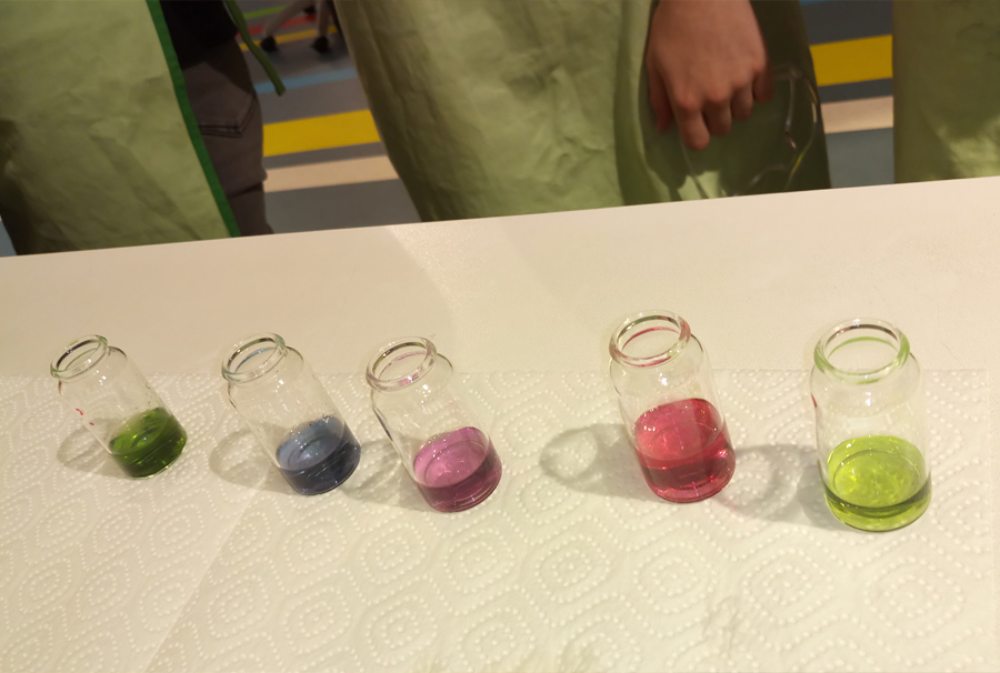 Zuerst beschäftigten wir uns mit der Theorie zu Farbstoffen, die teilweise einige physikalische und chemische Grundlagen enthielt. Wir durften auch viel praktisch arbeiten. Bei einem der Experimente versetzten wir Rotkohlsaft mit verschiedenen sauren und alkalischen Lösungen. Dabei beobachteten wir unterschiedliche Farbreaktionen. Auch haben wir kennengelernt, wie man eine unbekannte Farbprobe analysieren kann.