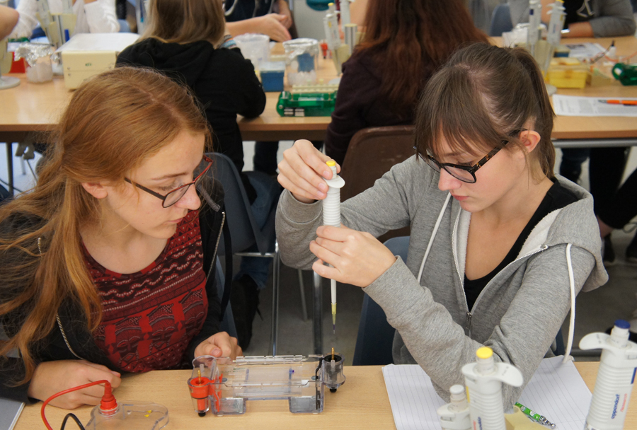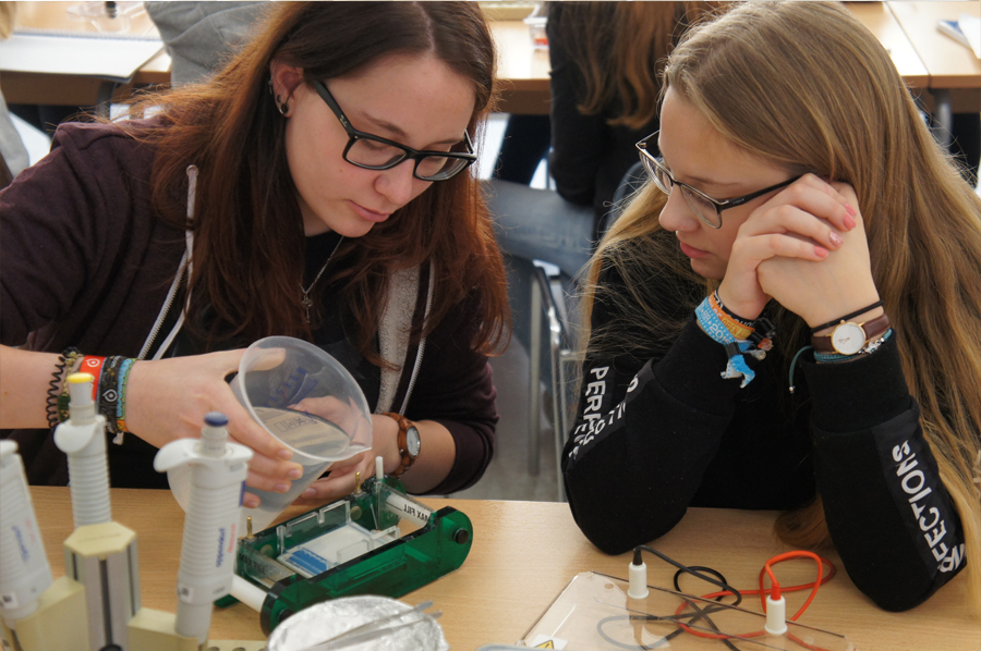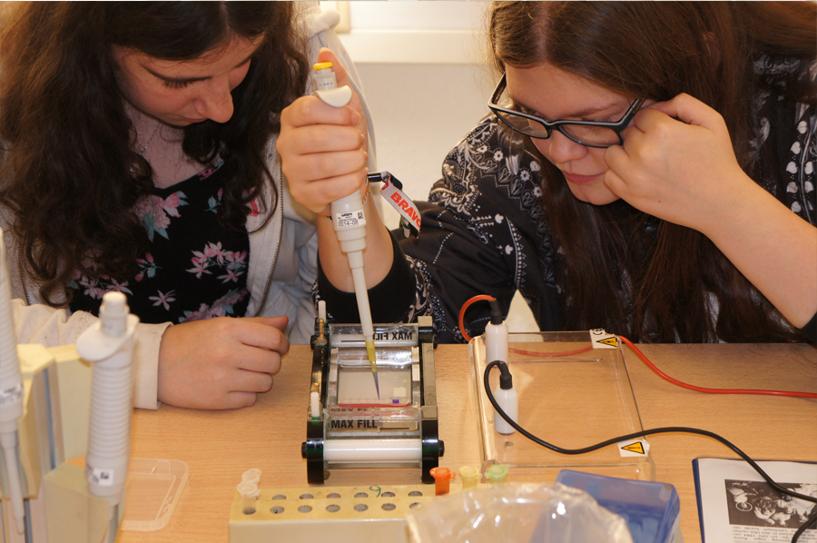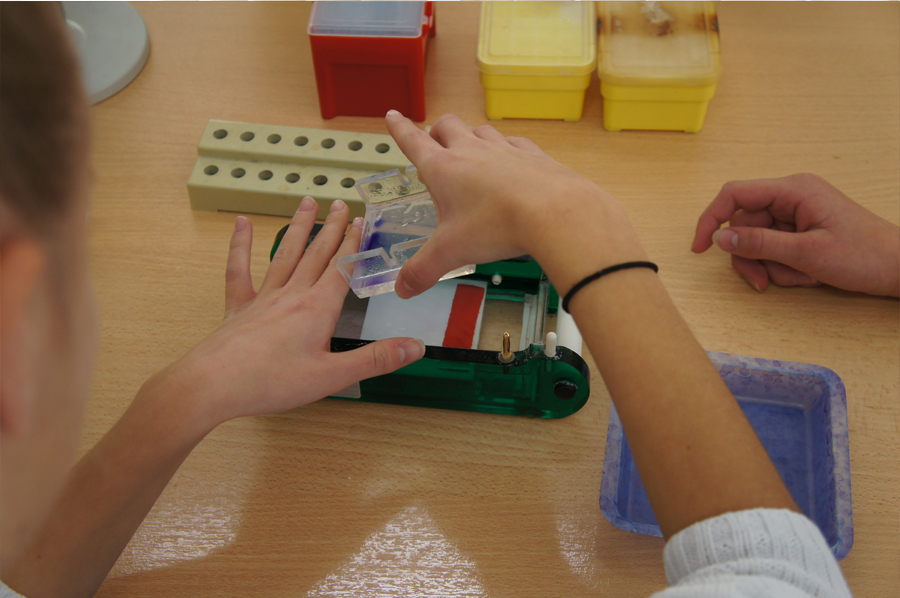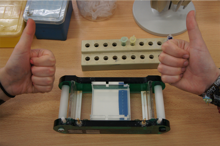 Anfangs bekamen wir grundlegende Handgriffe zum Pipettieren beigebracht. Wir sollten verschiedene Mengen Wasser von einem in ein anderes Gefäß einbrachten. Dann ging es mit dem eigentlichen Thema los: „Wer war Anna Anderson?“ Nach Meinung von Anna Anderson hielt sie sich selbst wohl für die Tochter des russischen Zaren Nikolaus. Um nun mit Hilfe der Genetik die Abstammung zu prüfen, stellten wir zunächst ein Gel her, in das wir einen Kamm steckten, damit nachher Vertiefungen vorgefertigt sind, in die Genproben eingebracht werden konnten.