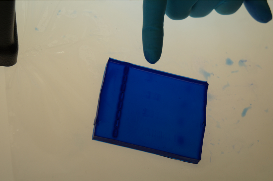 Anschließend legten wir das Gel in ein Schiffchen ein, das bis zu einer Markierung mit Wasser gefüllt und eine Gleichspannungsquelle angeschlossen war.