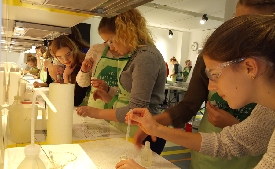 Am Mint-Tag besuchten 25 Schülerinnen und Schüler aus der Jahrgangsstufe 9 und EF das Deutsche Museum in Bonn, um mehr zu Farben, Farbstoffen und in einem zweiten Workshop zu Kosmetik kennen zu lernen. Das Deutsche Museum verfügt über eine Laborküche, in der Schülerinnen und Schüler zu verschiedenen Themen Experimente durchführen können.