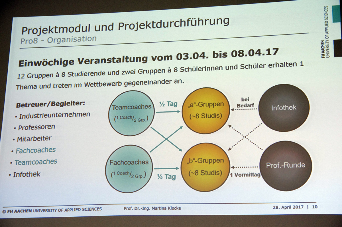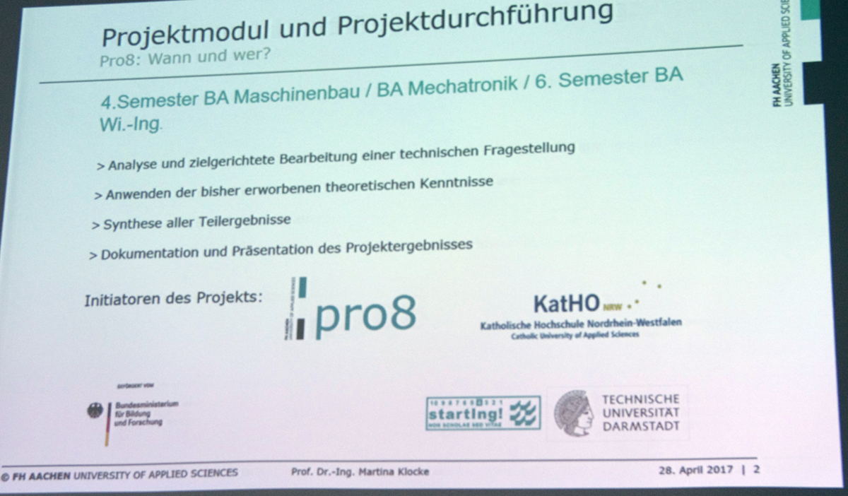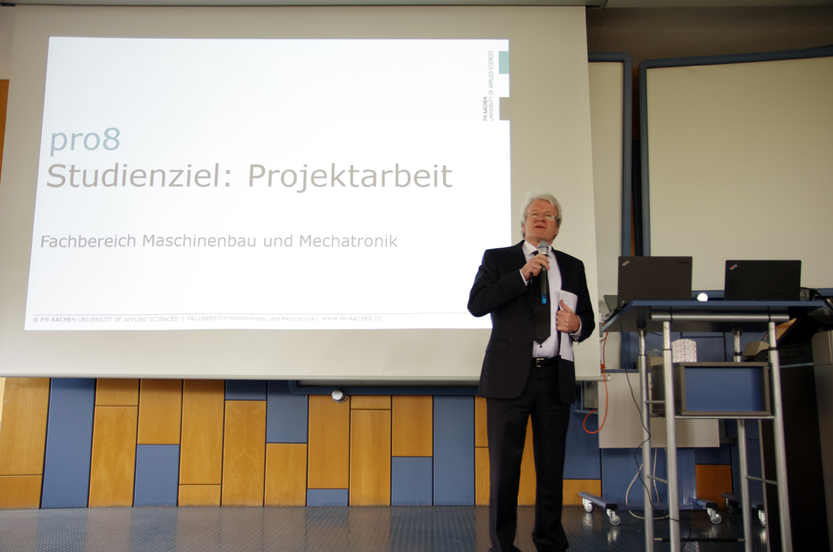 Pro8 ist eine Projektwoche vor den Osterferien, in dem sich Studenten des Fachbereiches 8 an der FH-Aachen, nämlich Maschinenbau, und Oberstufenschüler aus verschiedenen Schulen zusammenfinden, um ein reale industrielle Aufgabenstellung innerhalb einer Woche in untereinander konkurrierenden Teams zu lösen.