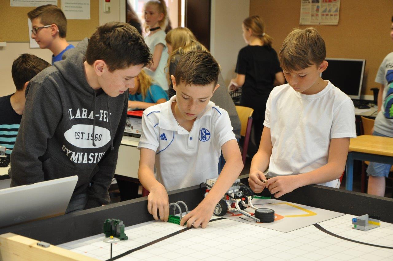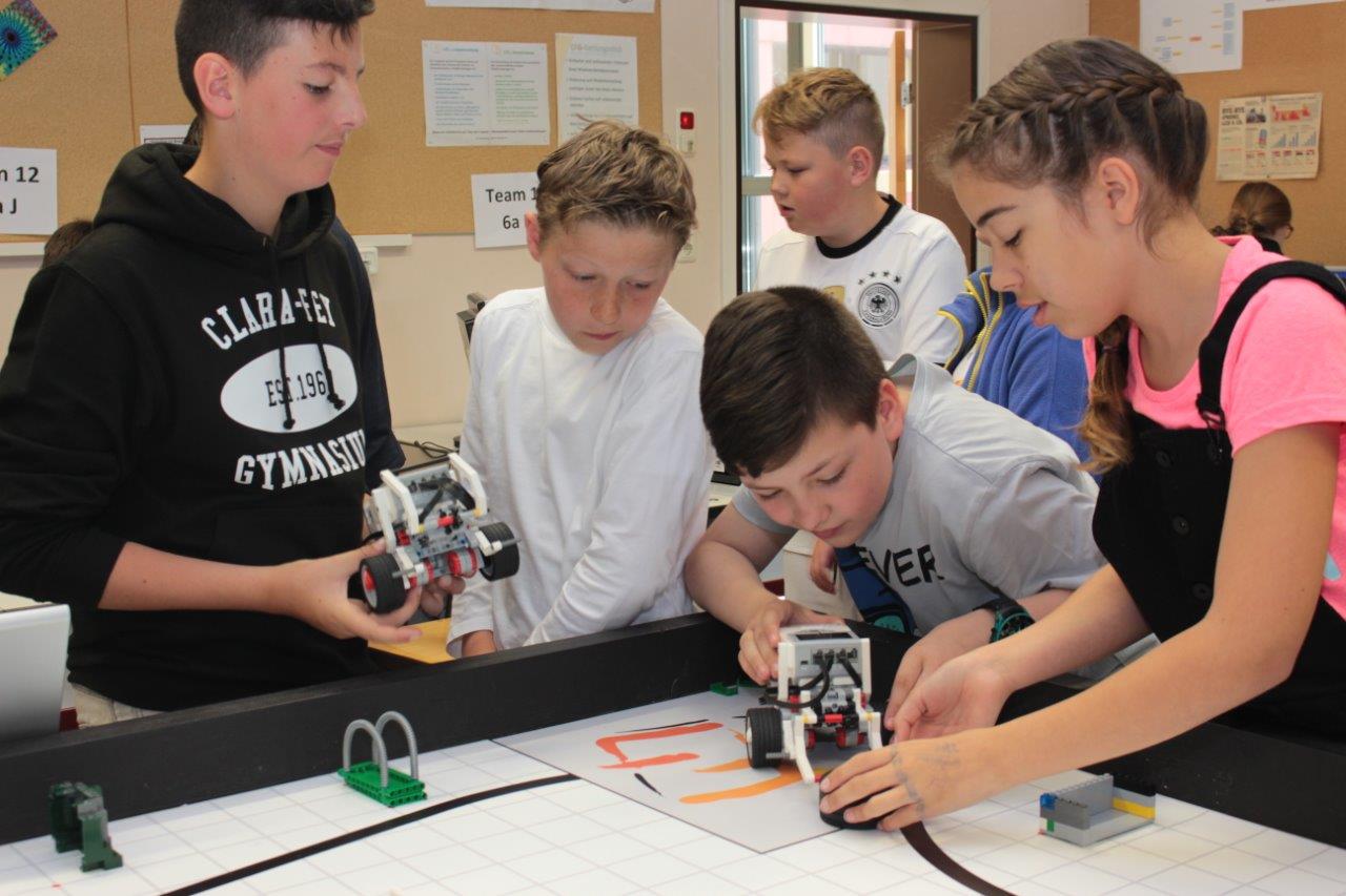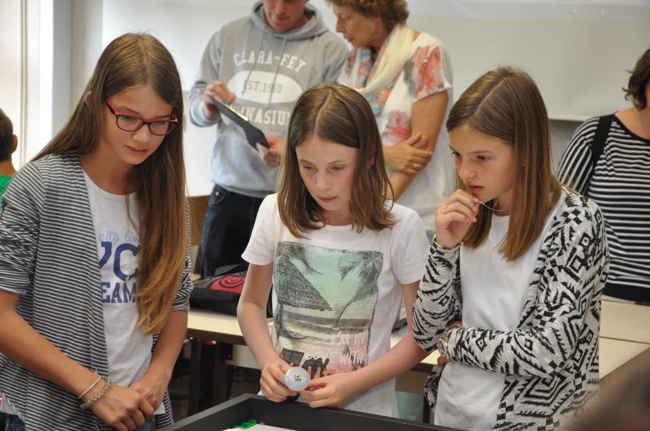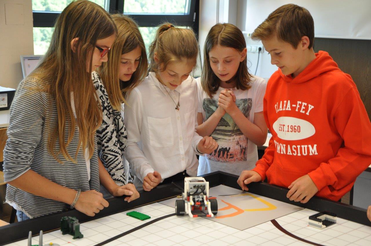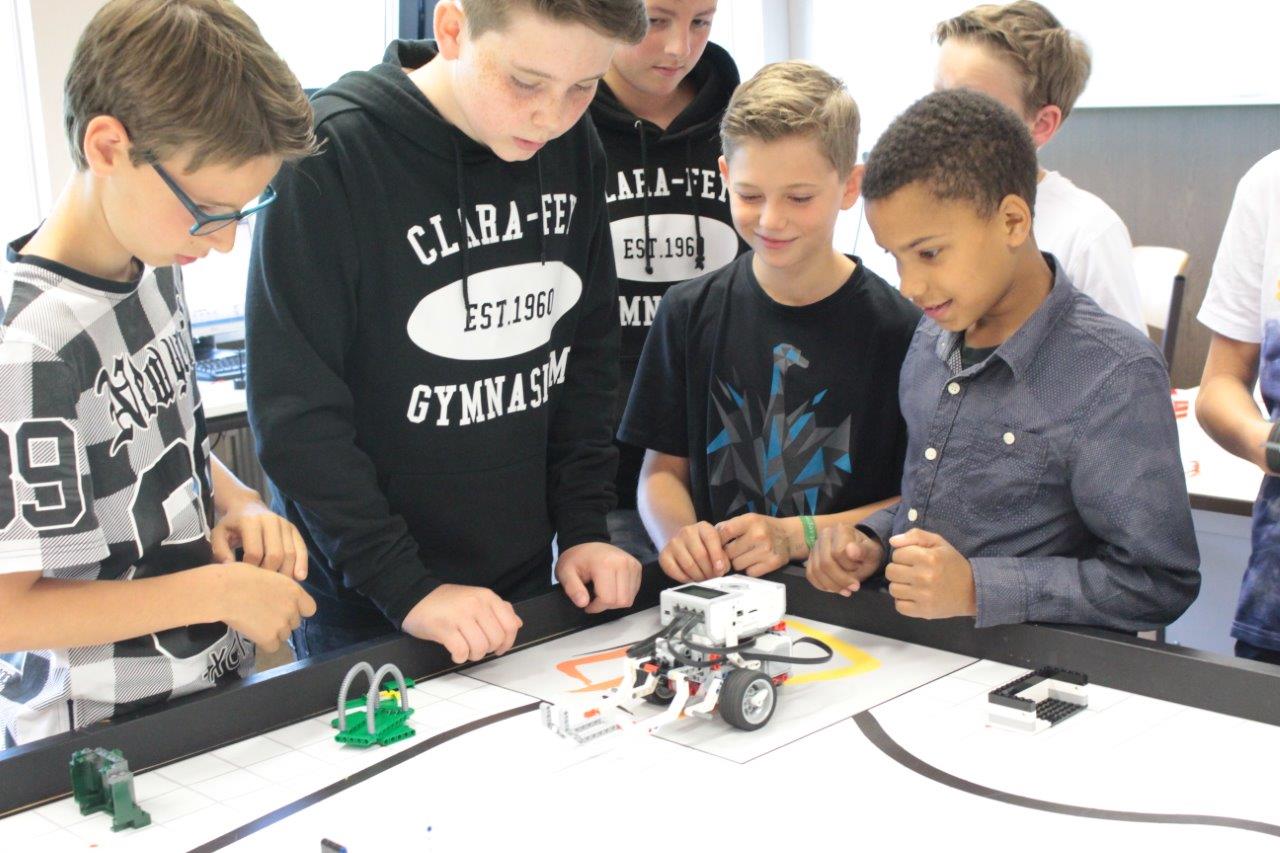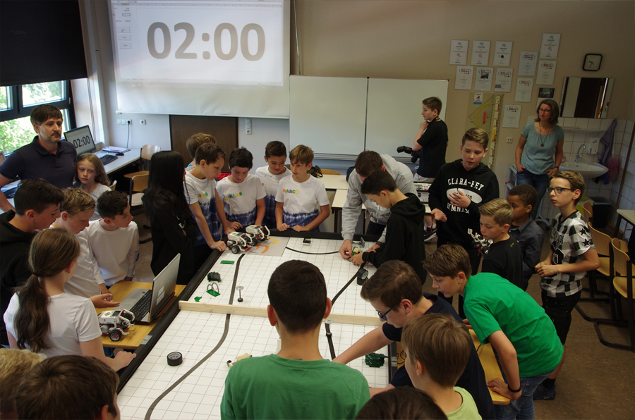 Zusätzlich wurden die Schülerinnen und Schüler der Klassen 5 und 6 über die Arbeit der Robotik-AG und über die Spielregeln des Wettbewerbs informiert, bevor die Betreuer mit ihren Teams in die beiden Computerräume des CFG gingen, um die erste Programmierphase über 1 ½ Stunden anzugehen.