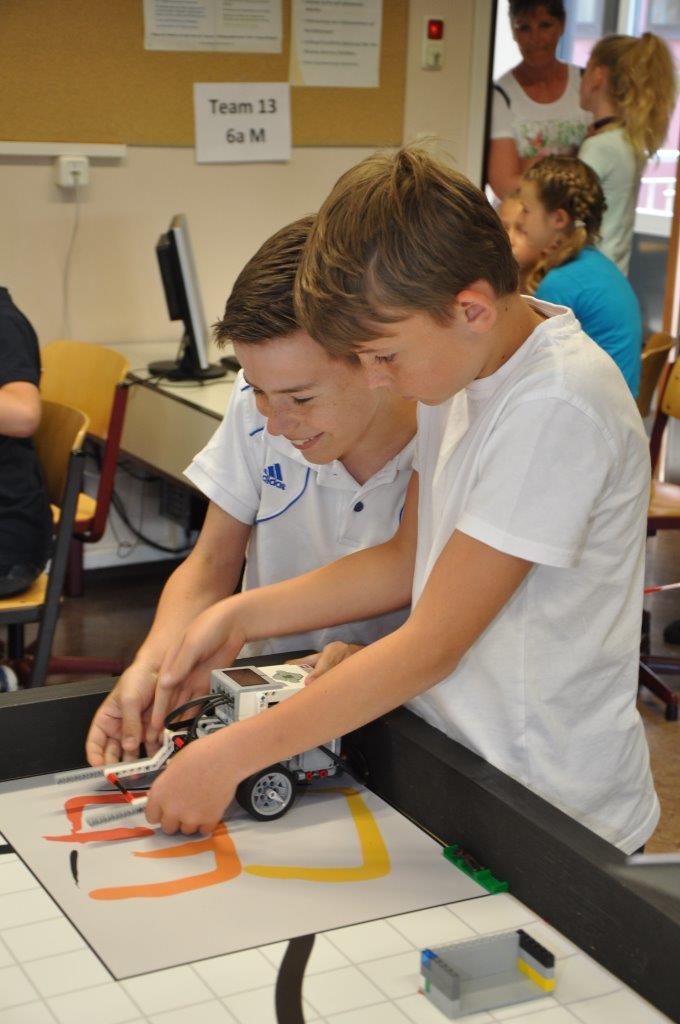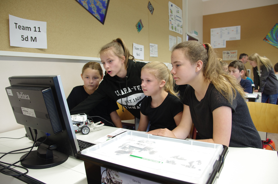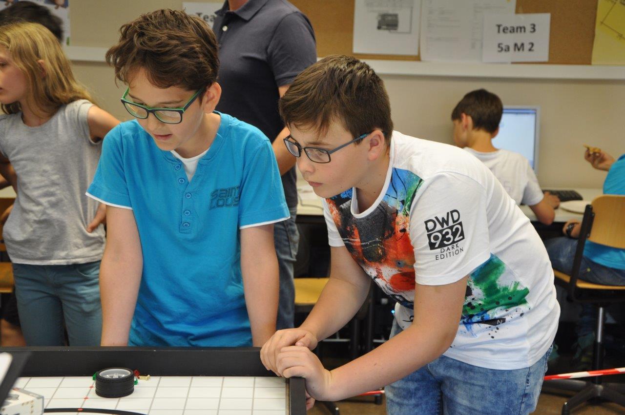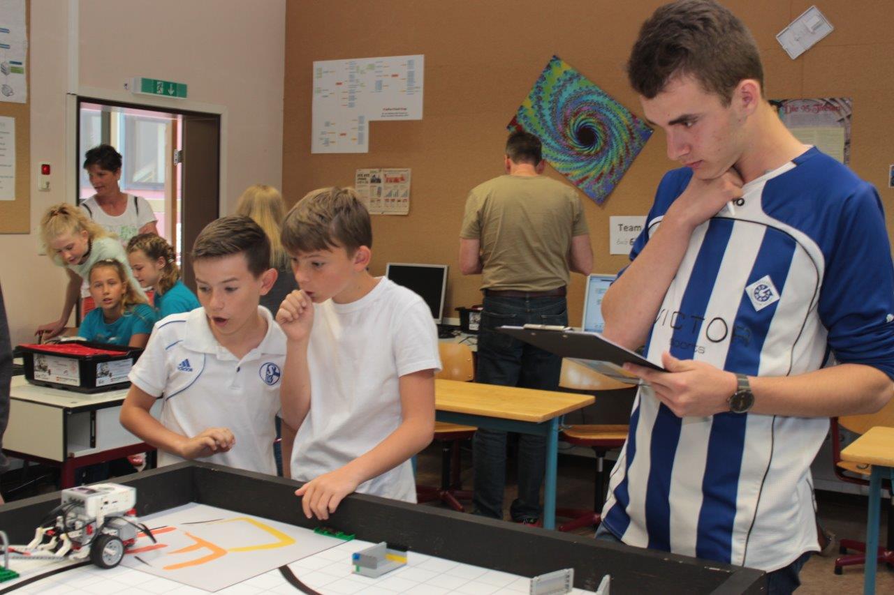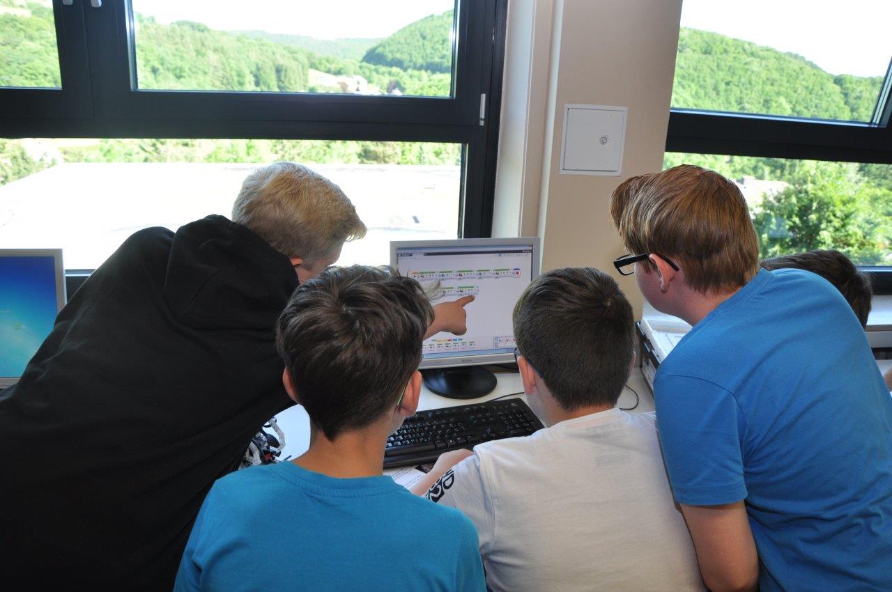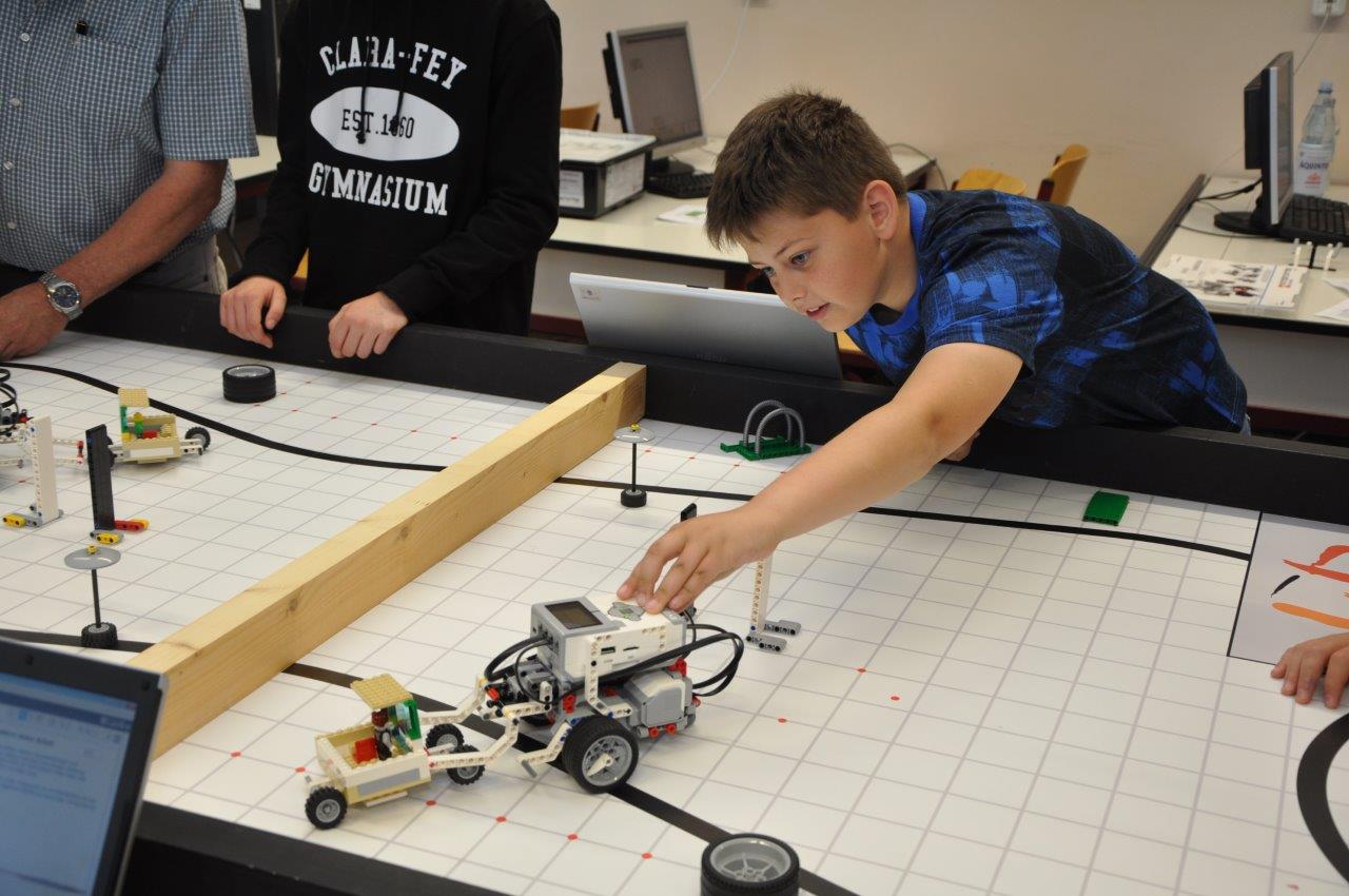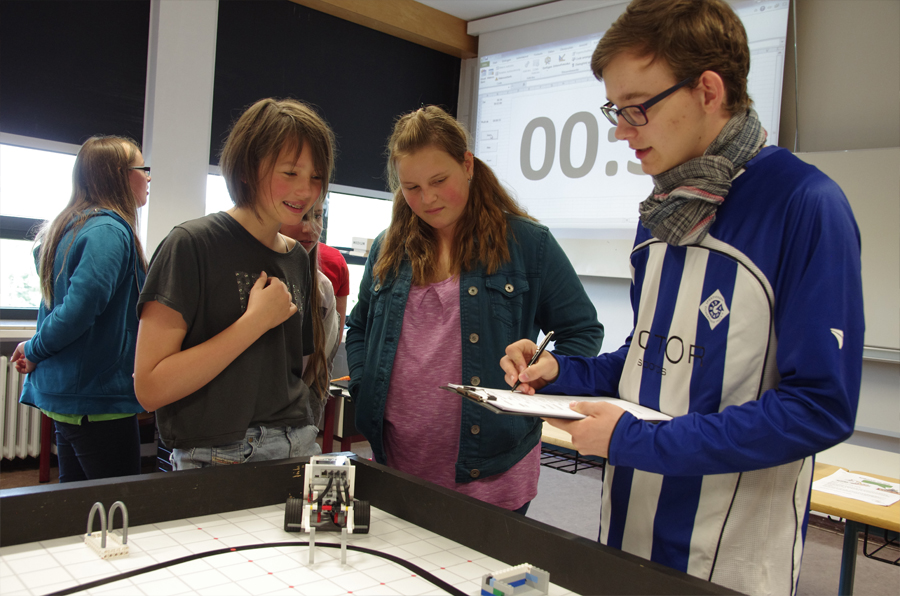 Zusätzlich wurden die Schülerinnen und Schüler der Klassen 5 und 6 über die Arbeit der Robotik-AG und über die Spielregeln des Wettbewerbs informiert, bevor die Betreuer mit ihren Teams in die beiden Computerräume des CFG gingen, um die erste Programmierphase über 1 ½ Stunden anzugehen.