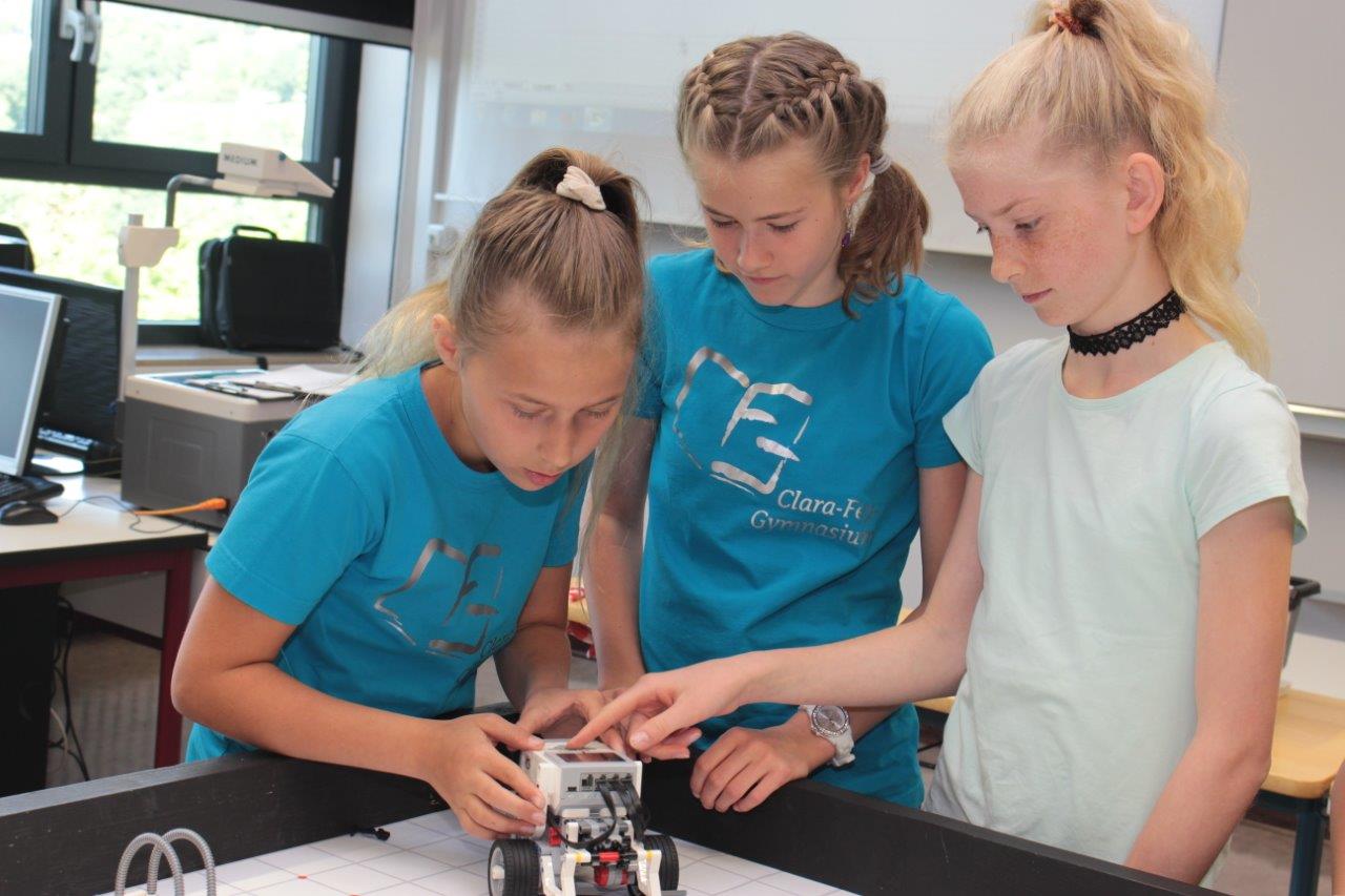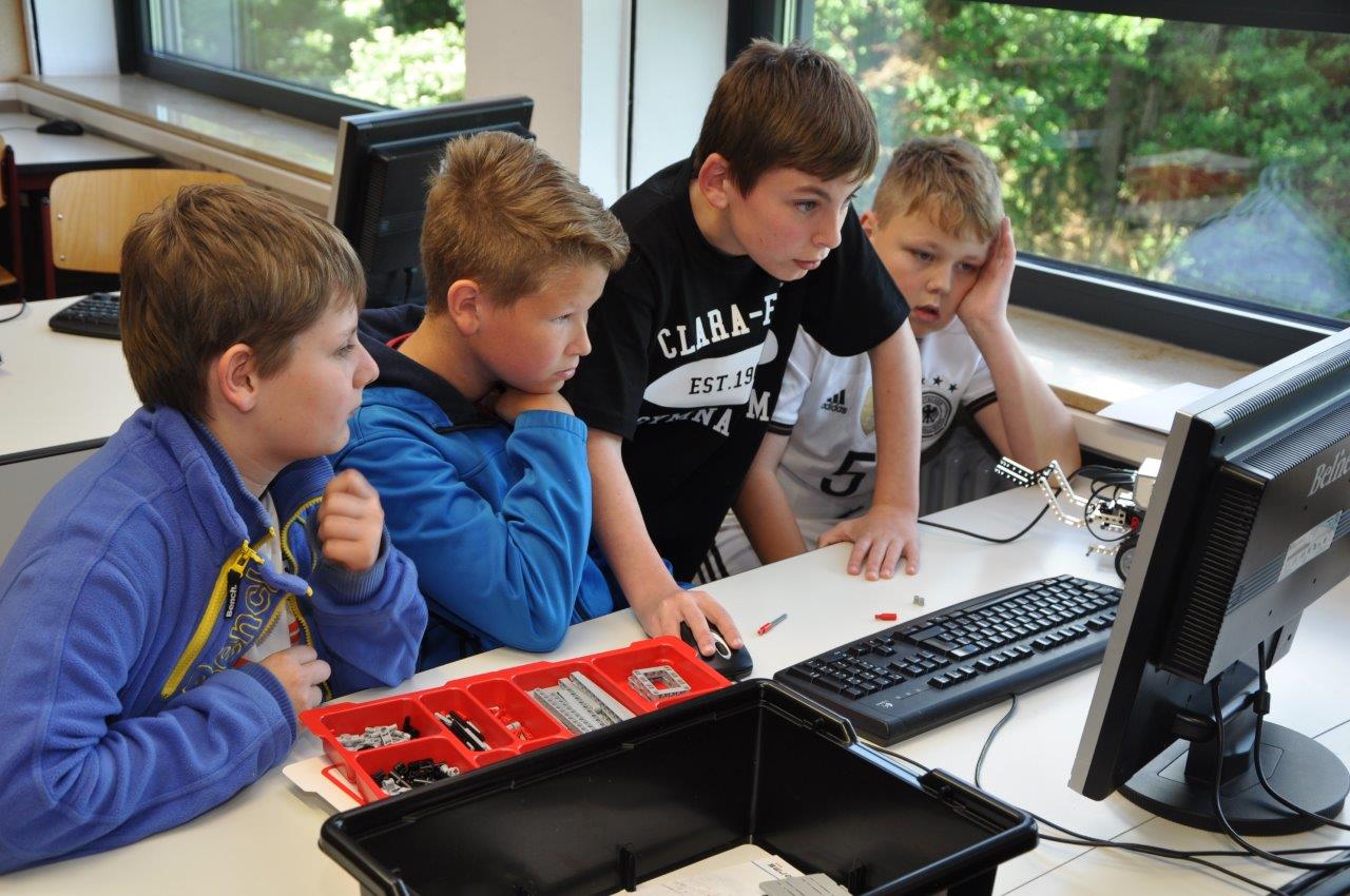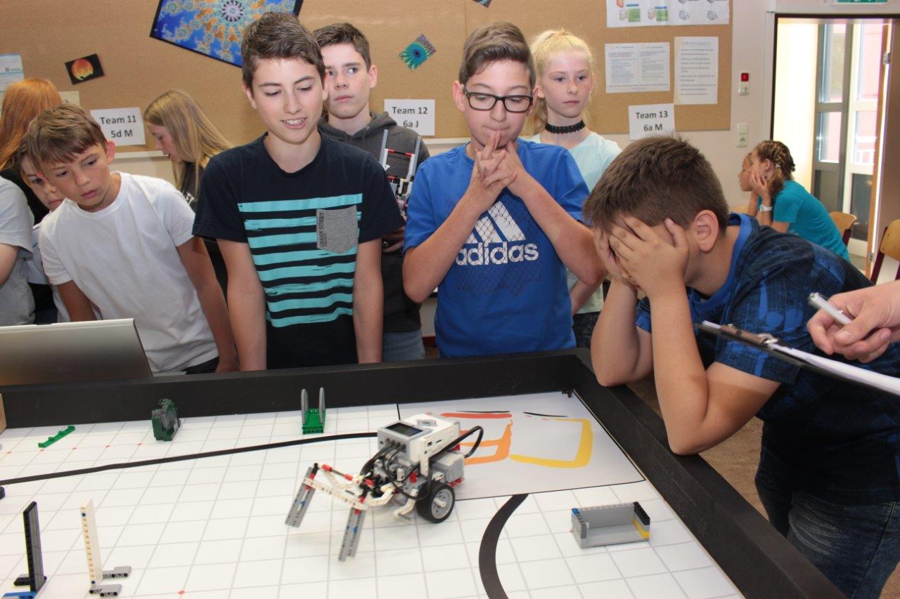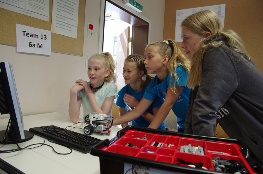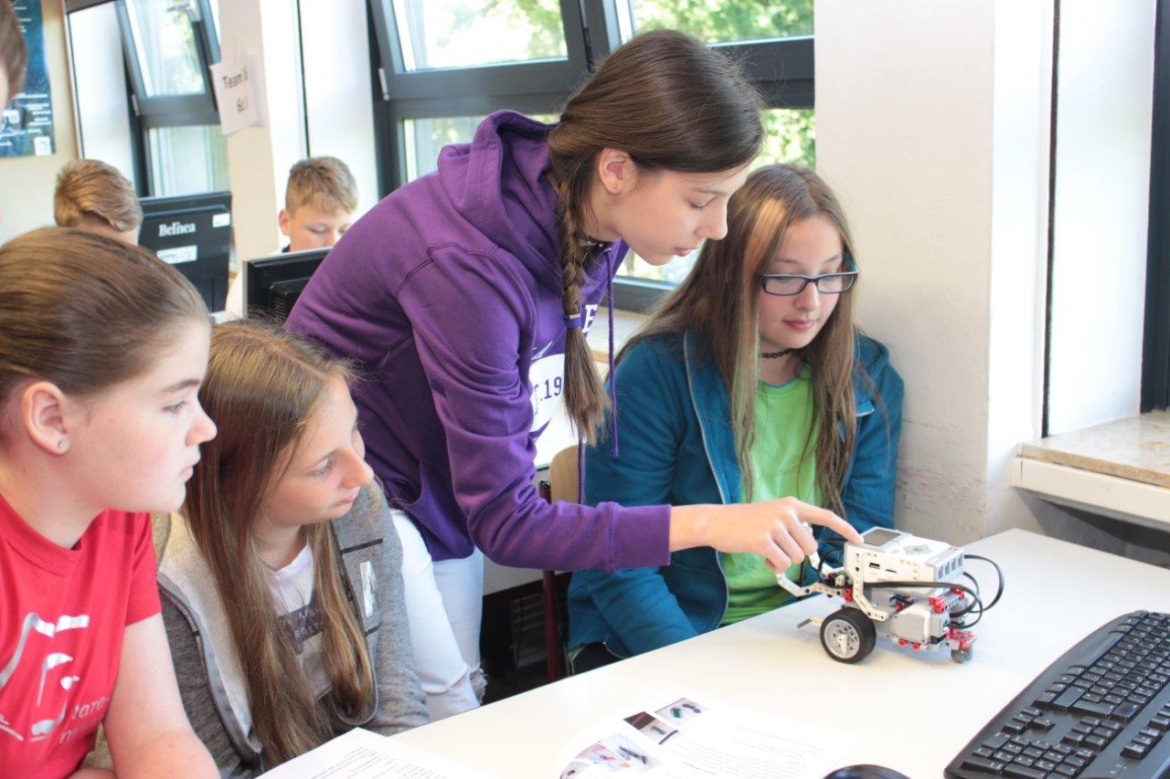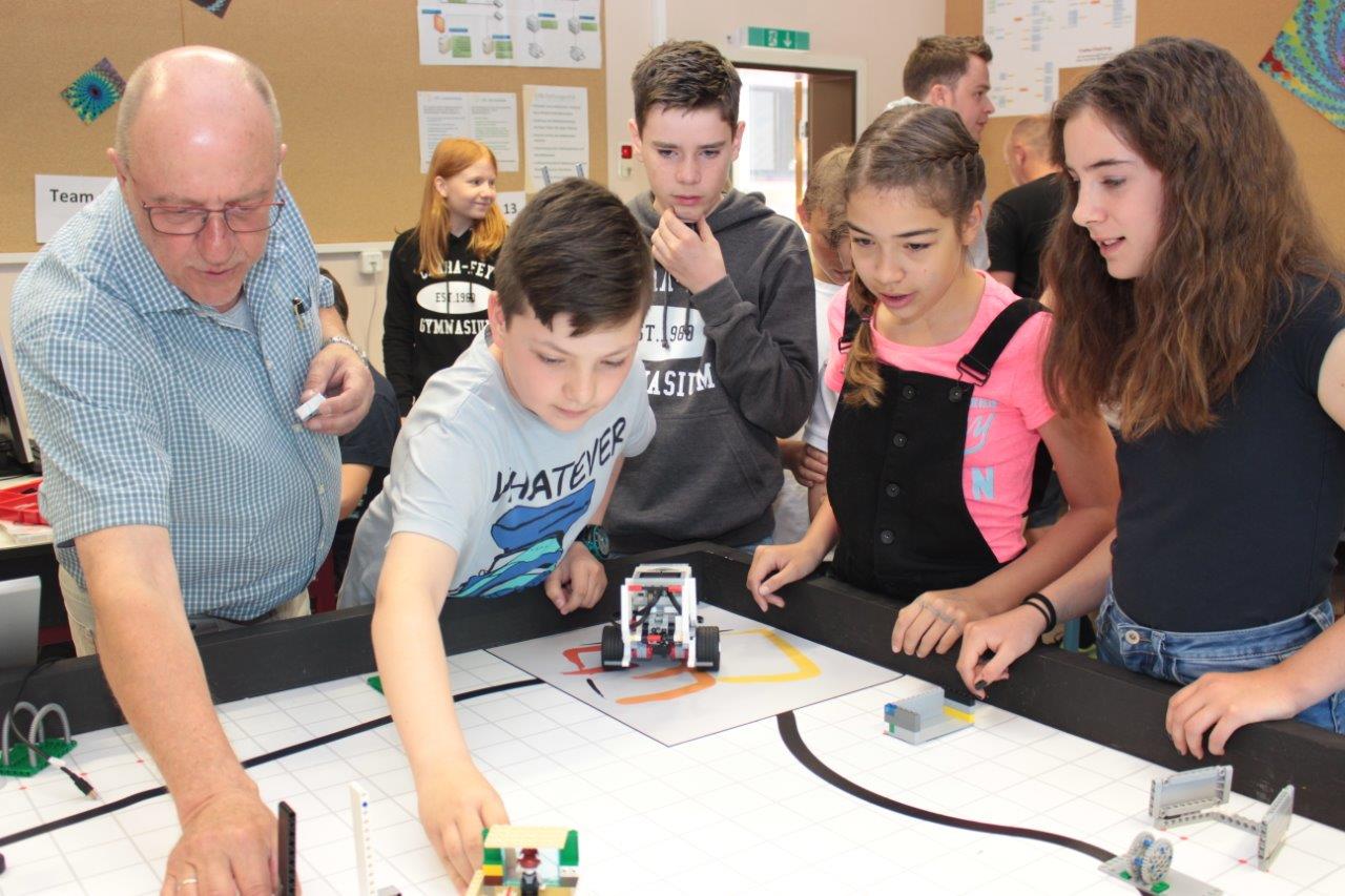 Zusätzlich wurden die Schülerinnen und Schüler der Klassen 5 und 6 über die Arbeit der Robotik-AG und über die Spielregeln des Wettbewerbs informiert, bevor die Betreuer mit ihren Teams in die beiden Computerräume des CFG gingen, um die erste Programmierphase über 1 ½ Stunden anzugehen.