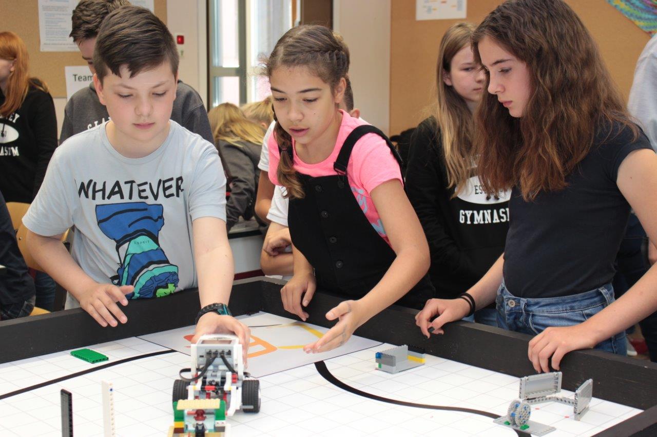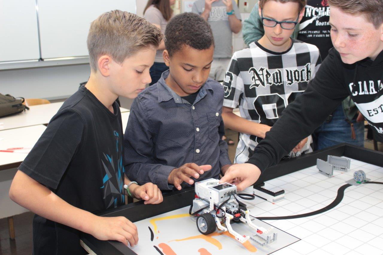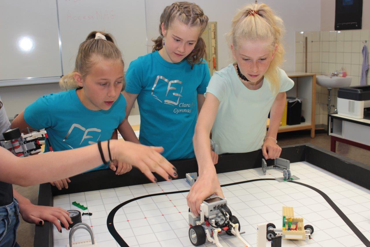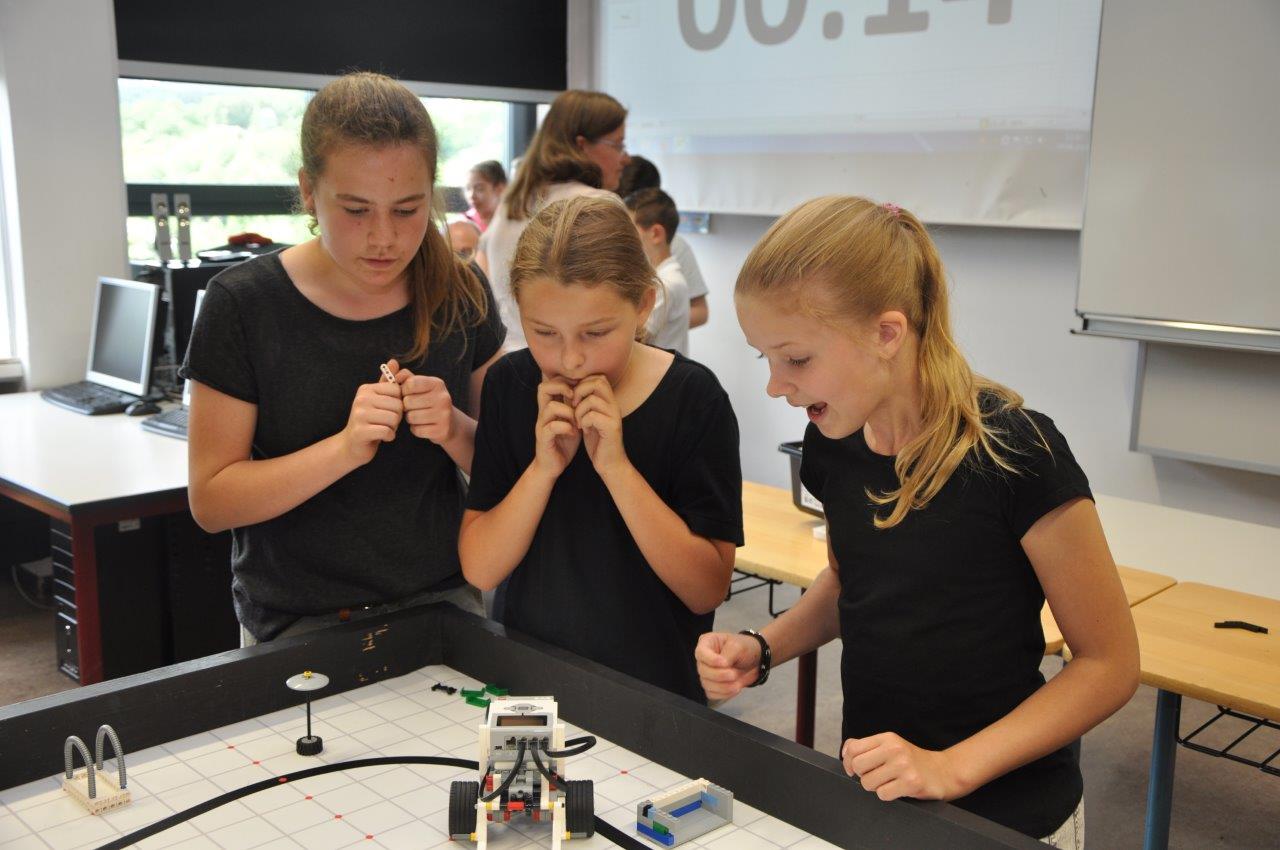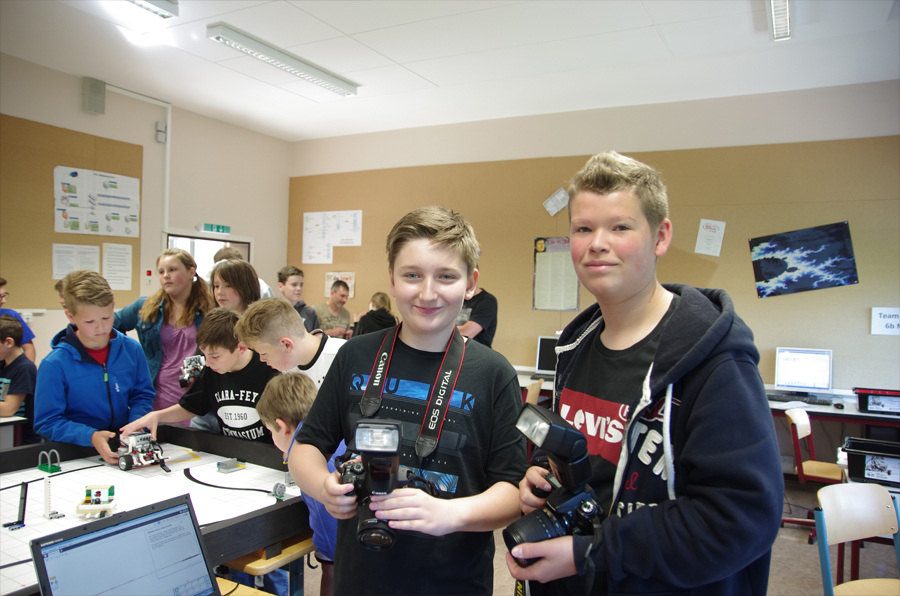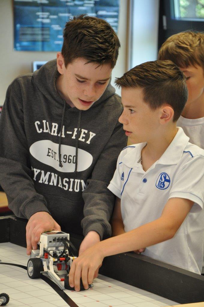 Zusätzlich wurden die Schülerinnen und Schüler der Klassen 5 und 6 über die Arbeit der Robotik-AG und über die Spielregeln des Wettbewerbs informiert, bevor die Betreuer mit ihren Teams in die beiden Computerräume des CFG gingen, um die erste Programmierphase über 1 ½ Stunden anzugehen.