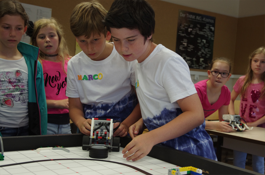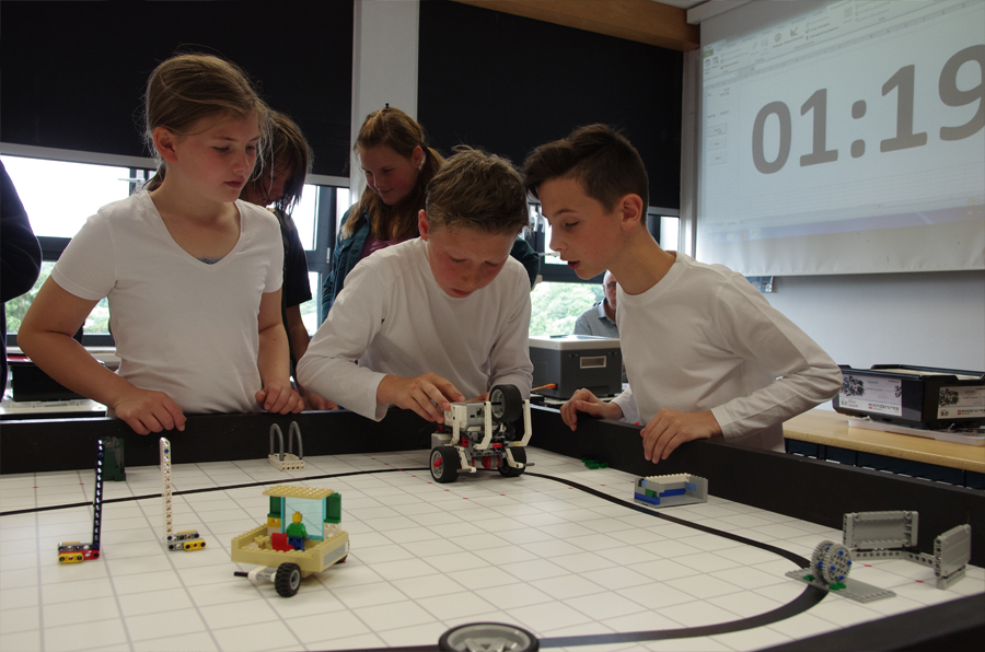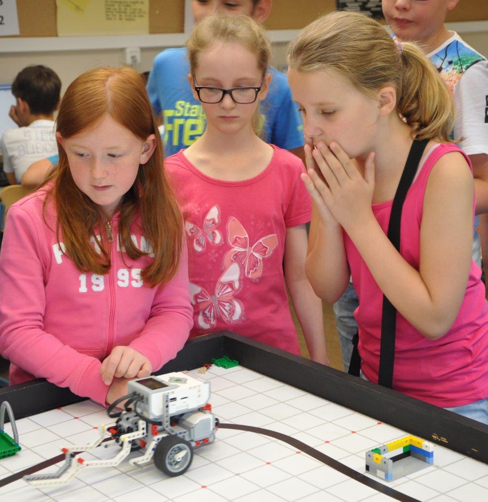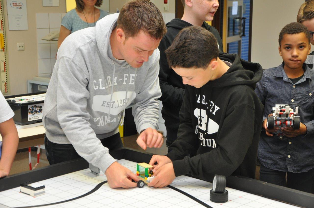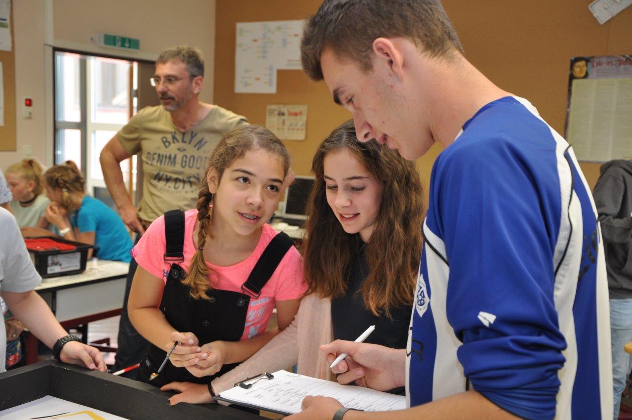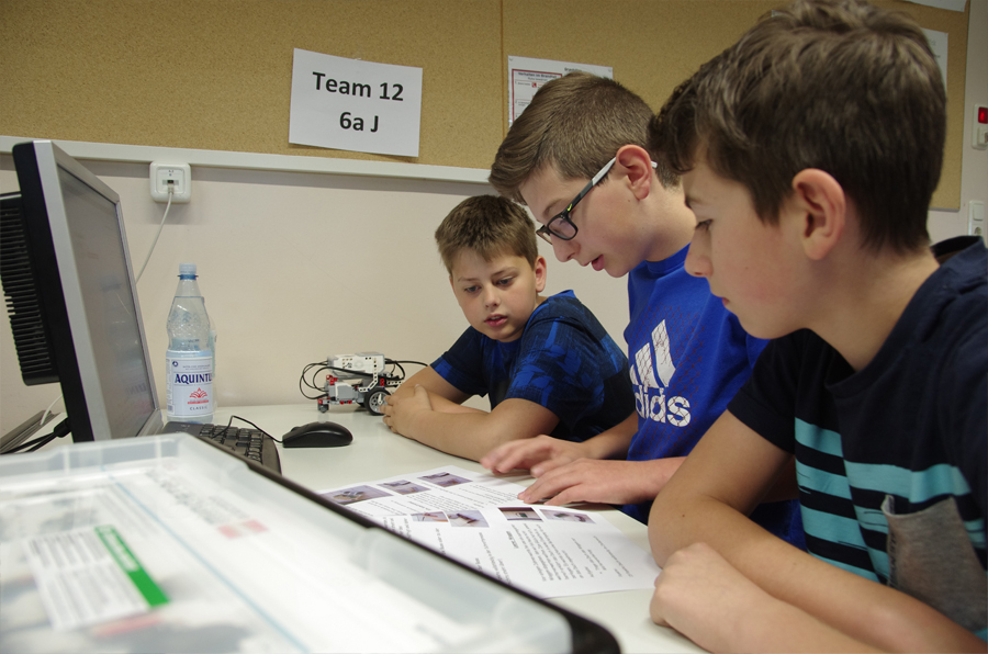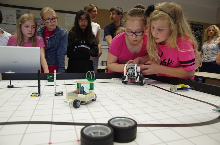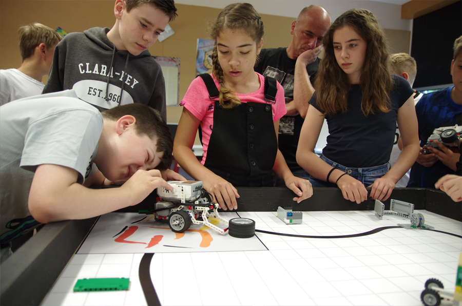 Zusätzlich wurden die Schülerinnen und Schüler der Klassen 5 und 6 über die Arbeit der Robotik-AG und über die Spielregeln des Wettbewerbs informiert, bevor die Betreuer mit ihren Teams in die beiden Computerräume des CFG gingen, um die erste Programmierphase über 1 ½ Stunden anzugehen.