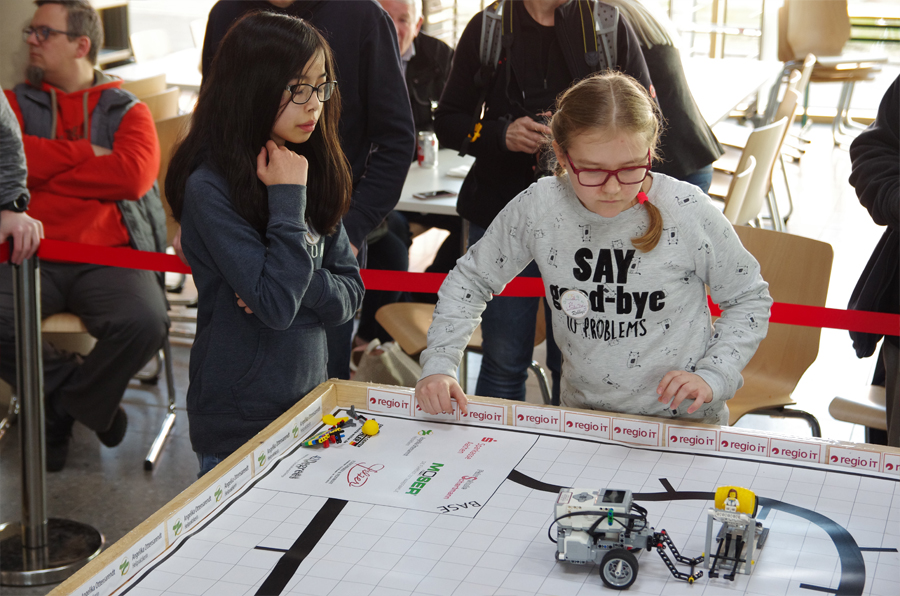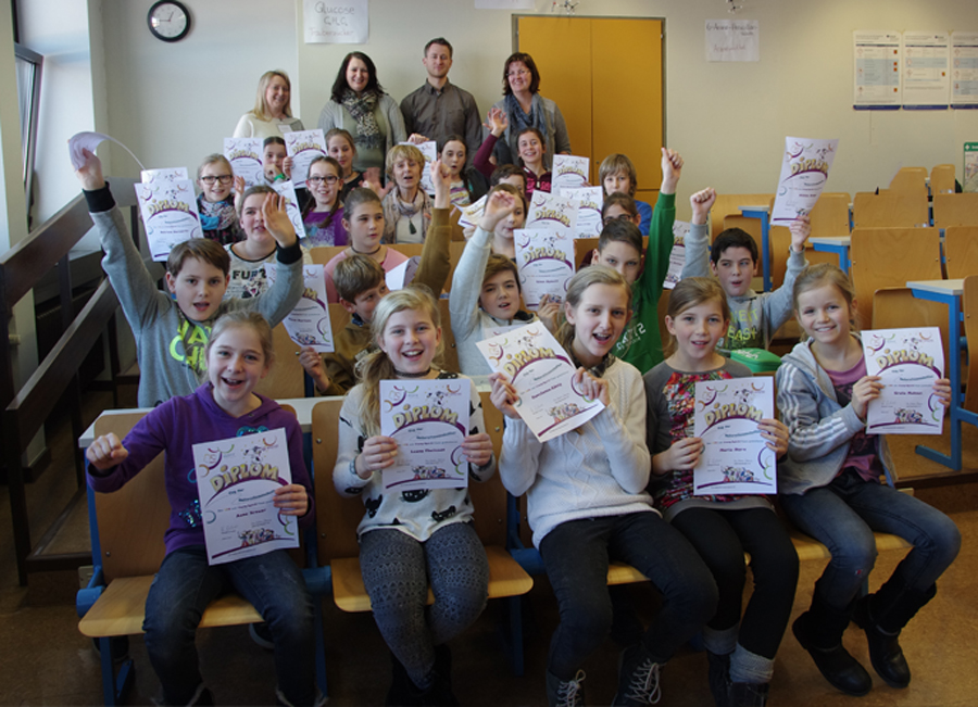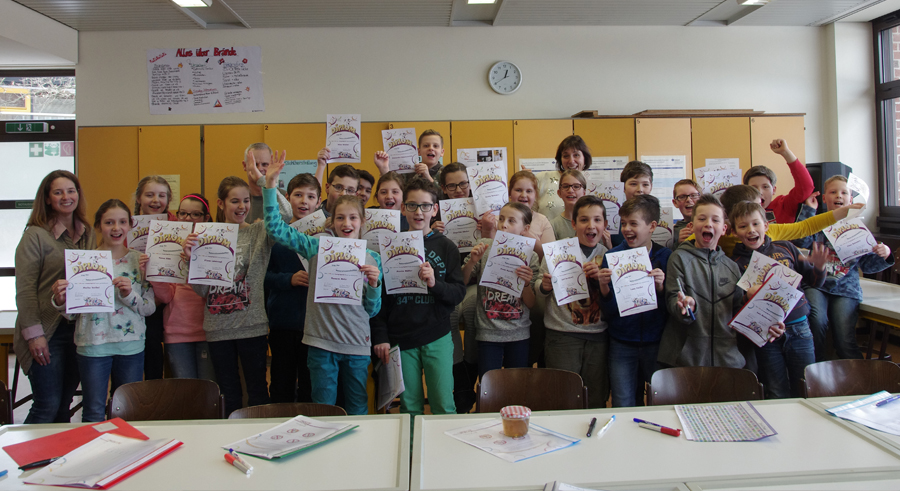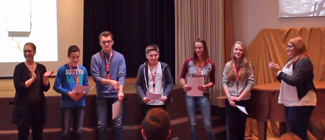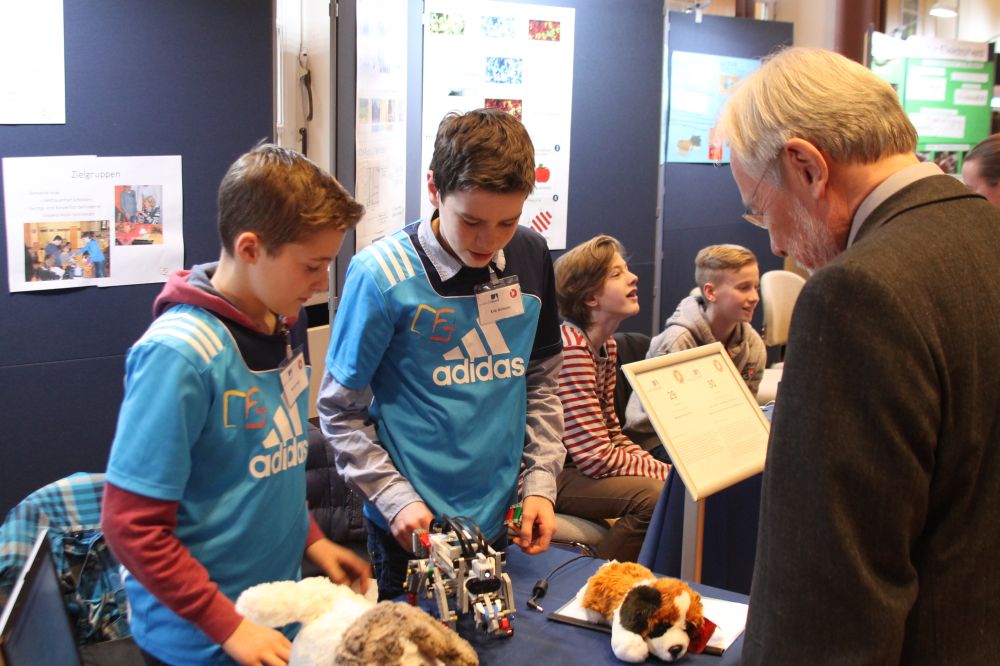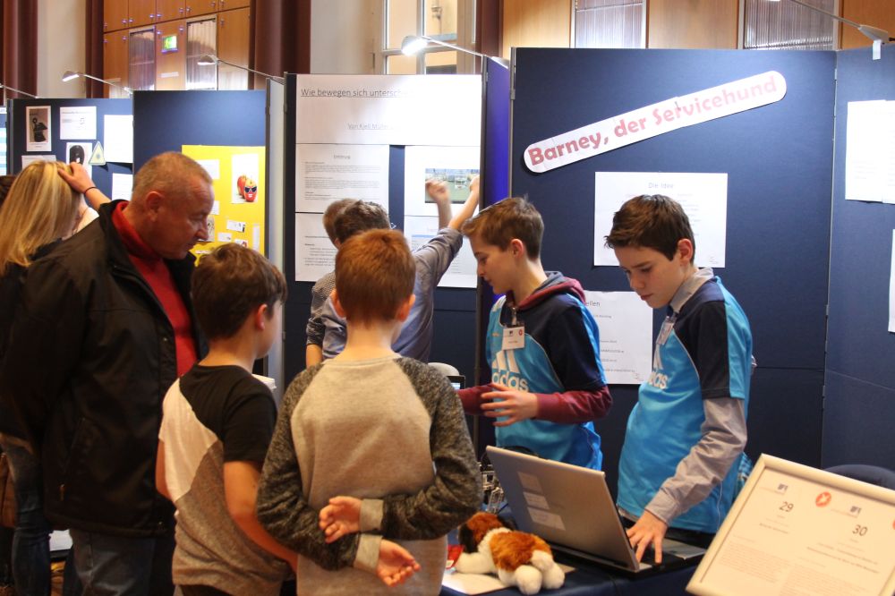 Die Begeisterung in der Aula der Universität Bonn war groß: Direkt bei ihrer ersten Teilnahme beim Wettbewerb Jugend forscht schafften es die beiden Schüler Erik Hofmann (8d) und Patrick Pütz (7c) mit ihrem Forschungsprojekt „Barney, der Service-Hund“ auf einen Podest-Platz. Unter dem Motto „Zukunft – Ich gestalte Sie“ traten 69 Mitbewerber mit 33 Projekten in den Bereichen Biologie, Chemie, Physik, Informatik/Mathematik und Technik an.