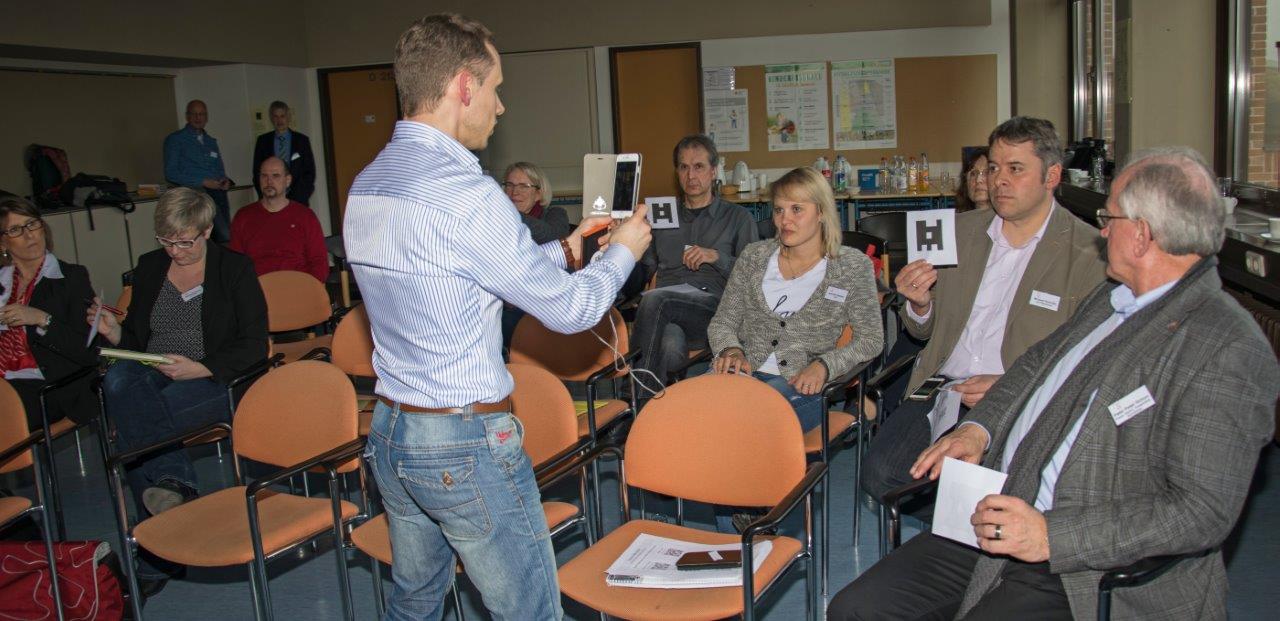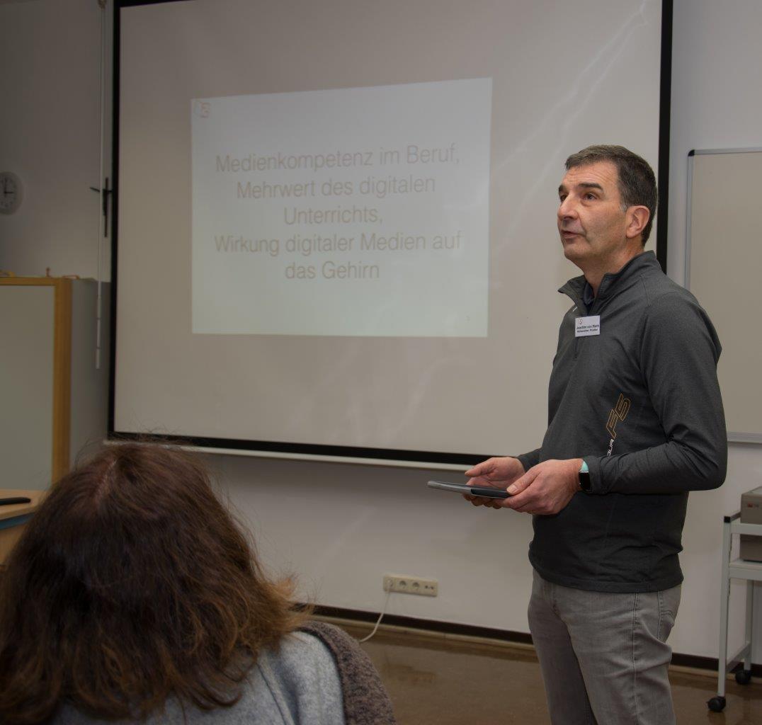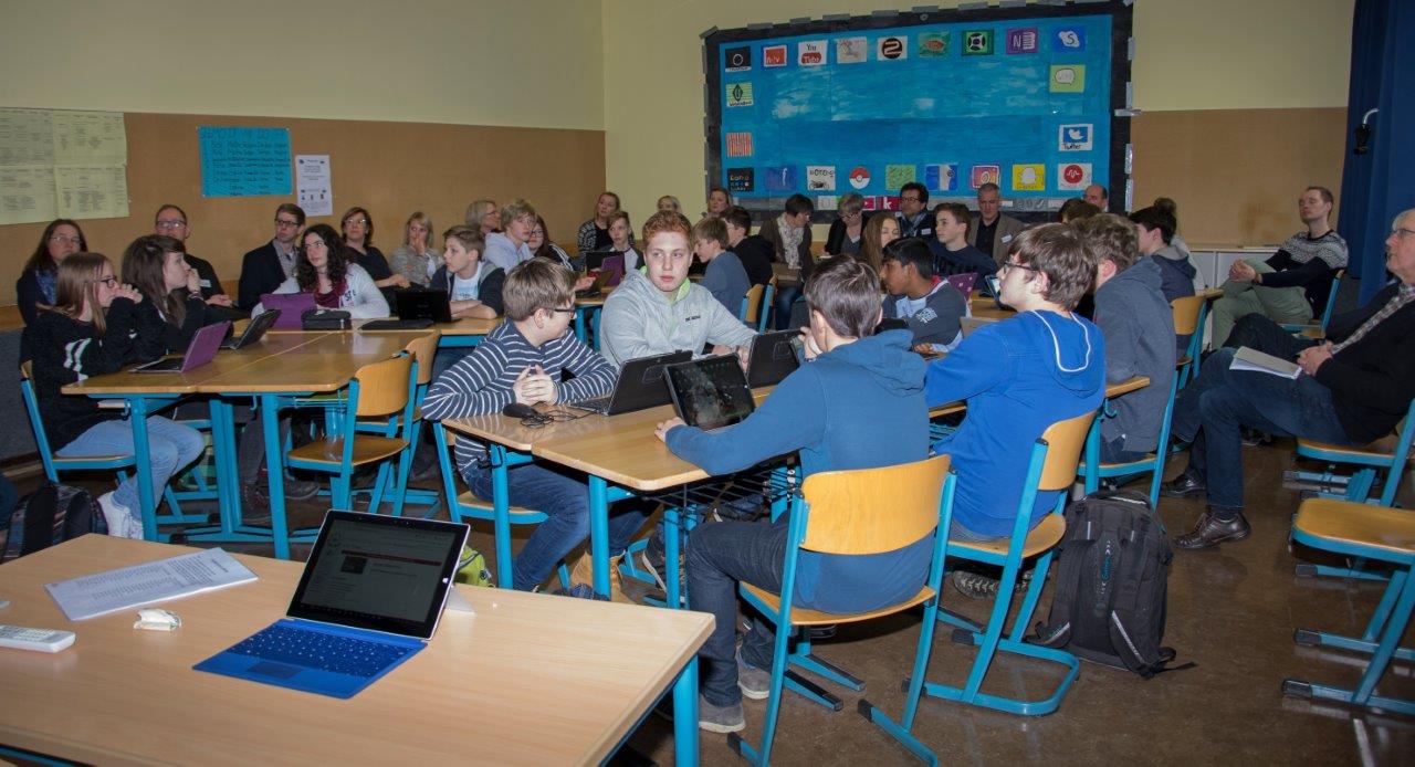 Zahlreiche TeilnehmerInnen aus Schulen, Betrieben und Institutionen wurden in der 1. Veranstaltung dieser Art in der Region am Donnerstag, 02/03/17, vom Schulleiter Helmut Schuster und Jürgen Drewes, dem Leiter der Tagung, herzlich begrüßt. Im Zentrum stand die Frage: Welche Rolle können digitale Medien im Lehr-Lern-Prozess spielen?