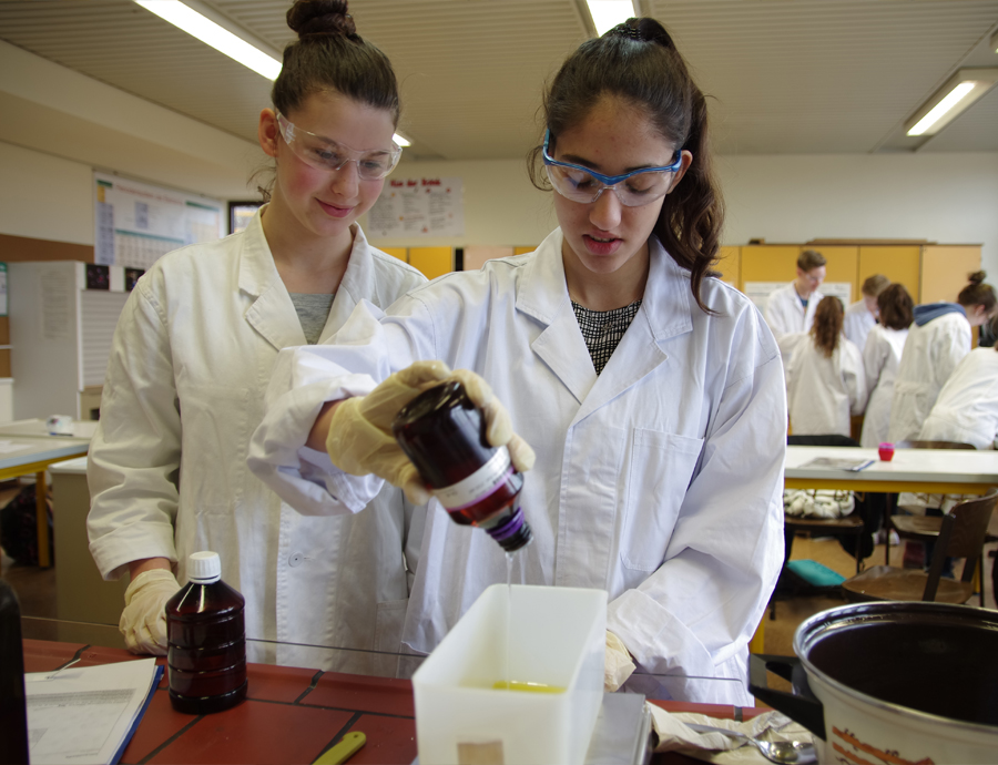 Seit Anfang des zweiten Schulhalbjahres treffen sich die Teilnehmerinnen und Teilnehmer der Chemie-AG unter der Leitung von Frau Berners, um mehr über Seifen, Cremes und Hautpflege zu erfahren. Dadurch, dass wir eine kleine Gruppe sind, können wir normalerweise zu zweit arbeiten und jeder kann viel praktisch arbeiten.