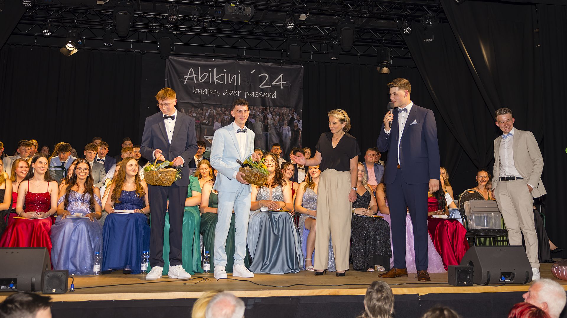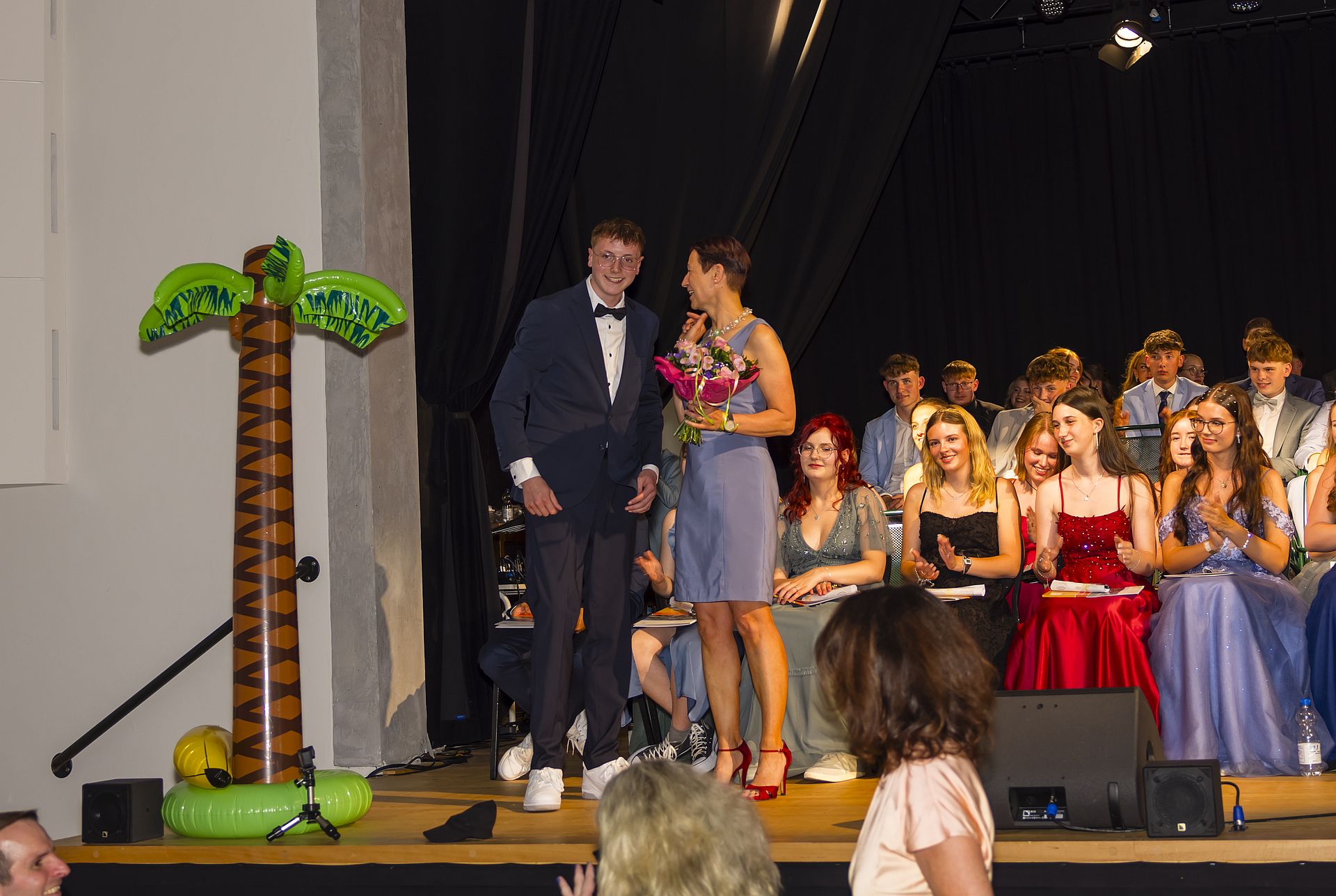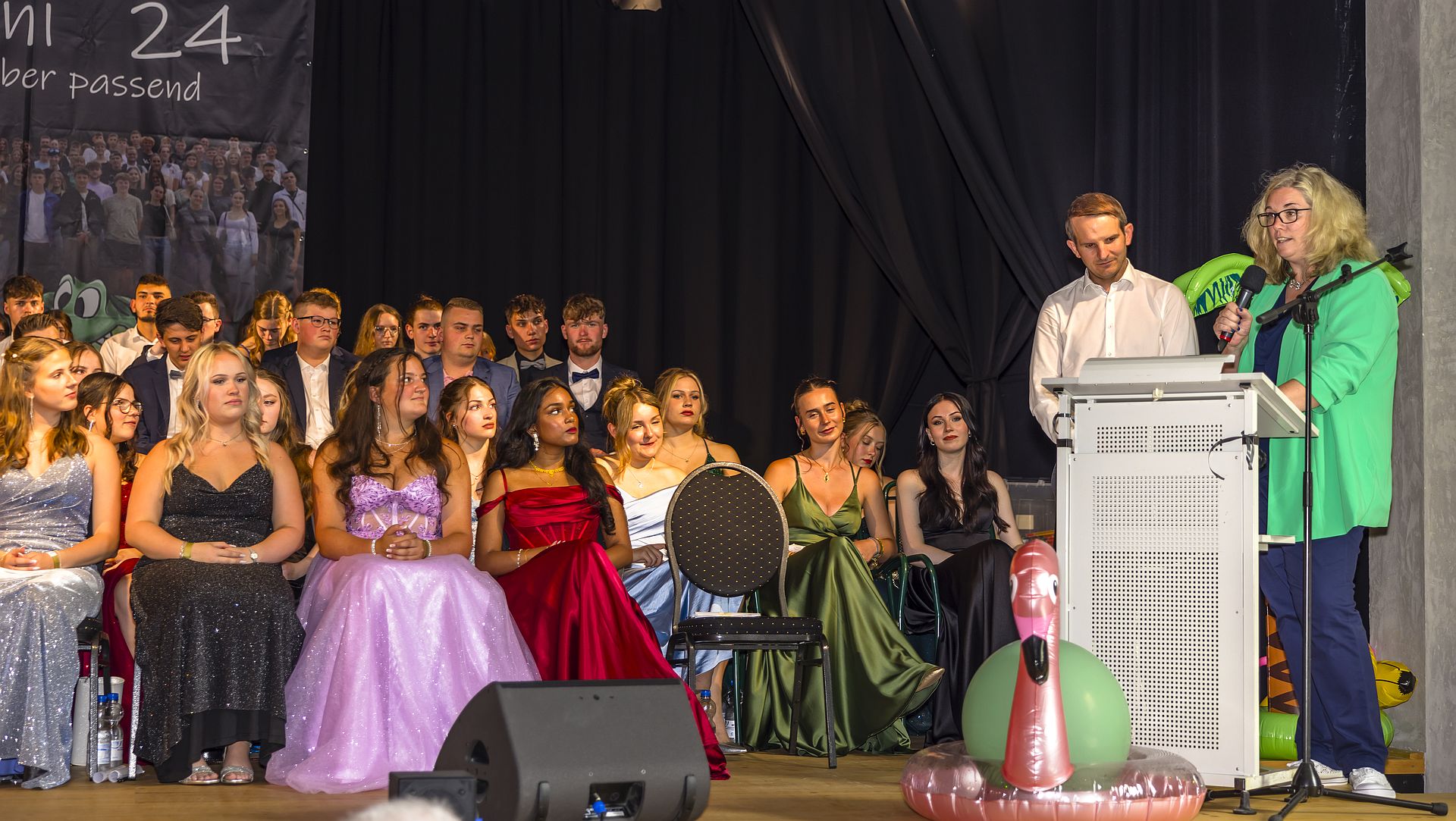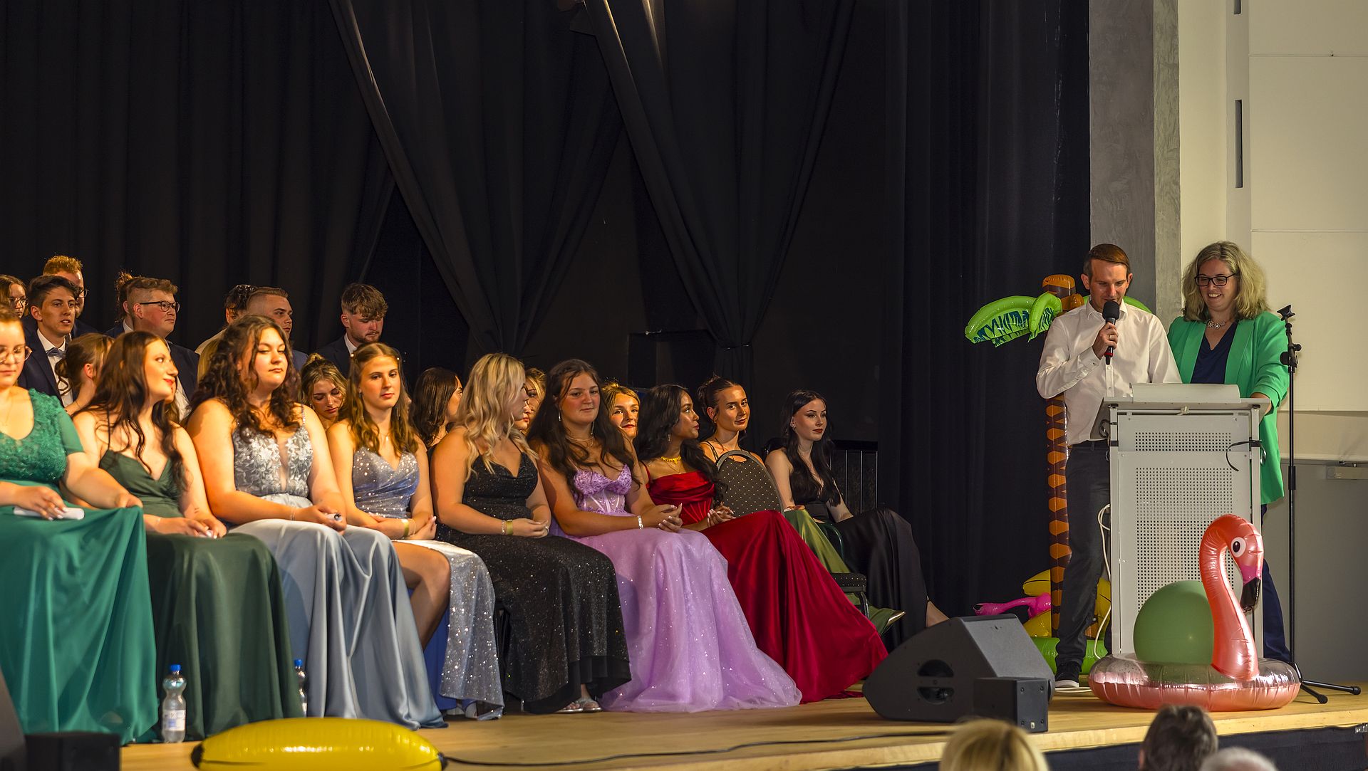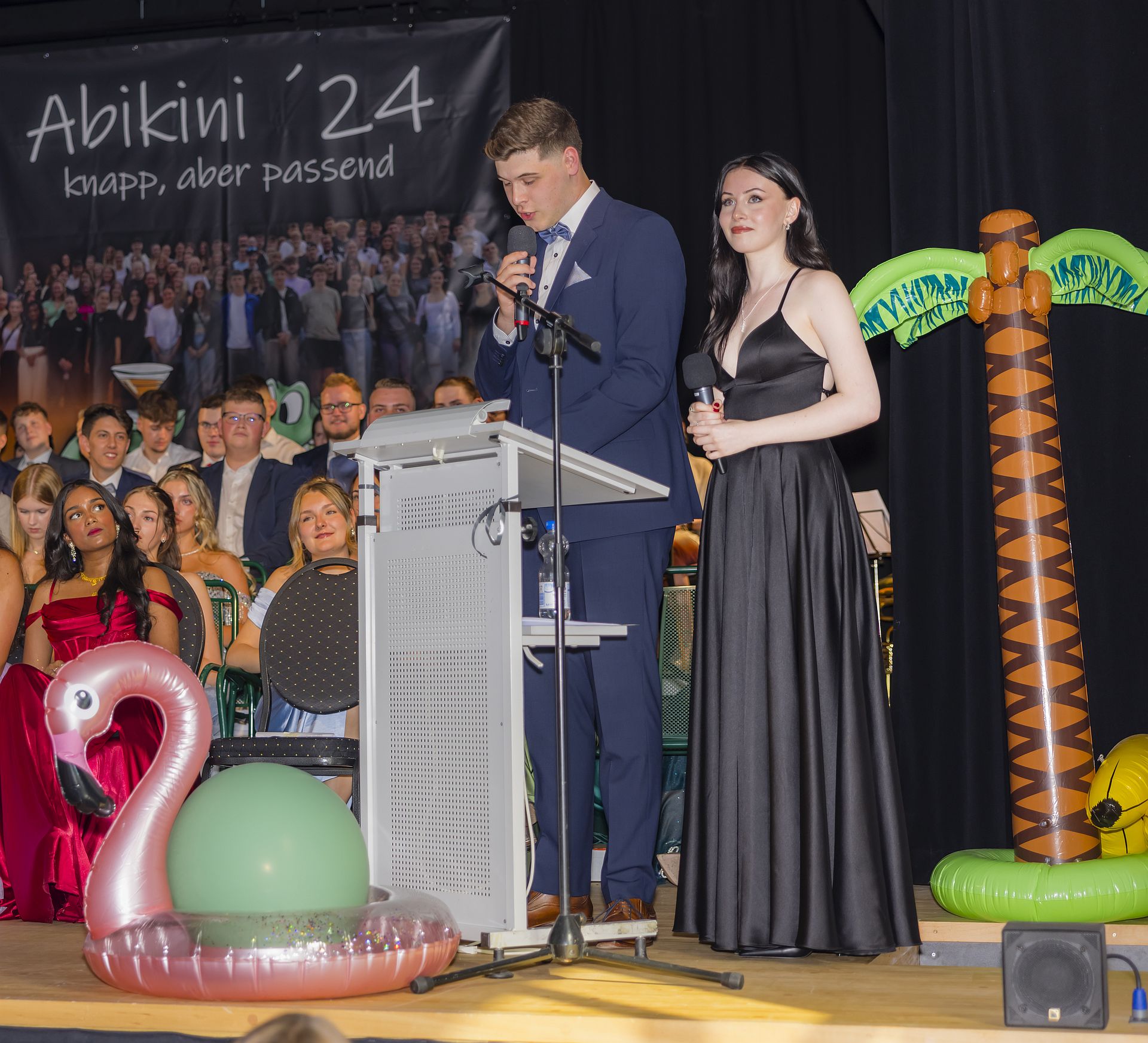 Nach einem Umzug ins Gemünder Kurhaus begann die offizielle Entlassungsfeier mit der Begrüßung durch die Moderatoren des Abends, Hannah Lenz, Abigail Müller und Gordej Kozlov, alle drei aus den beiden Abschlussklassen.