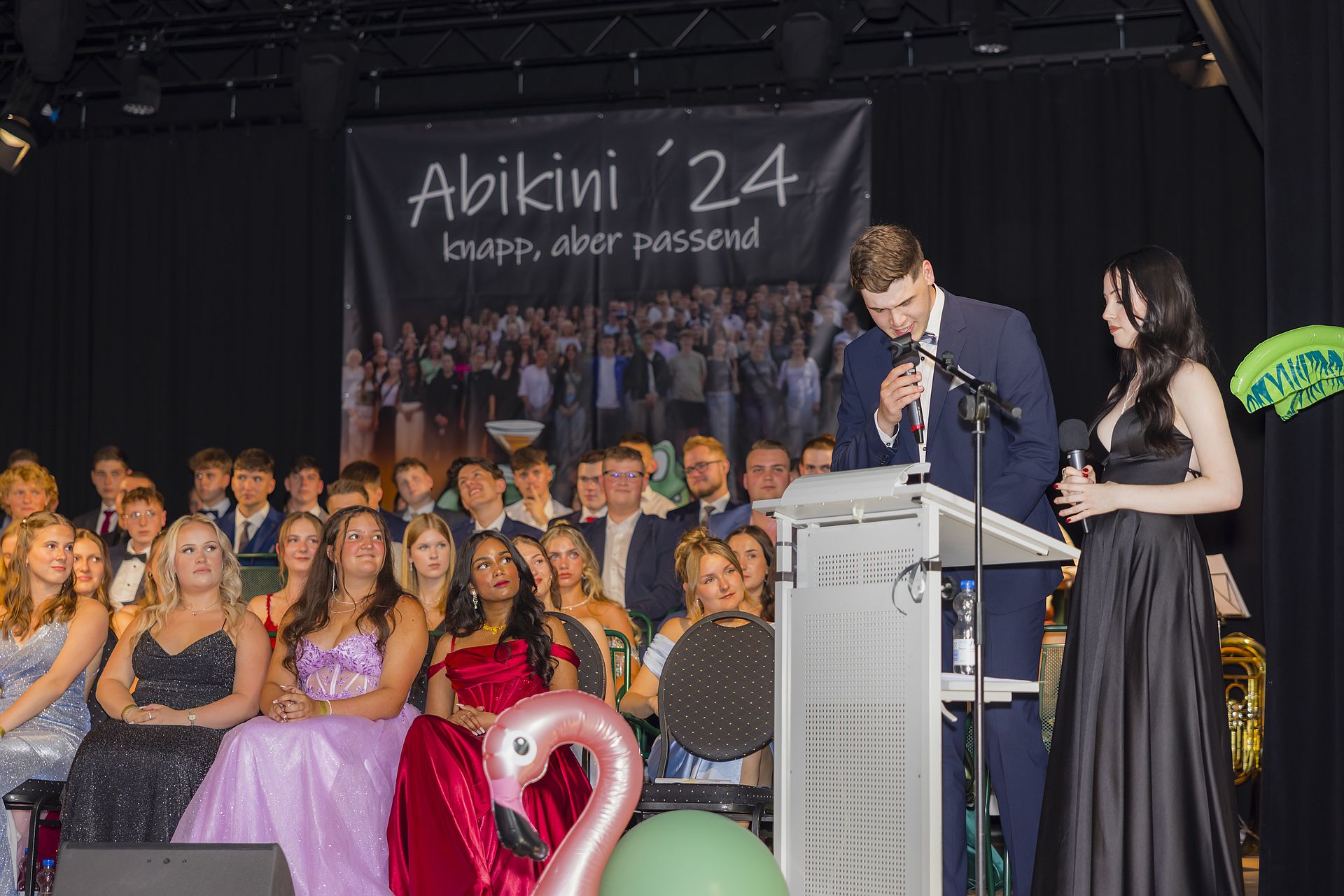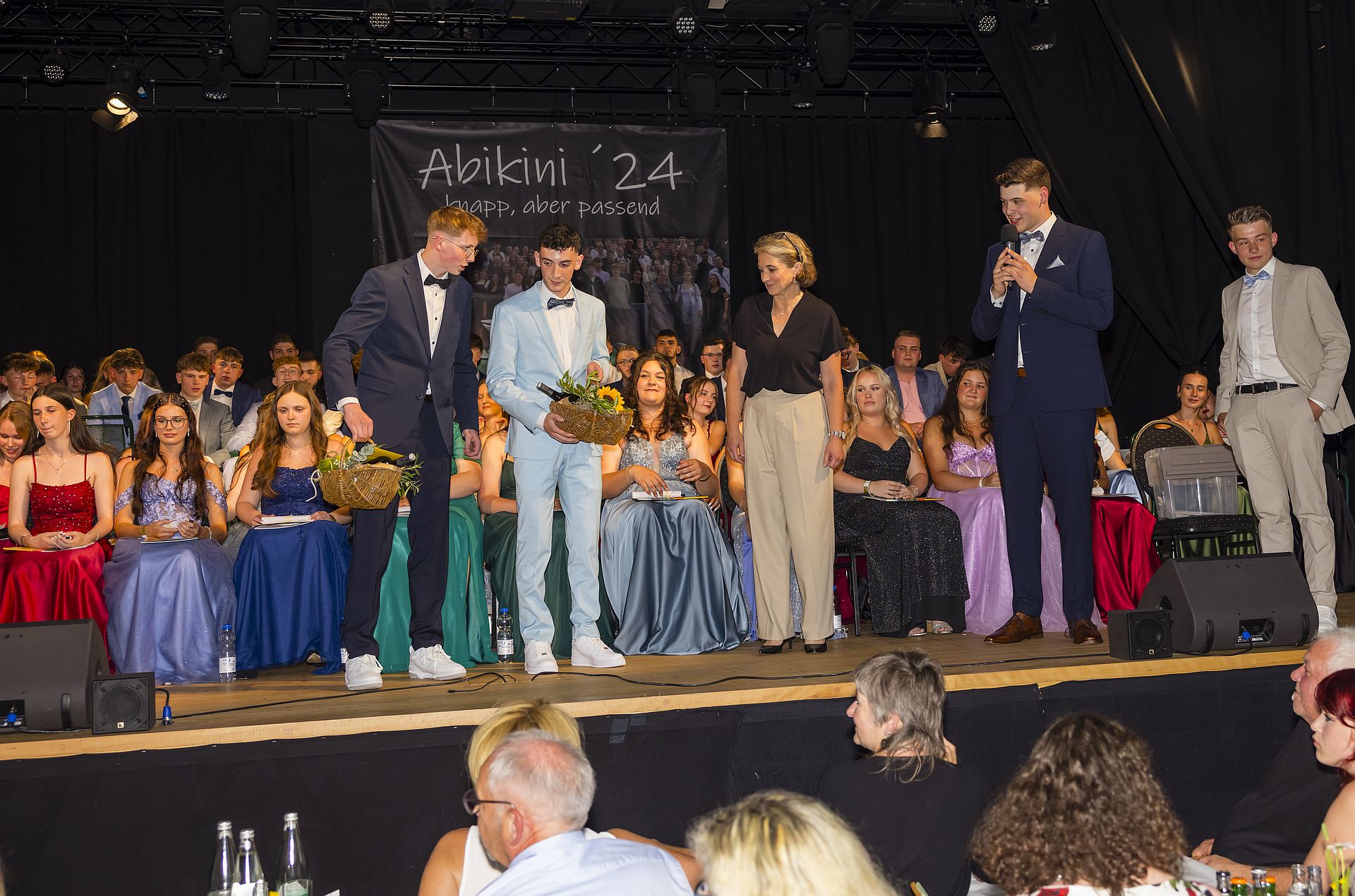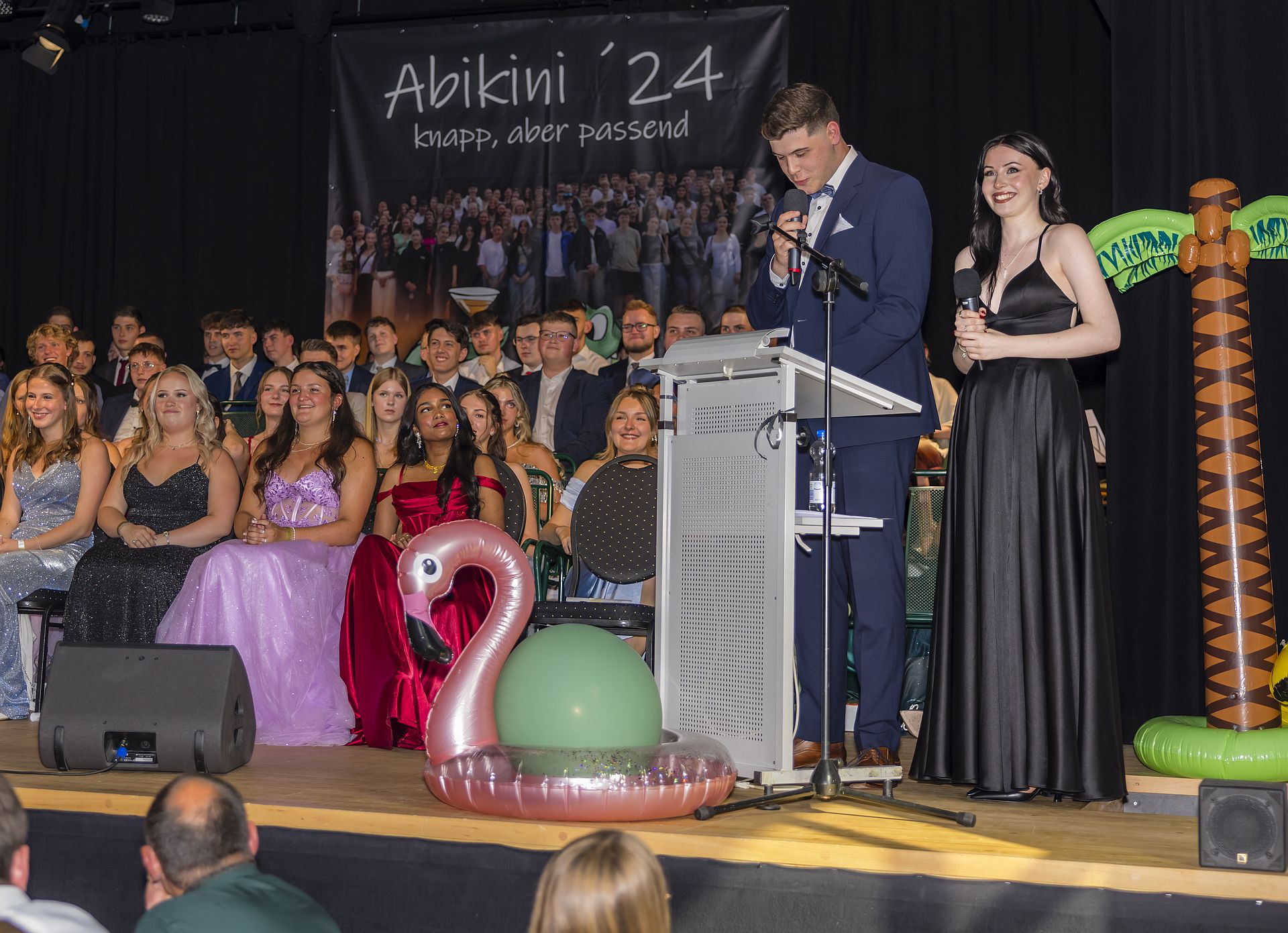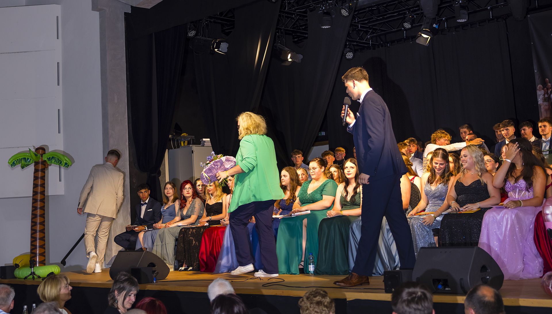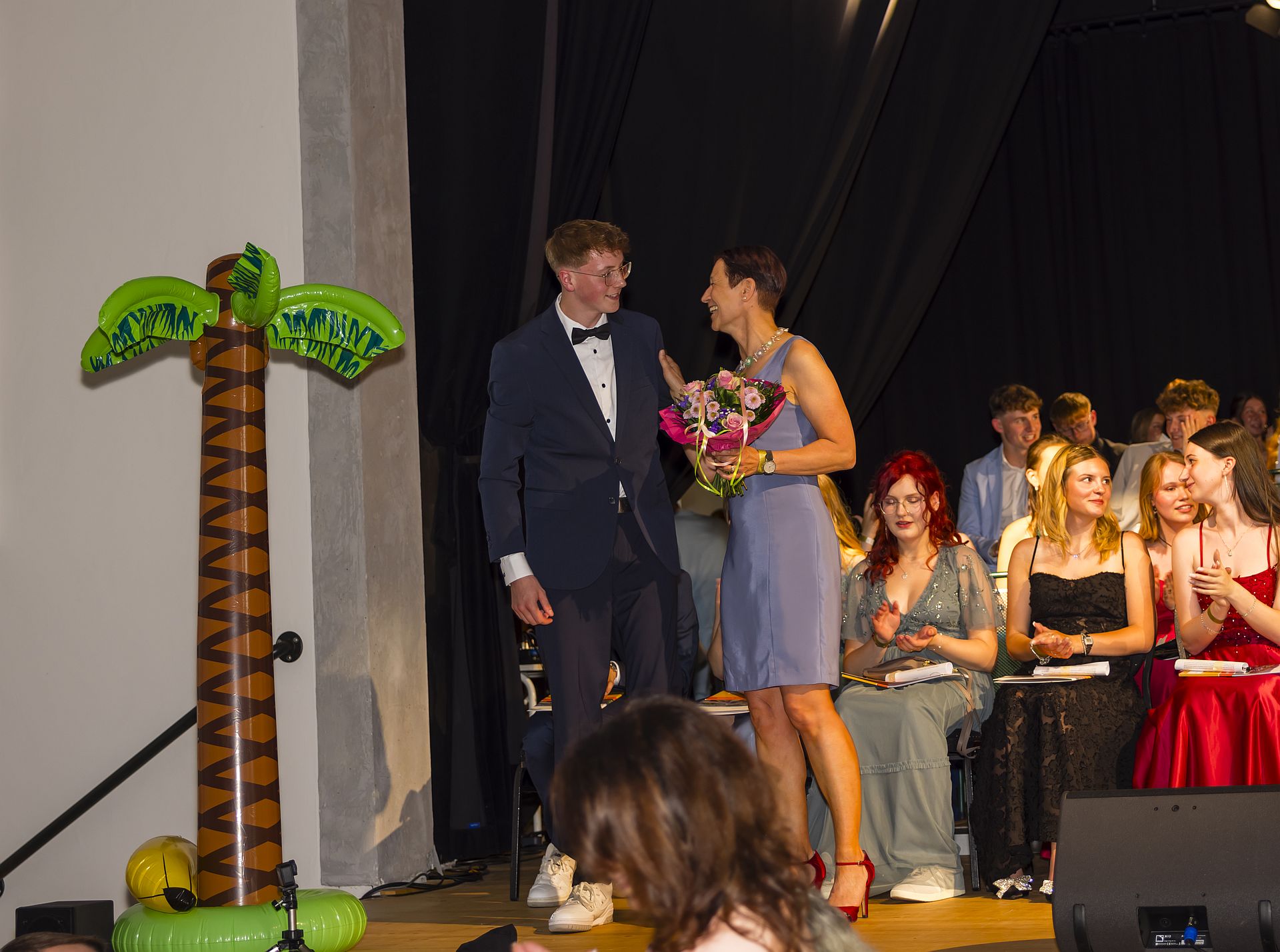 Nach einem Umzug ins Gemünder Kurhaus begann die offizielle Entlassungsfeier mit der Begrüßung durch die Moderatoren des Abends, Hannah Lenz, Abigail Müller und Gordej Kozlov, alle drei aus den beiden Abschlussklassen.