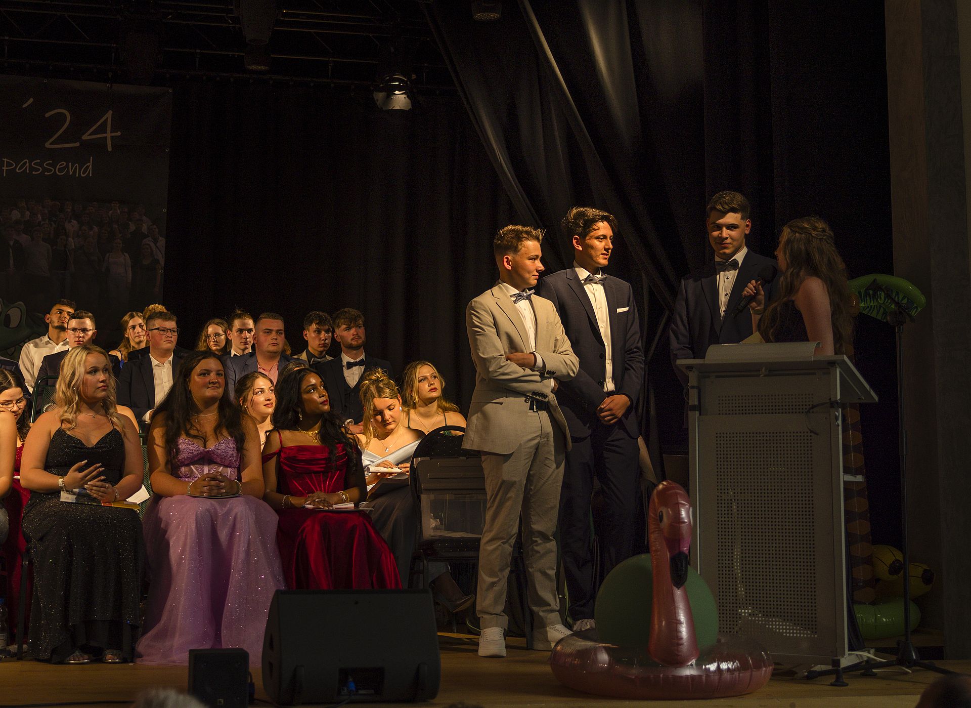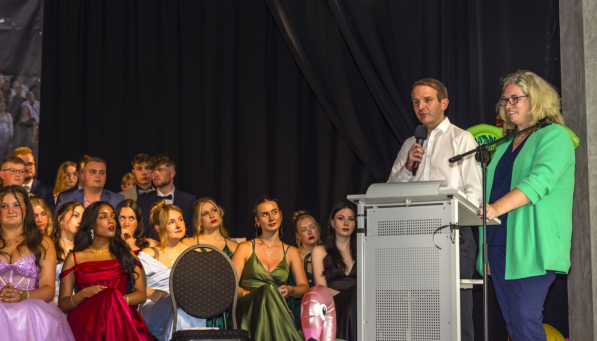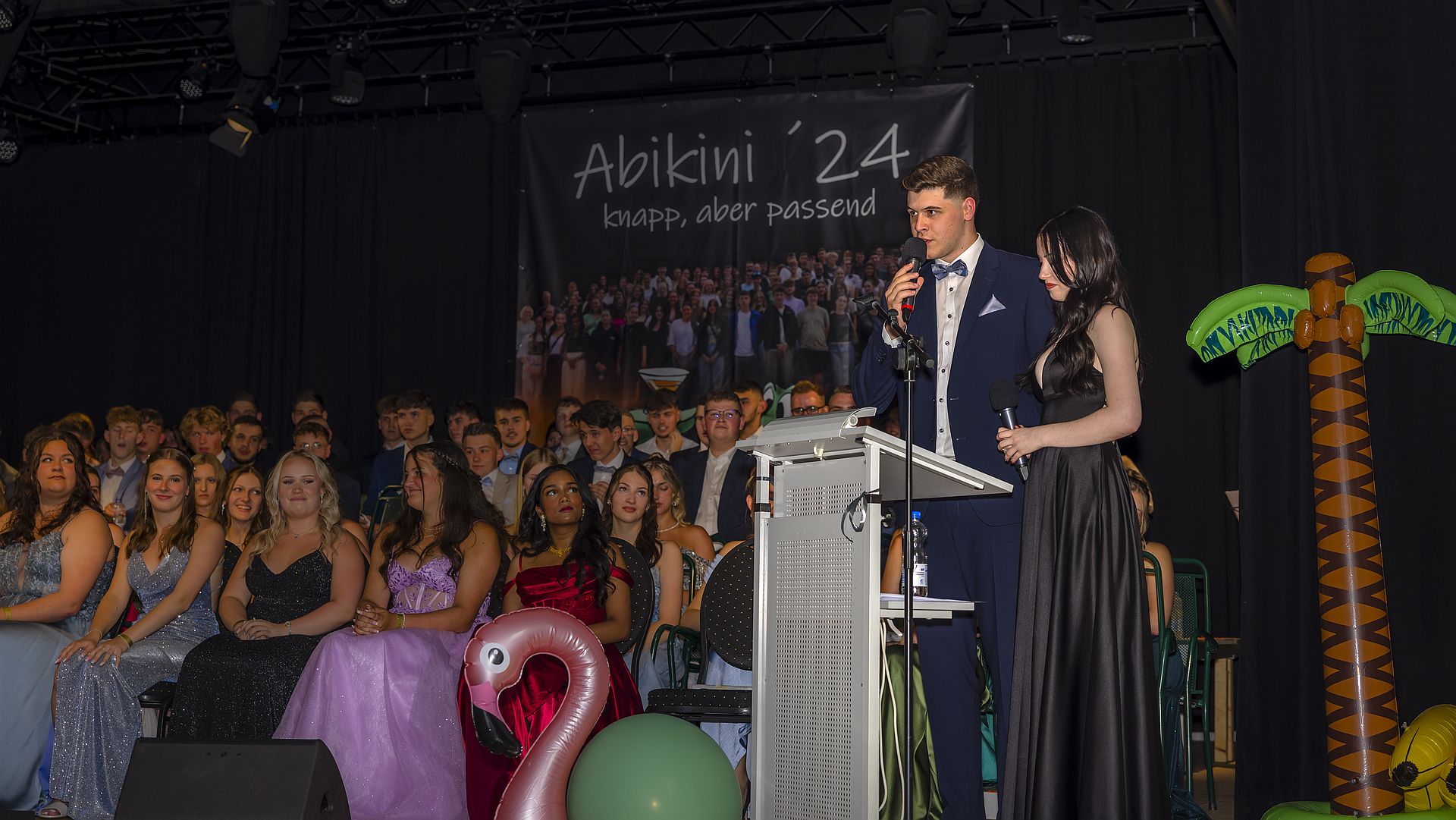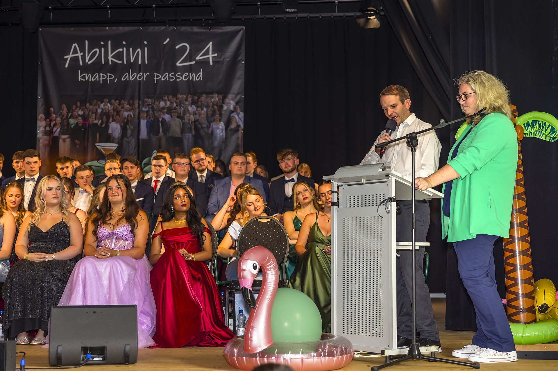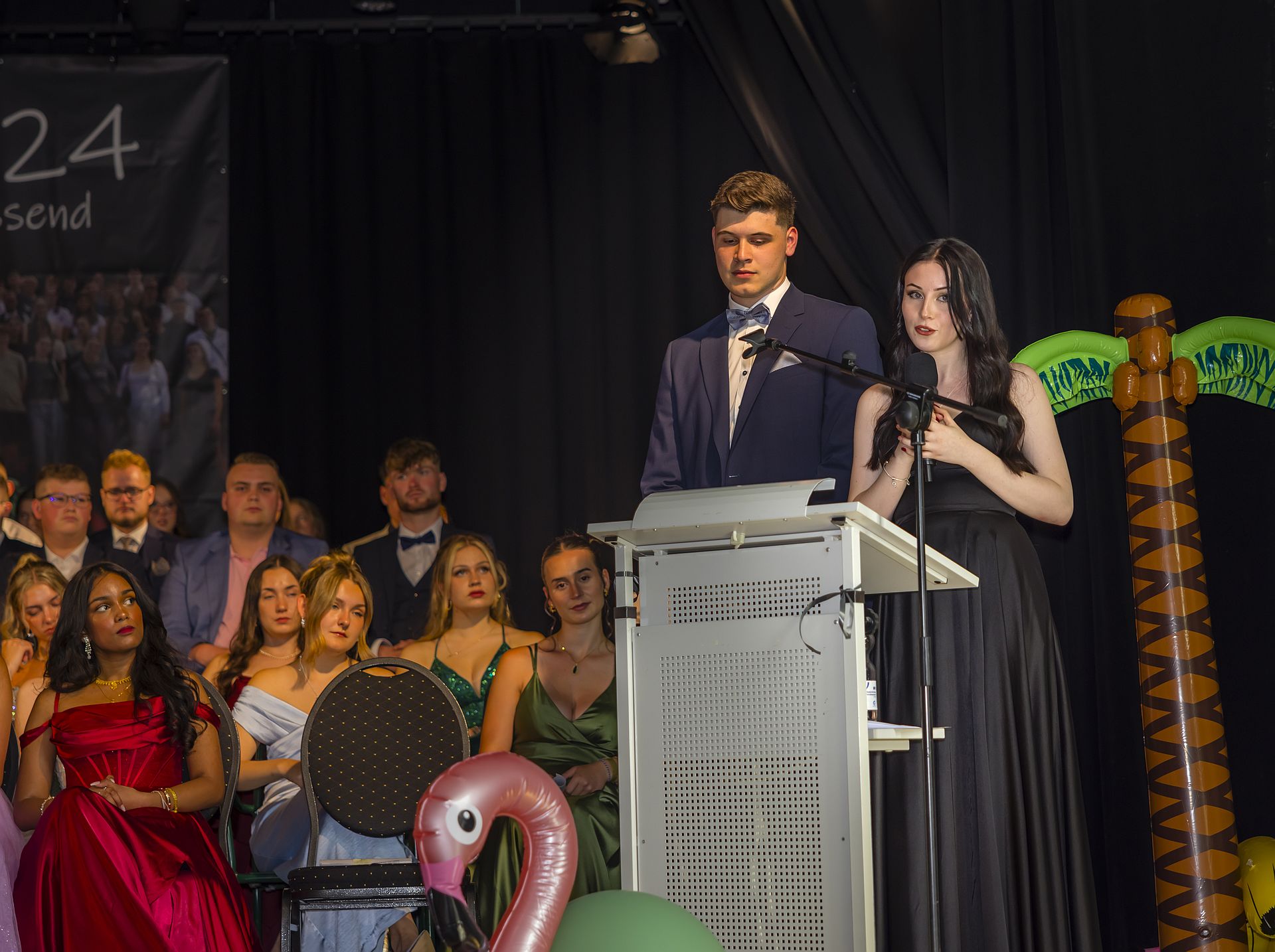 Nach einem Umzug ins Gemünder Kurhaus begann die offizielle Entlassungsfeier mit der Begrüßung durch die Moderatoren des Abends, Hannah Lenz, Abigail Müller und Gordej Kozlov, alle drei aus den beiden Abschlussklassen.