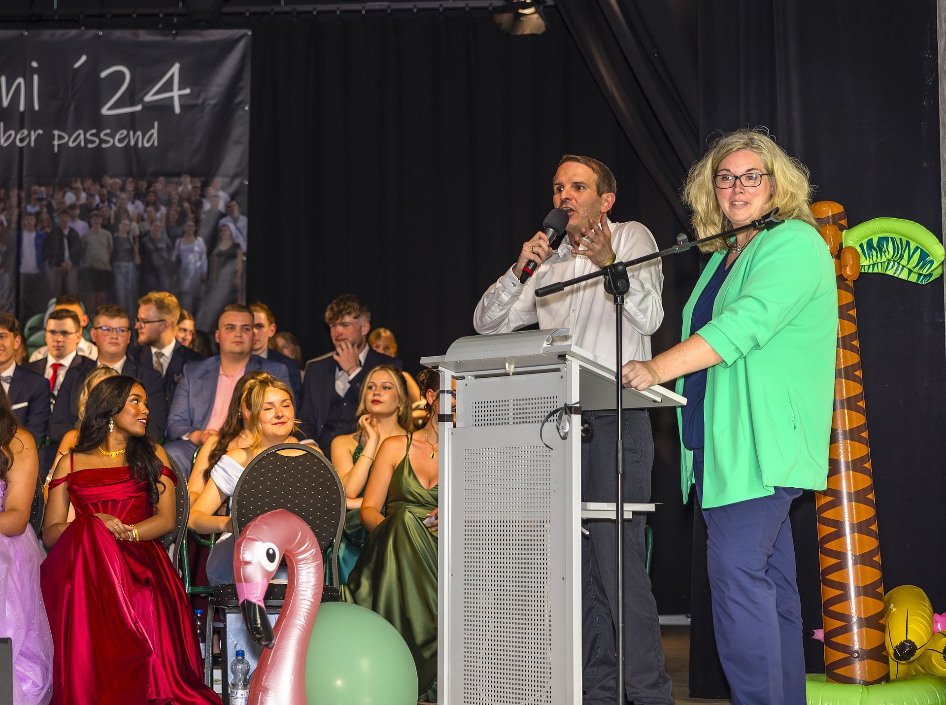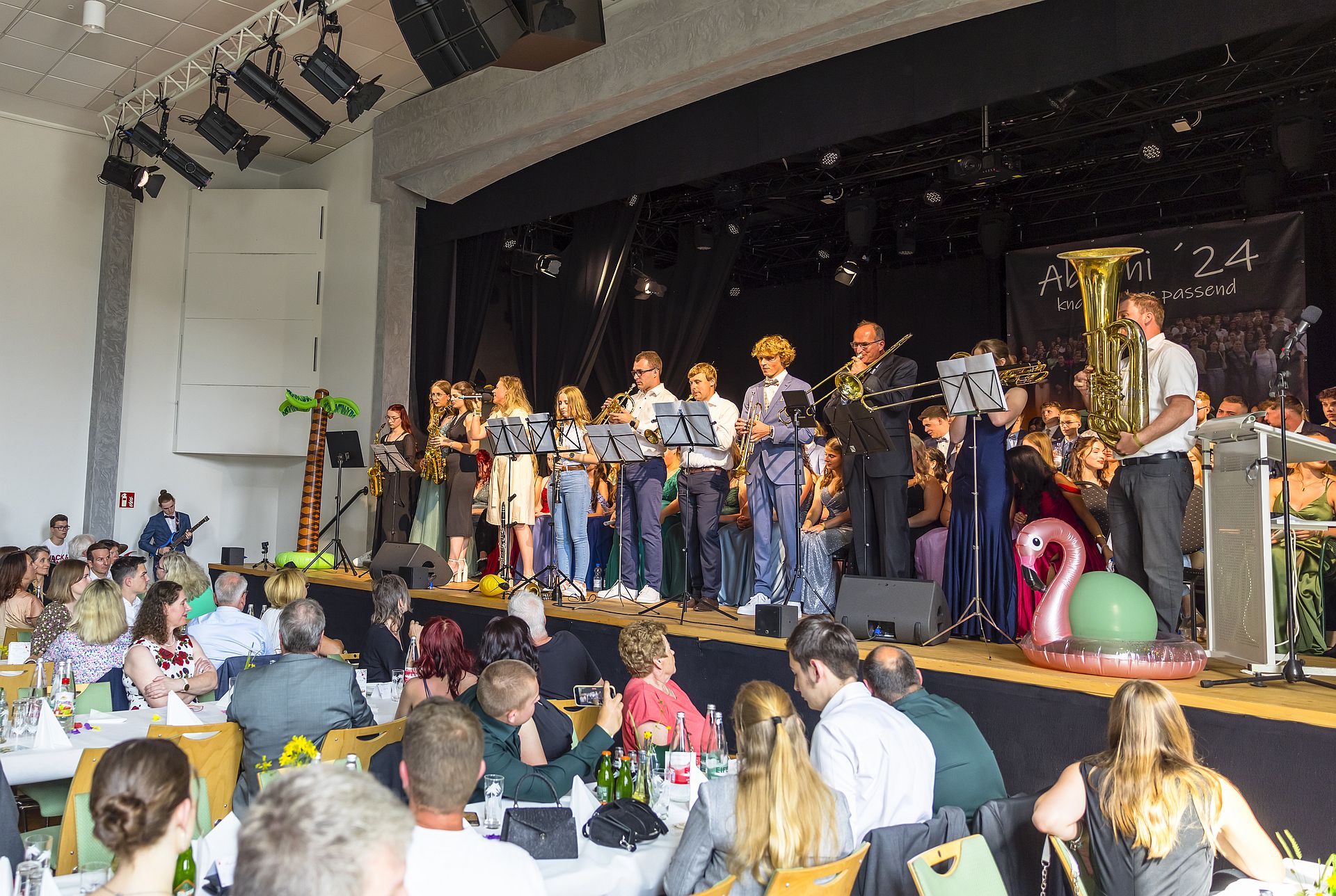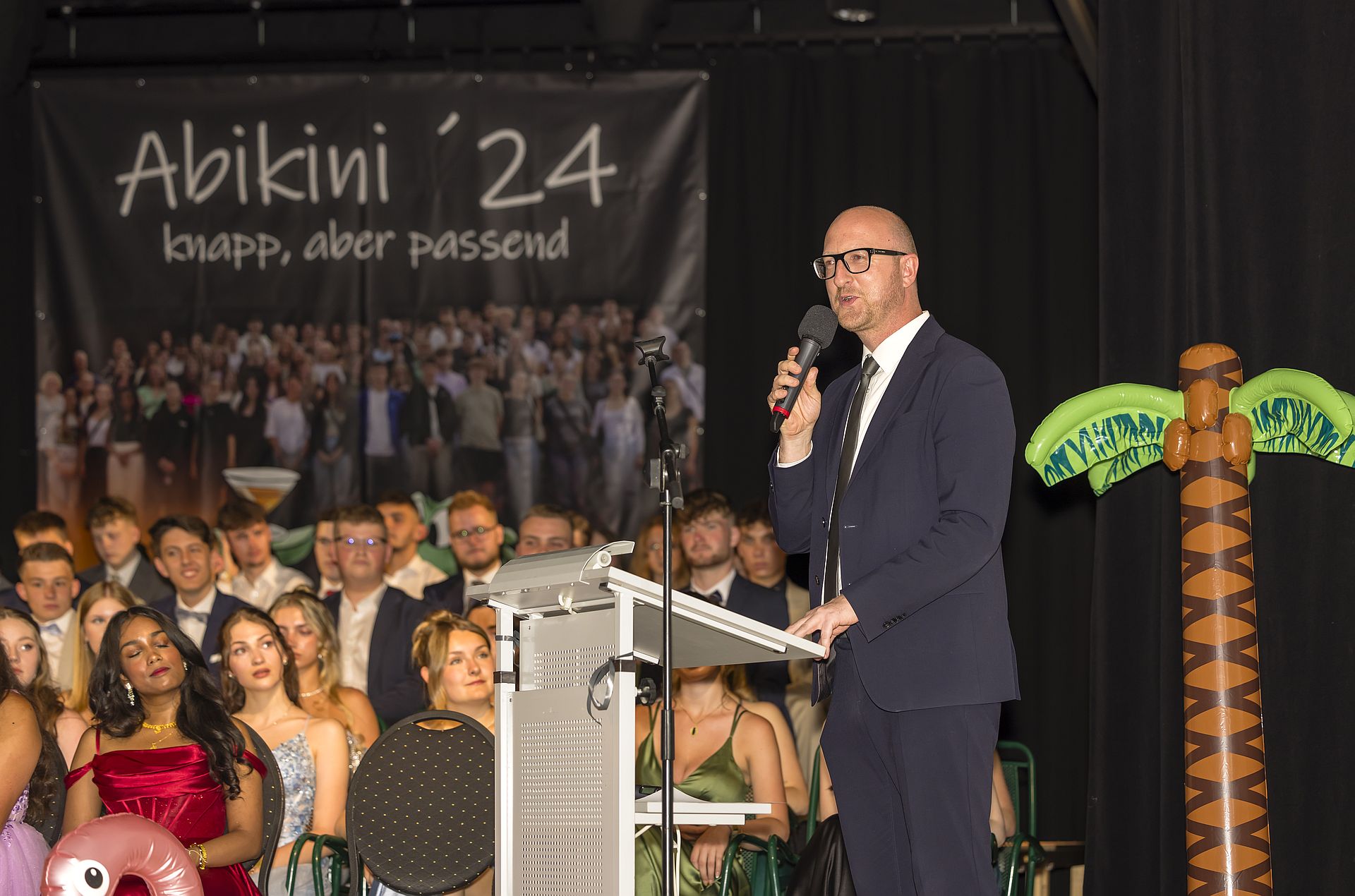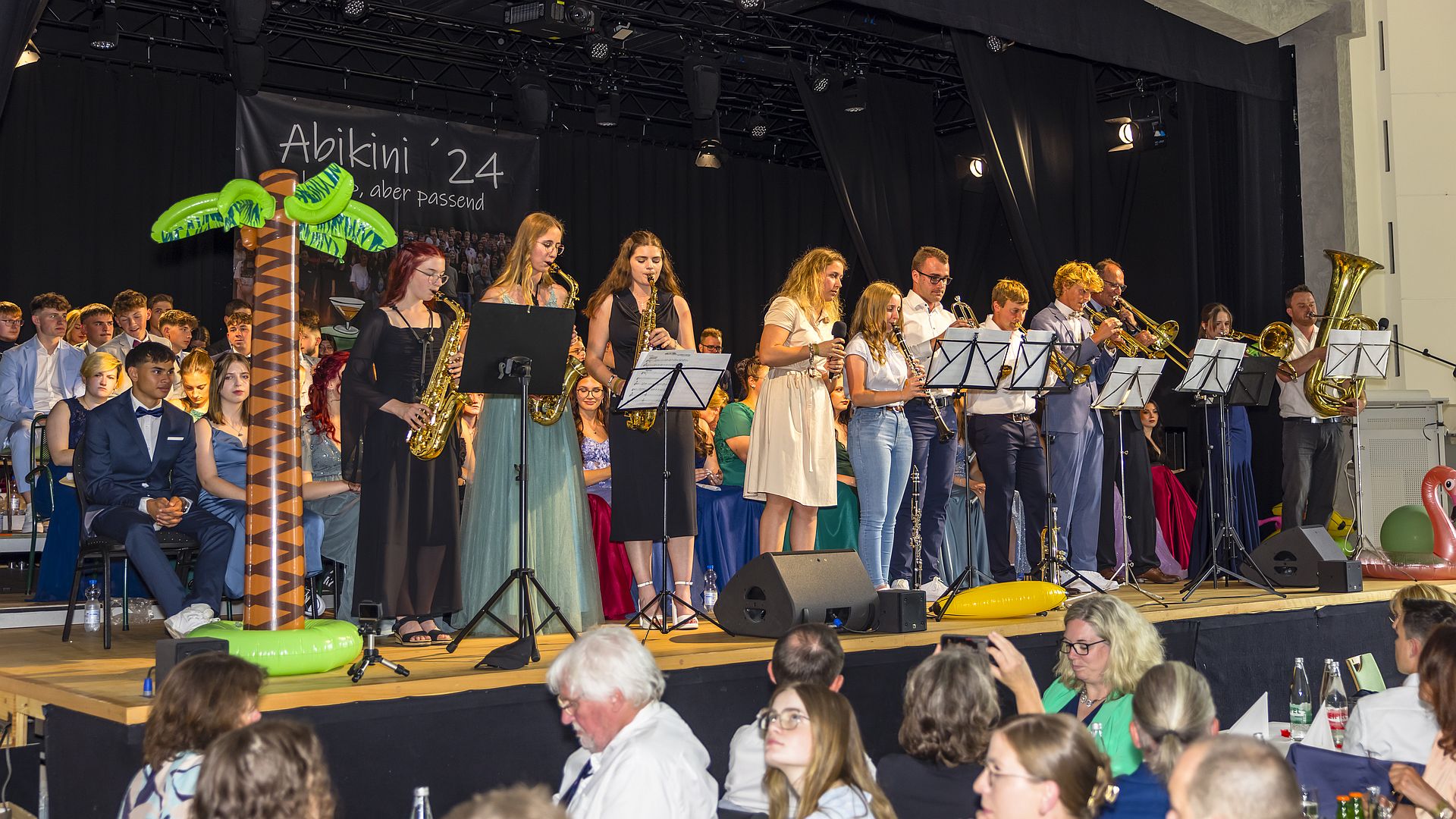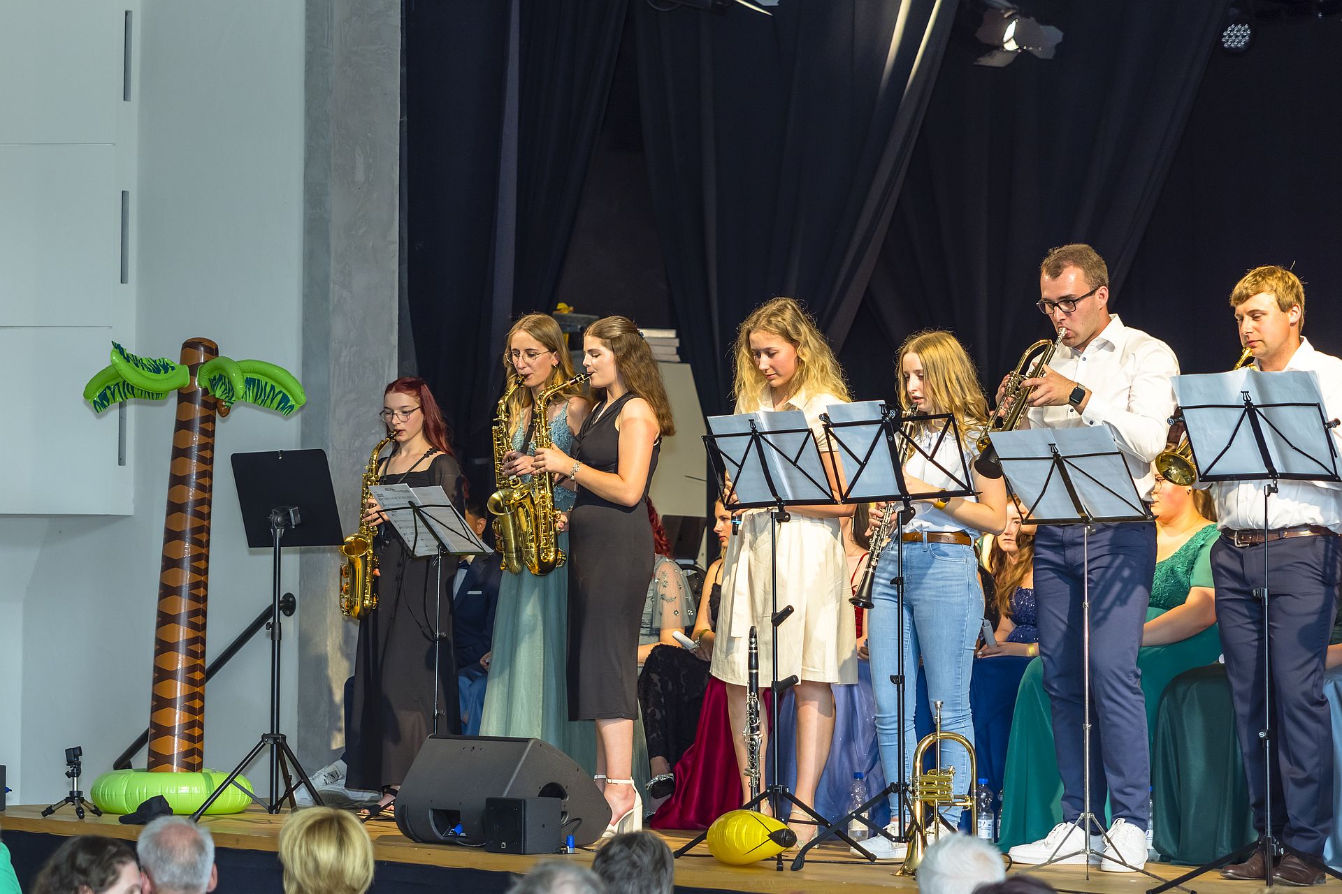Nach einem Umzug ins Gemünder Kurhaus begann die offizielle Entlassungsfeier mit der Begrüßung durch die Moderatoren des Abends, Hannah Lenz, Abigail Müller und Gordej Kozlov, alle drei aus den beiden Abschlussklassen.