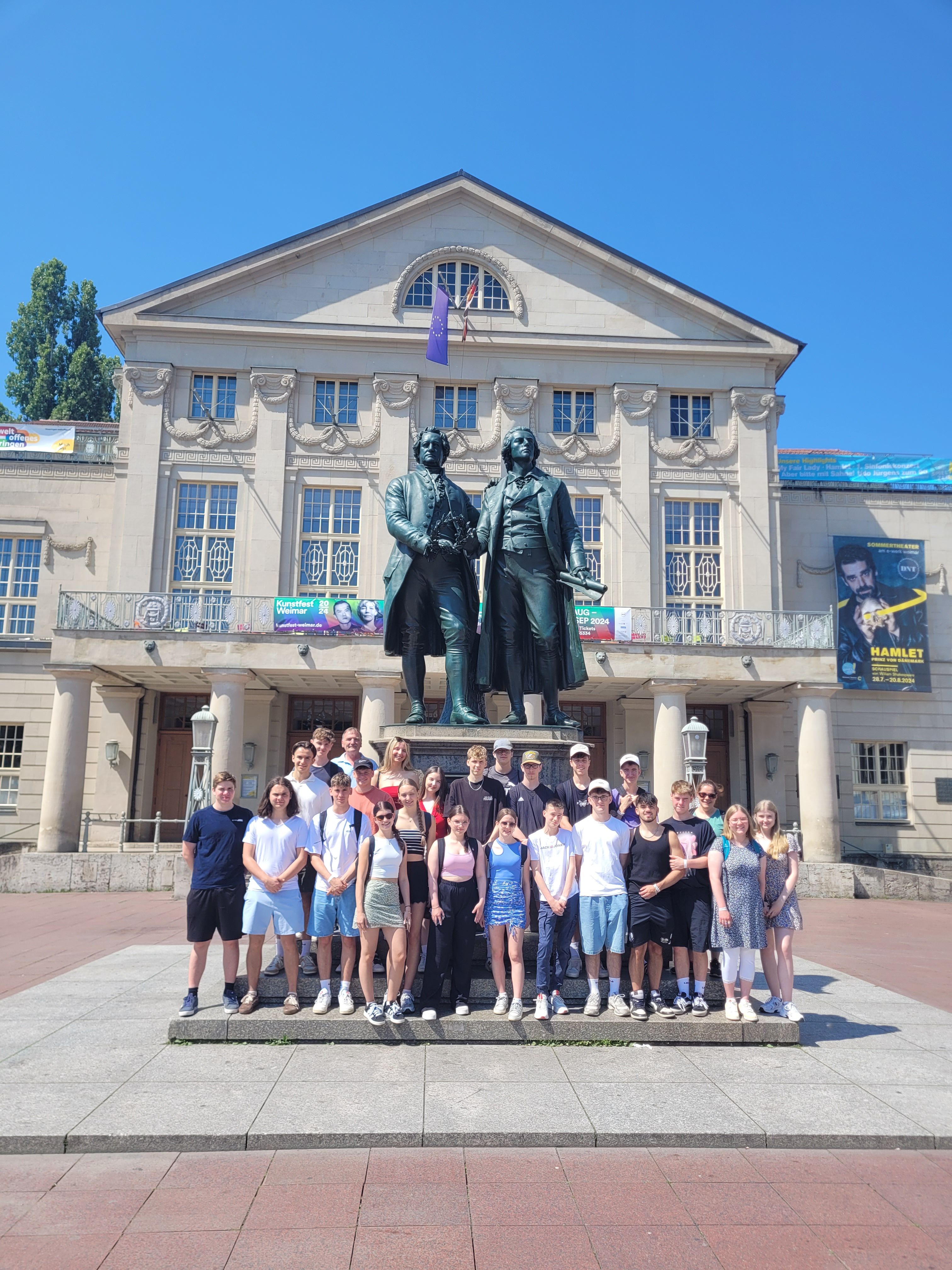 Vom 24.06.2024 bis zum 27.06.2024 war der Geschichtsprojektkurs der Q1 im thüringischen Weimar. Das Ziel war es, mehr über das nahegelegene KZ Buchenwald zu erfahren und unser gelerntes Wissen aus dem letzten Jahr einzusetzen. Gegen 8 Uhr startete die Reise an der Poensgenstraße in Schleiden und circa 7 Stunden später standen wir vor dem a&o Hostel in Weimar. Der erste Abend stand allen zur freien Verfügung und so verteilten sich mehrere Kleingruppen in der Weimarer Innenstadt, welche durchaus einen Besuch wert ist. Am nächsten Tag starteten wir gegen 12 Uhr mit dem Bus in Richtung des Ettersbergs, auf dem die Gedenkstätte des KZ Buchenwald gelegen ist. Wir begannen mit einem einstündigen Rundgang durch die Dauerausstellung und nahmen anschließend an einer dreistündigen Führung über das gesamte Gelände teil, die uns alle bereicherte. Während der Führung besichtigten wir unter anderem den ehemaligen Bahnhof des KZs, den SS-Flügel, den Appelplatz und das Krematorium. Besonders eindrucksvoll war das Eingangstor mit einer Uhr, welche die Uhrzeit 15:15 Uhr anzeigt. Dies war die Uhrzeit, zu der das KZ am 11.04.1945 befreit wurde. Auch der Schriftzug "Jedem das Seine", welcher im Eingangstor des KZs sichtbar ist, ist uns aufgrund seines unglaublichen Zynismus besonders im Gedächtnis geblieben. Darüber hinaus hat uns der Block 46, in dem die Häftlinge für pseudomedizinische Versuche missbraucht wurden, nachhaltig berührt. Nach der Führung hatten wir auch noch die Gelegenheit das Gelände in Eigenregie zu erkunden, bevor es dann wieder nach Weimar ging. Am folgenden Tag stand eine Stadtführung durch Weimar auf der Tagesordnung. Ein besonderes Augenmerk wurde dabei auf die Schriftsteller J.W. von Goethe und F. Schiller, welche wesentlich zur überregionalen Bekanntheit Weimars beigetragen haben, sowie auf die Ausarbeitung der Weimarer Verfassung von 1919 gelegt. Am Donnerstag stand nach dem Frühstück bereits die Heimreise an, so dass wir über kleinere Umwege gegen 16 Uhr Schleiden erreichten. Rückblickend war diese Fahrt für alle Beteiligten trotz der bedrückenden Thematik ein spannendes und freudiges Erlebnis, an das wir uns noch allzu lange erinnern werden.